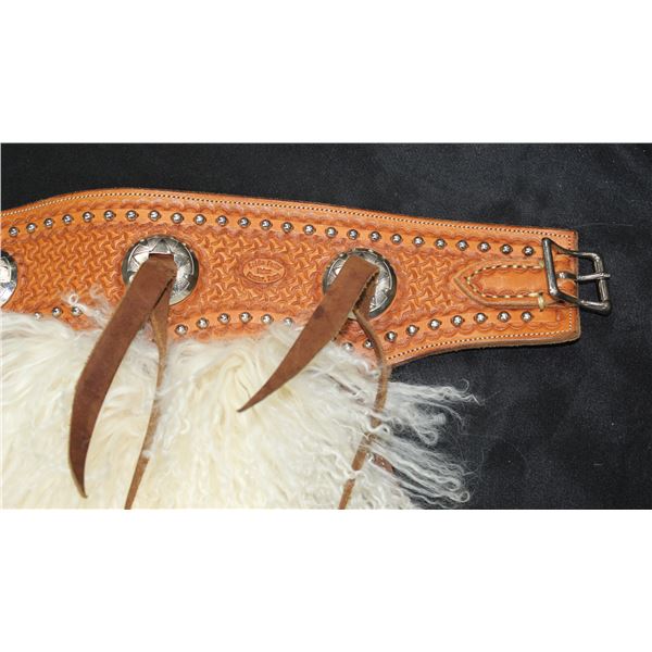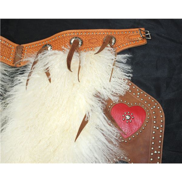 An amazing pair of batwing chaps from our beloved Buddy Foster. Displaying his terrific craftsmanship, with a combined design of white angora and oversized studded card suit wings, topped by his classicly basket stamped belt.