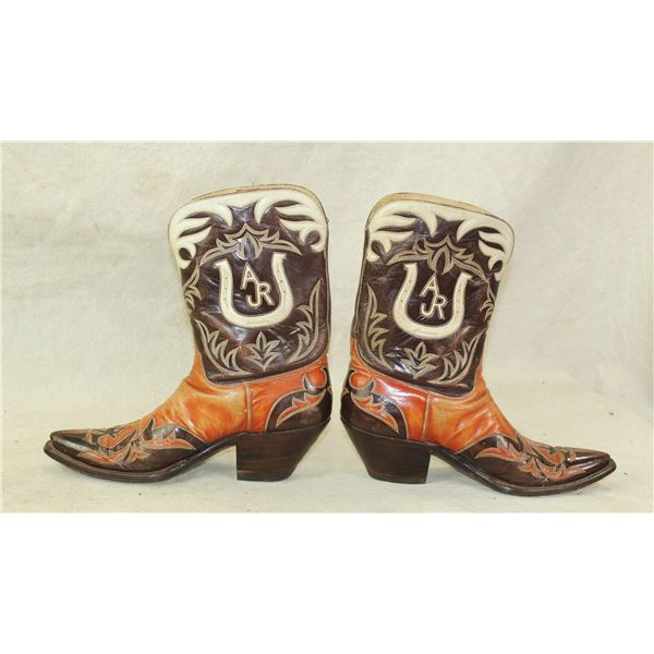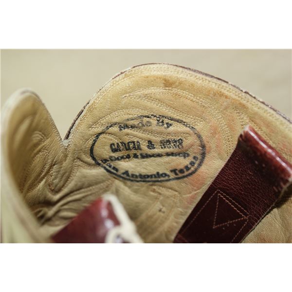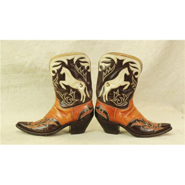 Showing incredible craftsmanship and style, these San Antonio made Garcia and Sons 1940's boots show a tri-color design of cut out rearing horses and dazzling wing tips. Approximately size 9.