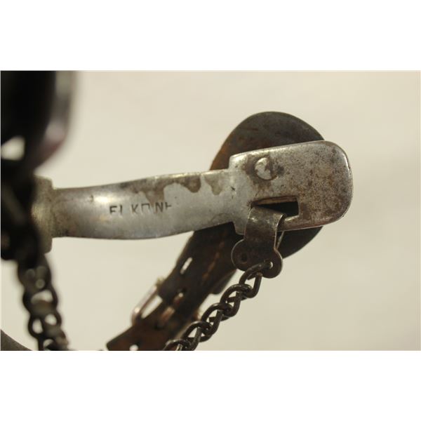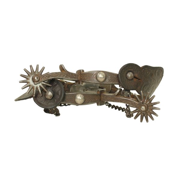 Scarce pair of large Bronco Buster pattern spurs with artistically engraved iron complimented by silver domes, and large 14 point rowels. Well marked and in nice condition.