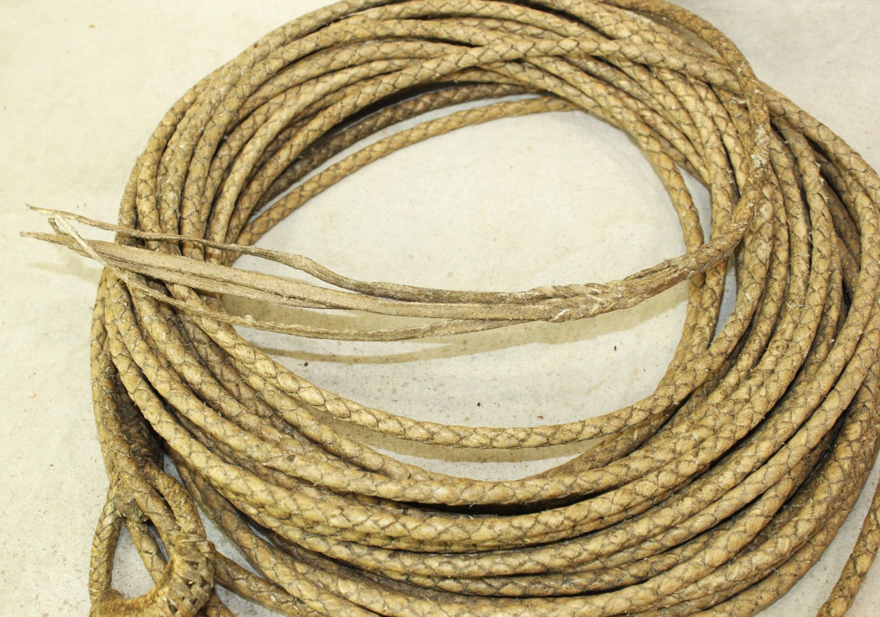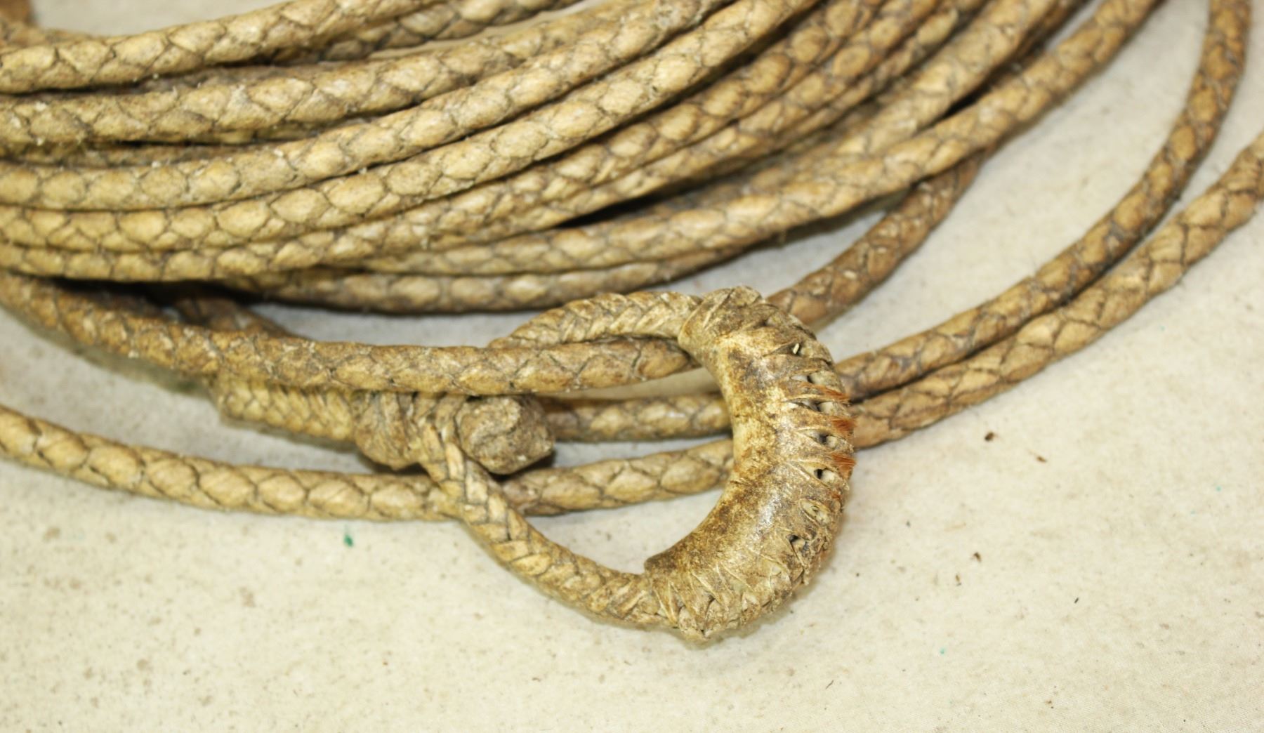 Incredibly fine four plait braided rawhide reata with beautiful aged color, appealing honda, great tails, and measuring an amazing 70ft in length.