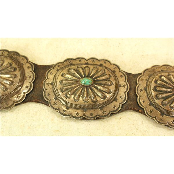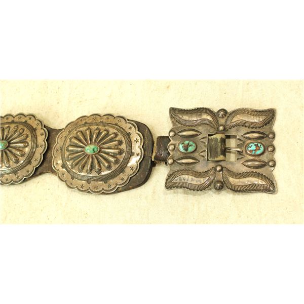 Large Native American silver concho belt with 8 mounded 3 3/4" scalloped conchos centered with tuqiouse stones all mounted on leather, and finished with a wonderful decoratively shaped rectangular buckle.