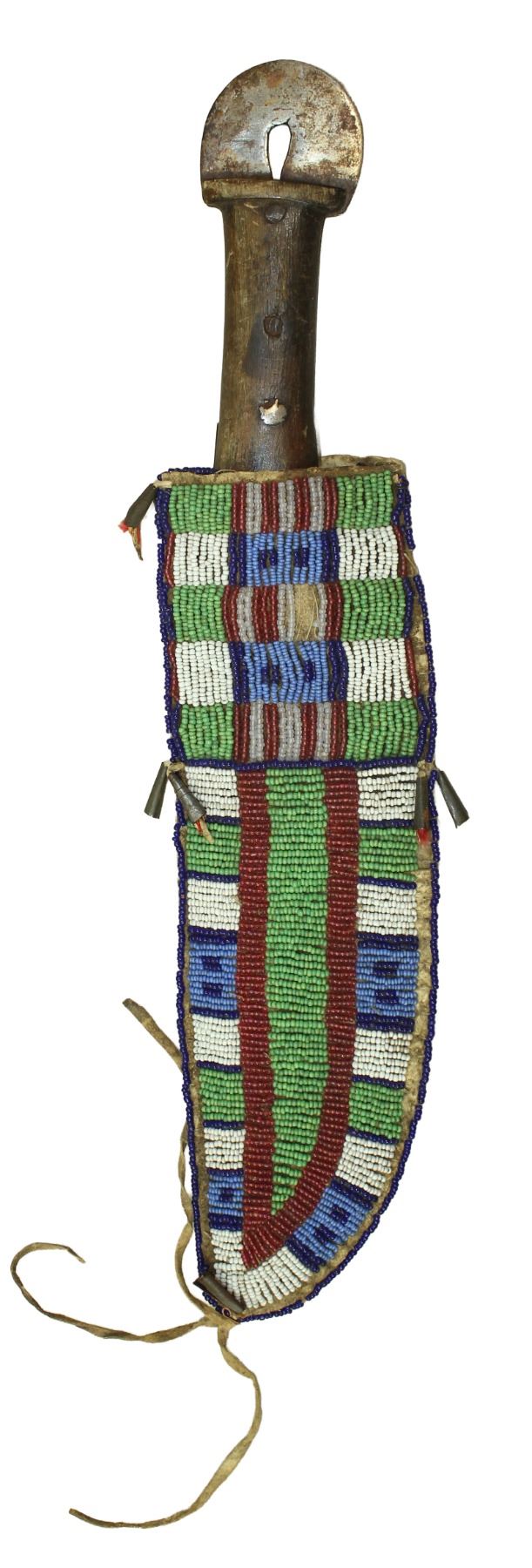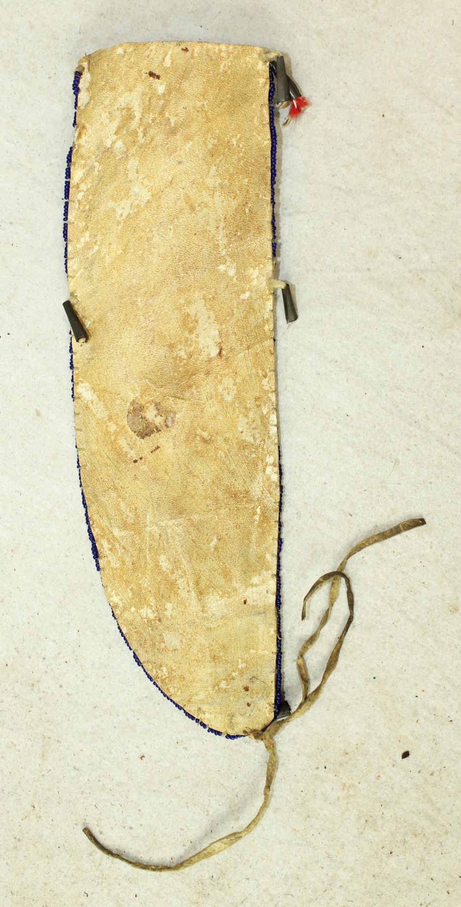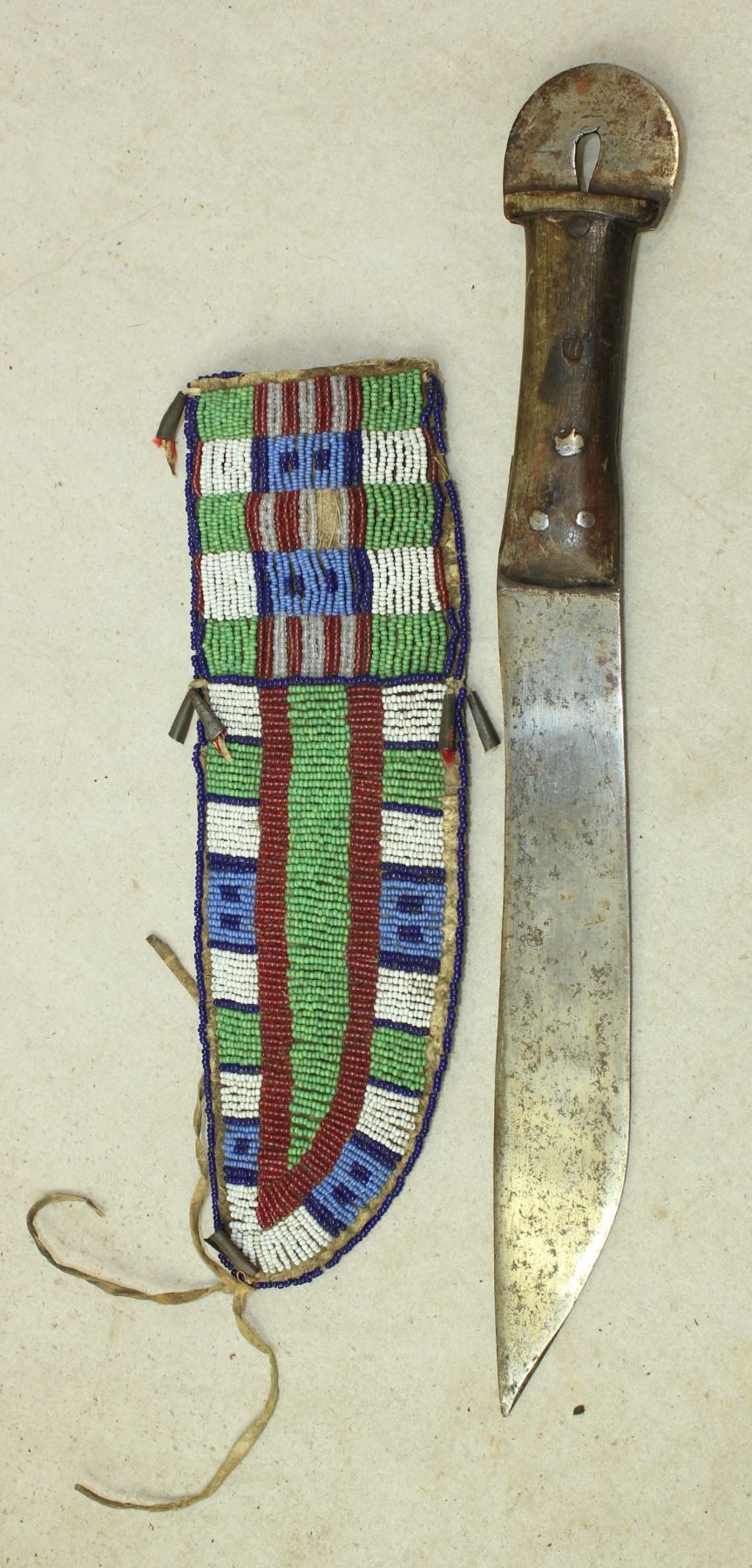 Large Blackfoot beaded knife sheath with wonderful full coverage pattern of early beads, completed by a great knife that incorperates a hide scraper into the end of the handle. Sheath measuring 11"x 3 1/2".