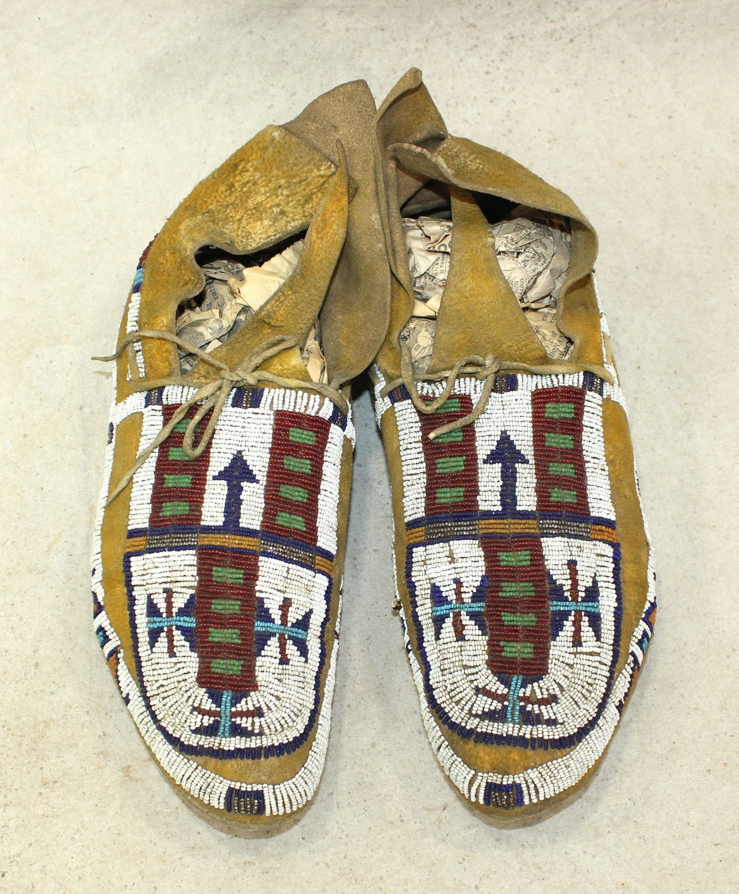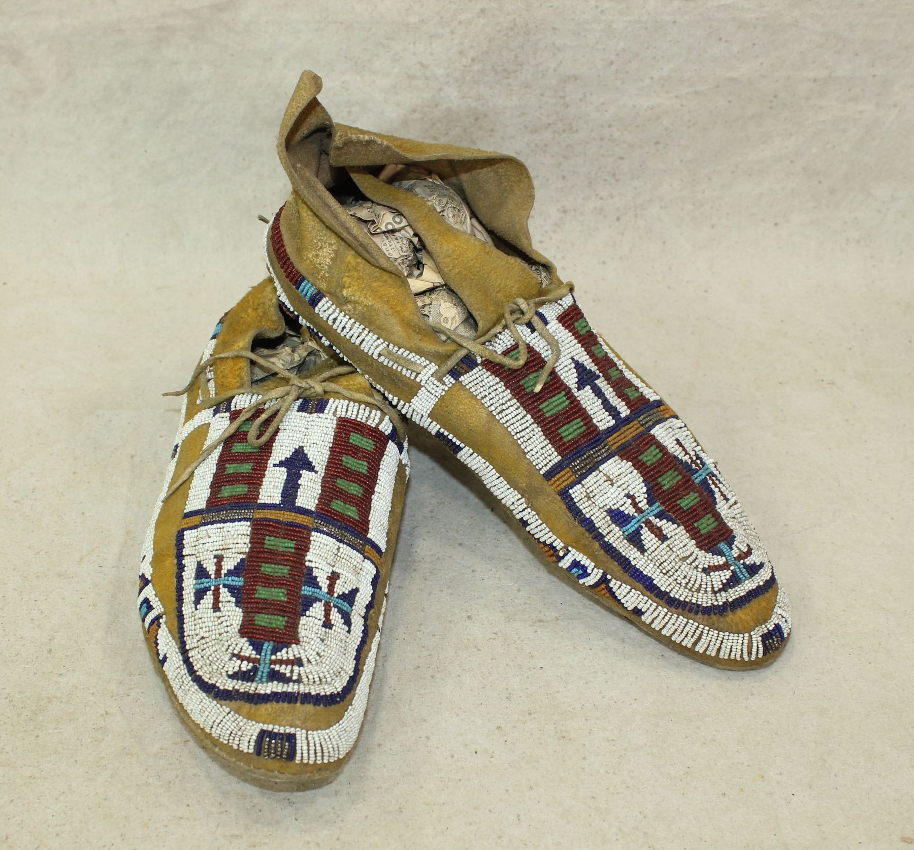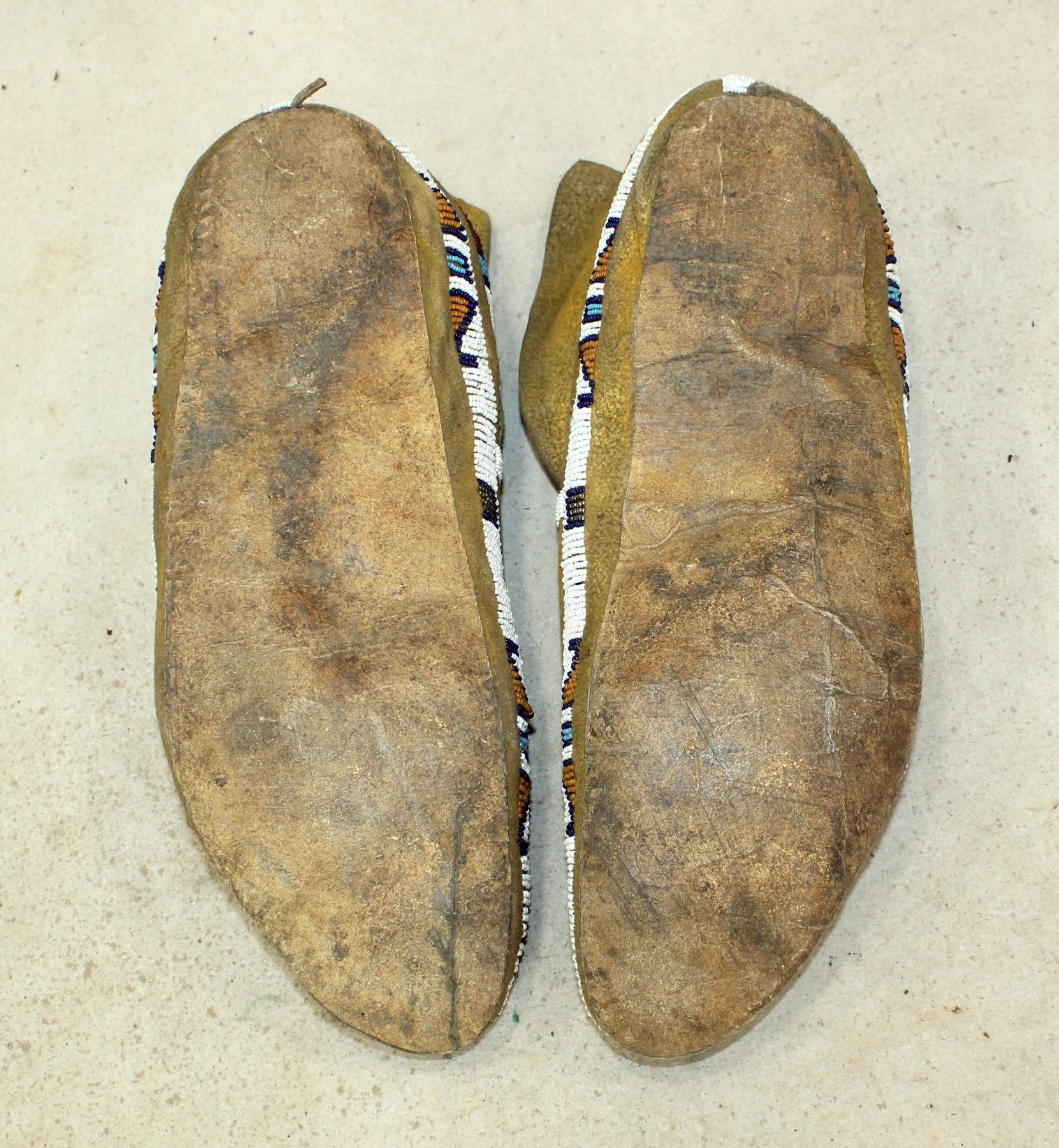 very attractive, and above average Southern Cheyenne moccasins.The brain tanned uppers are rubbed in yellow ochre, with geometric beaded colored patterns on a white field. Typical rawhide soles with age consummerate wear.. Nice display size and still nice and supple. Circa 1880's.