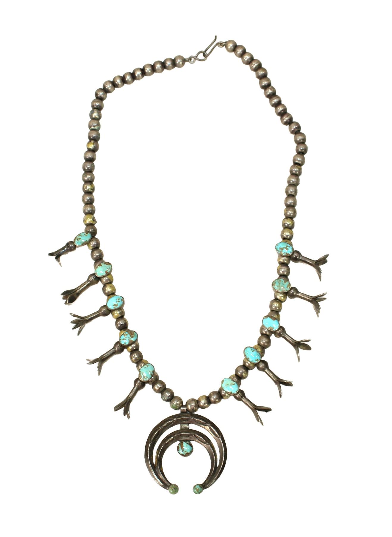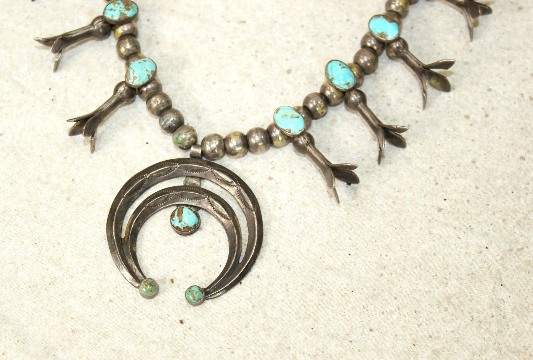 Fine sterling silver "Old Pawn" squash blossom necklace with artistic silver blossoms, beads and naja, accented by richly colored turquoise.