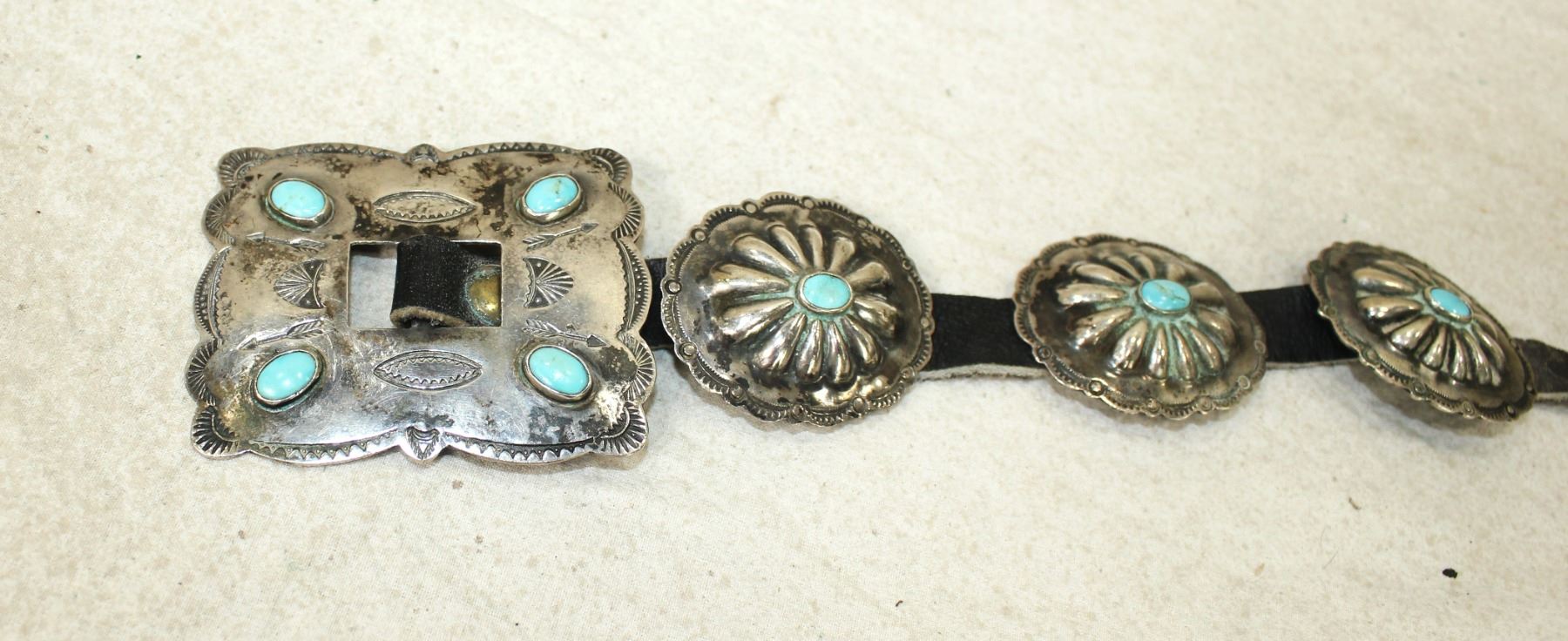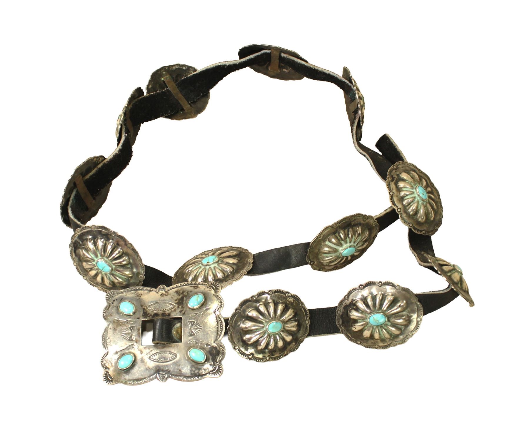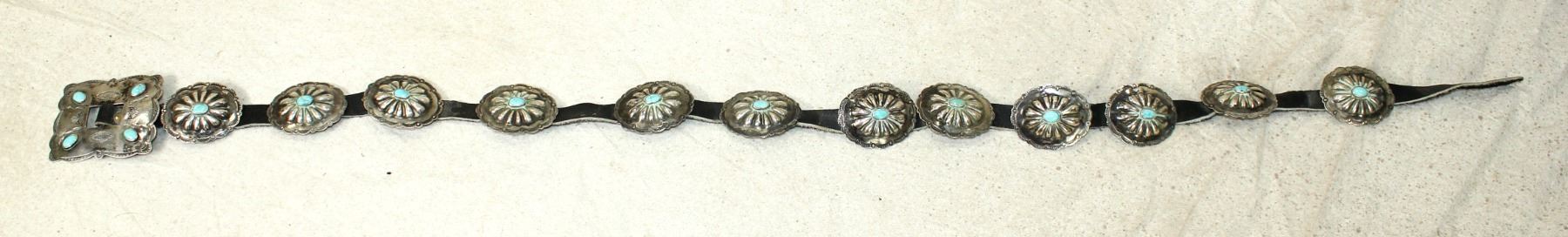 A nice old sterling silver concho belt with 12 scalloped 1 1/2" turquoise centered conchos highlighted by a showy square buckle with great design.