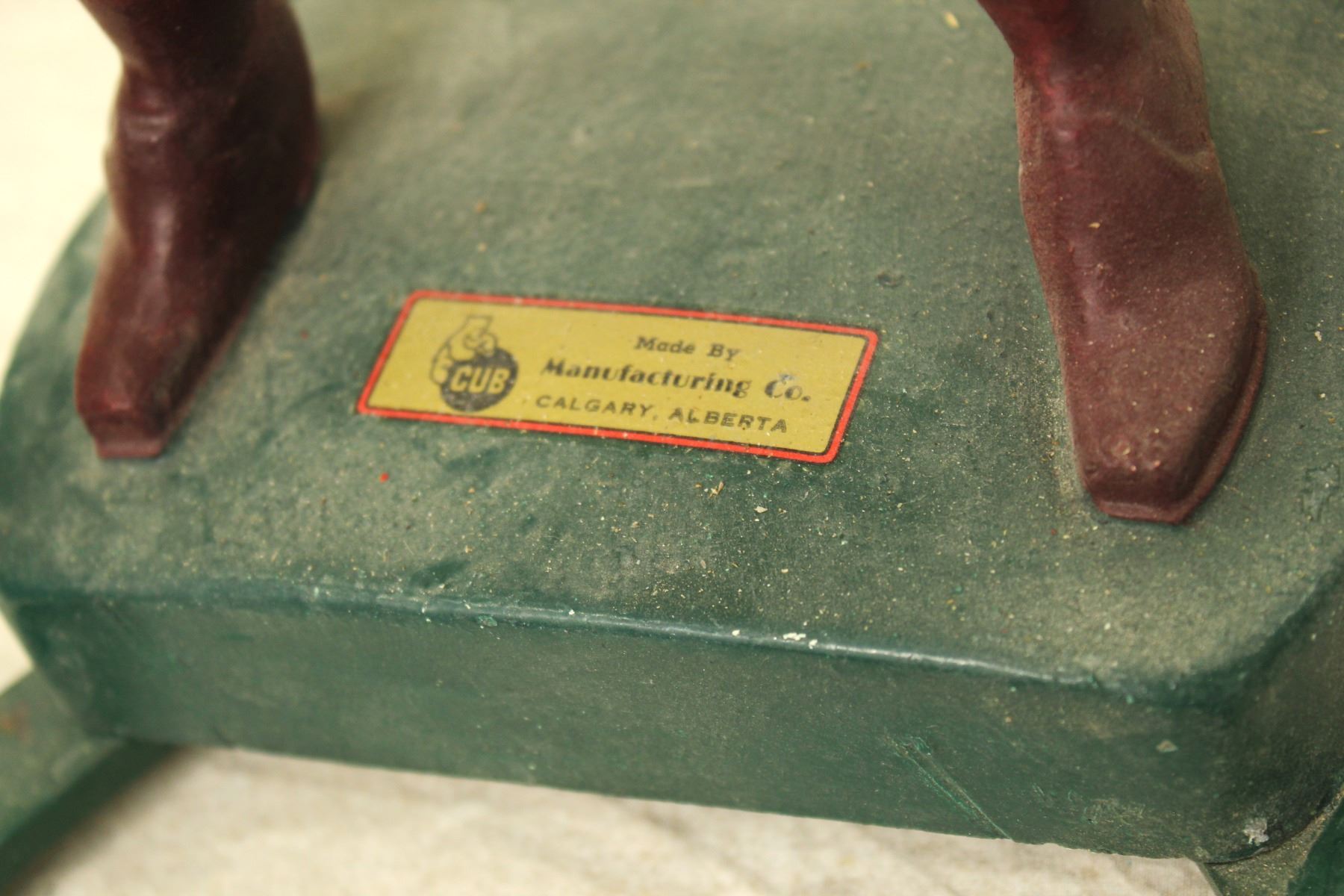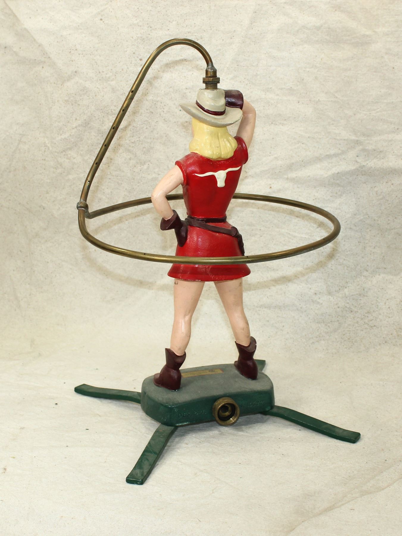 Terrific vintage cast metal lawn sprinkler fasioned as a stylish cowgirl twirling a rope. Dimensions 18"x 12".