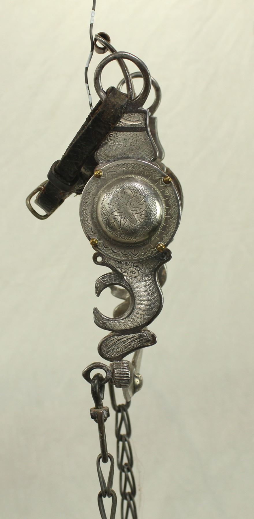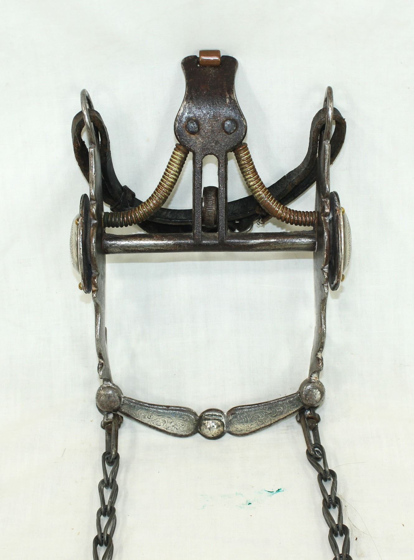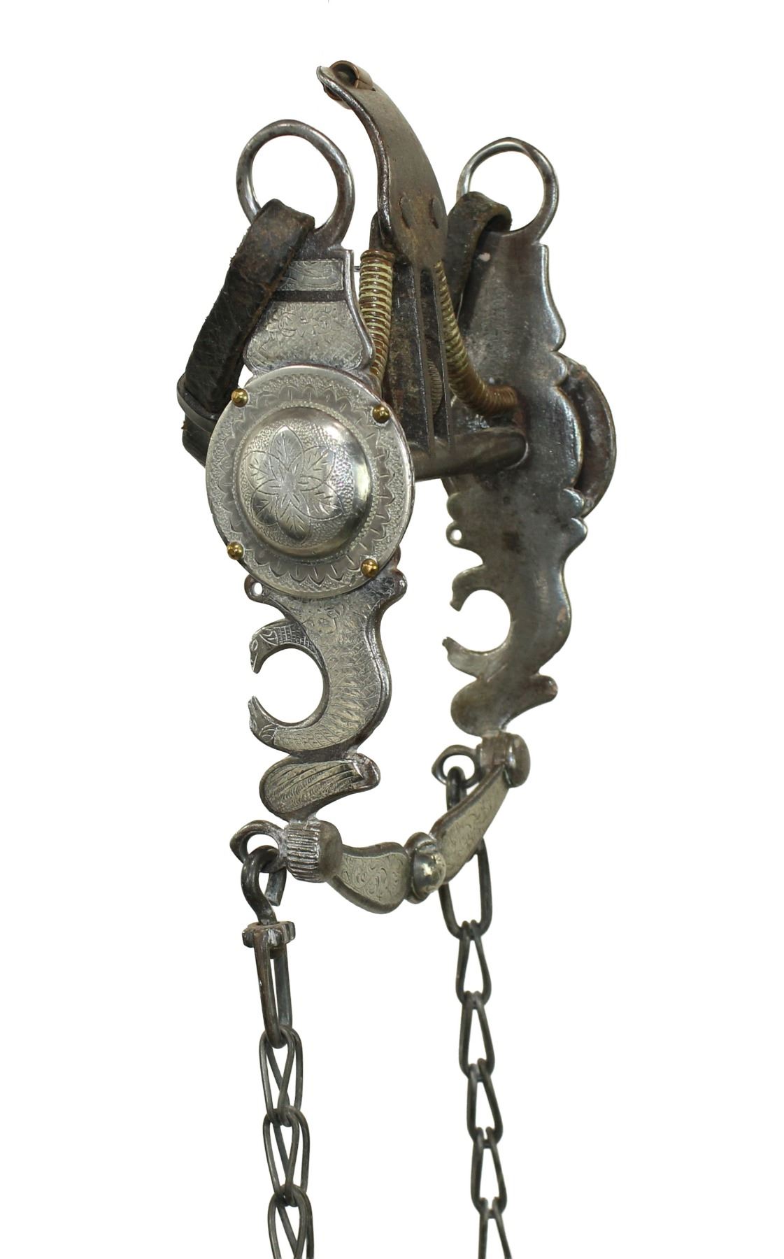 Super nice kissing bird cheek with exceptionally engraved silver and iron, oversized concho, and finished by great spade mouthpiece.