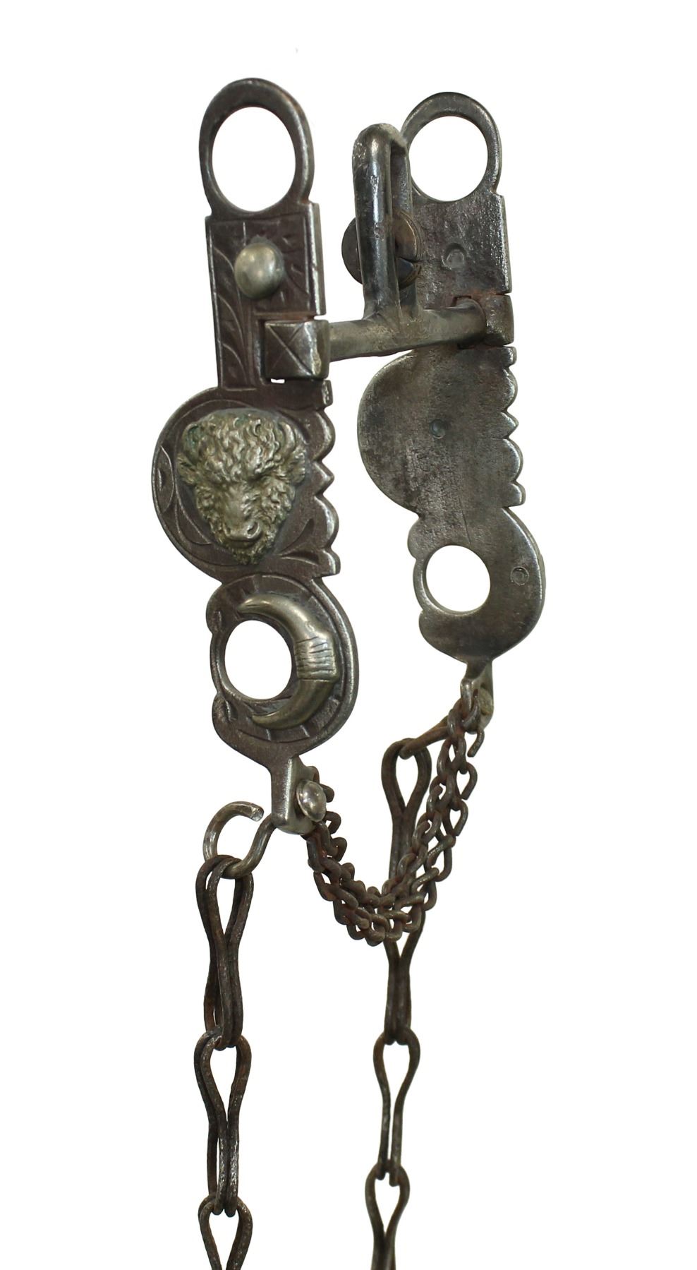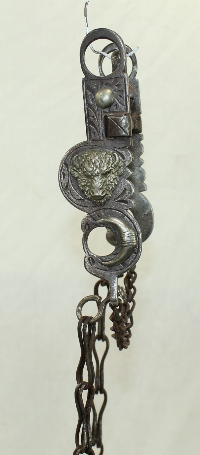 Extra clean chased iron tall halfbreed bit mounted with three dimensional buffalo heads and horns. Showing nice condition and eye appeal.
