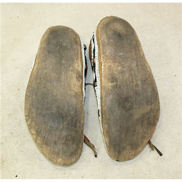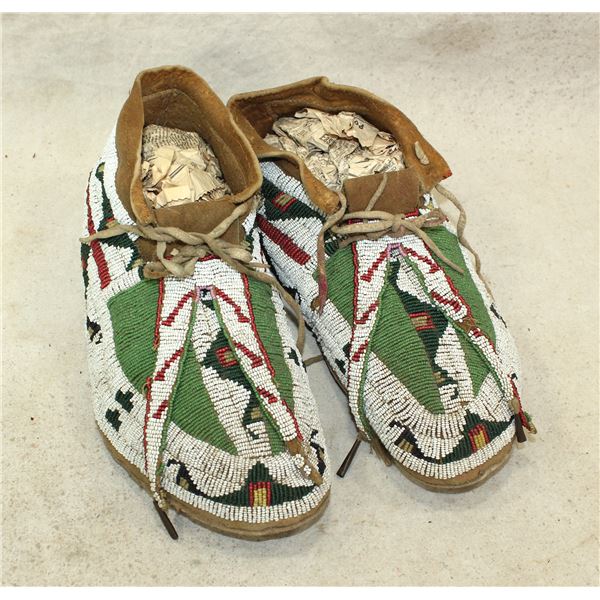 Wonderful large Northern Plains moccasins, fully beaded with uncommon green focal color, biforcated tongues, and buffalo track design.