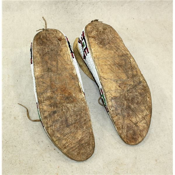 A large pair beautifully beaded sioux moccasins on brain tanned hide, with unique toe pattern on white background.