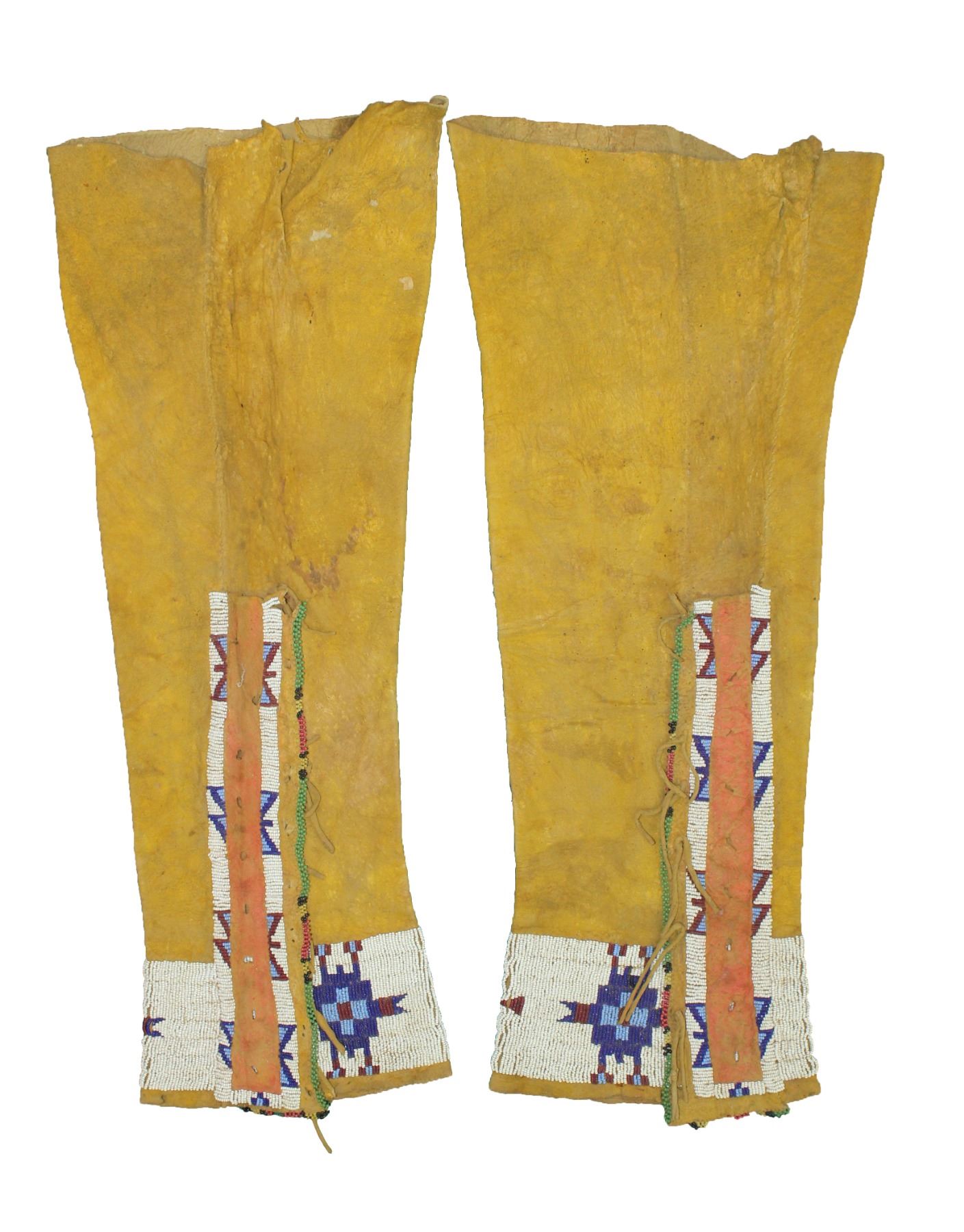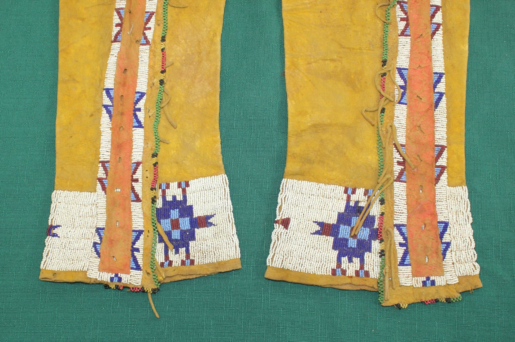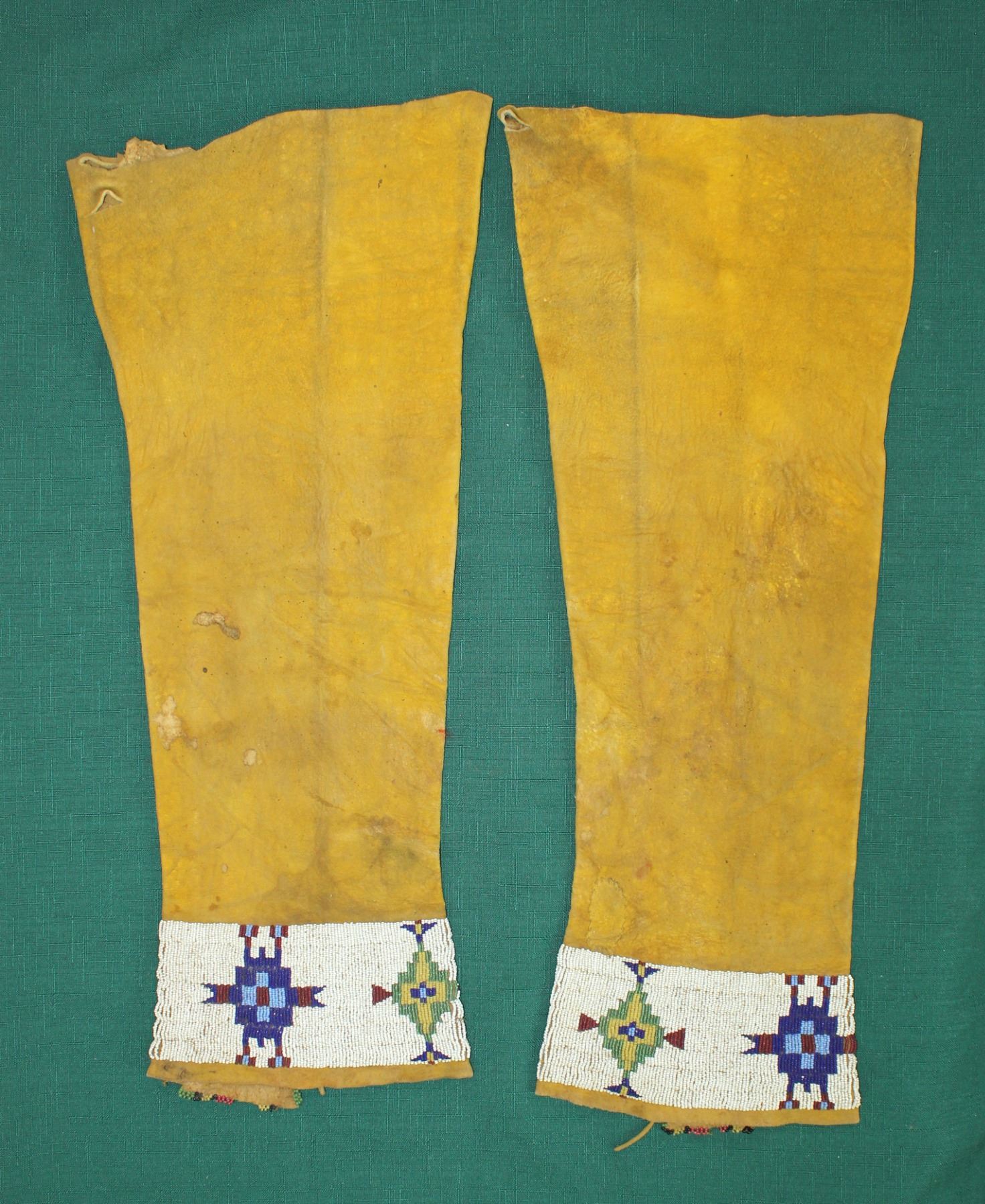 Mens size 19th century Native American hide leggings, displaying great yellow ochre color, and trimmed with attractive early beaded pattern.