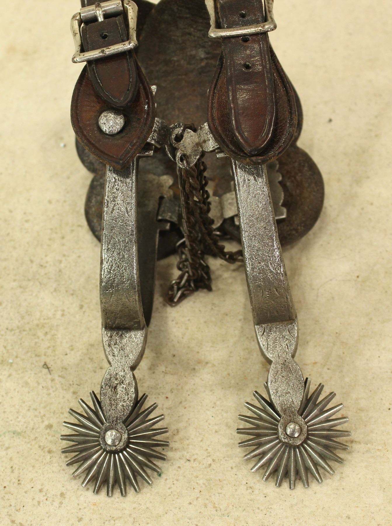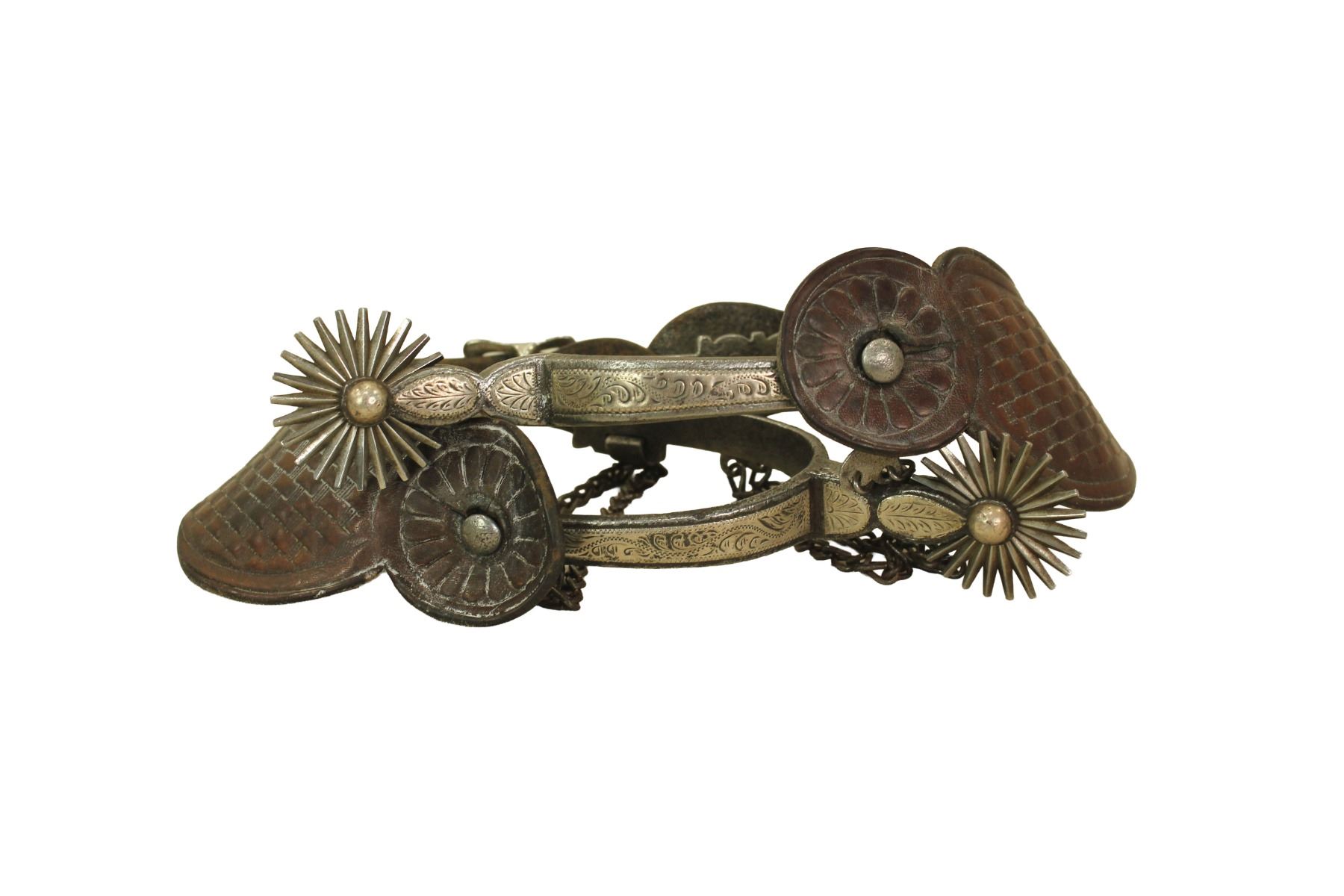 Classy pairof single mounted Buerman spurs with great engraving, shaped shanks, dazzling multi-point rowels and chased iron off-sides. Completed with original straps.
