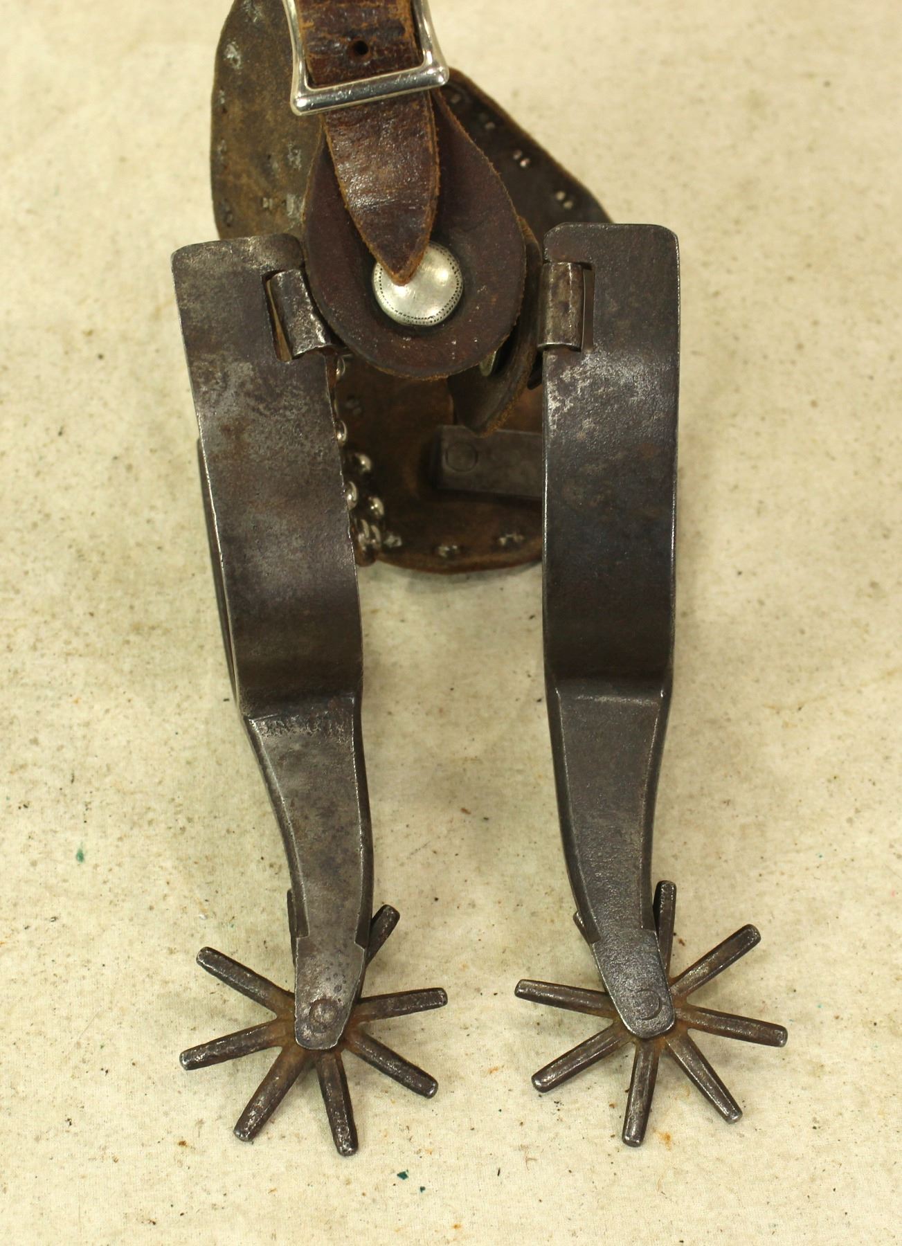 Very popular single mounted Four Heart pattern spurs with two-tone design, swinging heart buttons, and studded period straps.