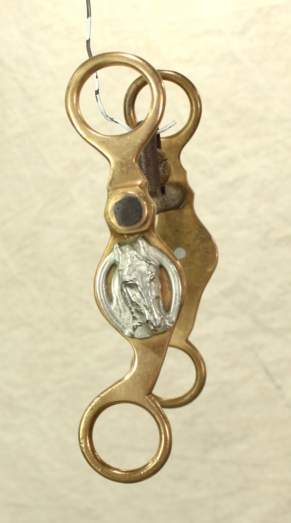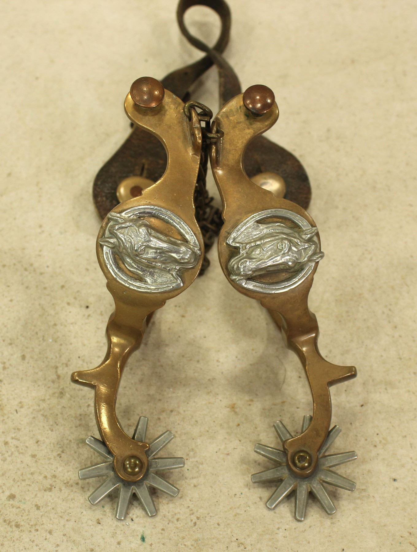 A highly collected set of August Buerman Hercules bronze spurs and matching bit with three dimensional horsehead motif.