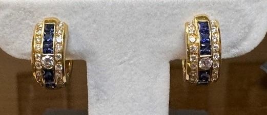 Ladies 18k yellow gold and sapphire hoop earrings with hinged closure. Each earring is bezel set with one natural round brilliant diamond. The diamond is SI1 clarity and F color. The total diamond weight is .14ctw. On each side of the diamond is a row of ten channel set natural round brilliant diamonds, which are SI1 clarity and F color with a total weight of .30ctw. Channel set down the middle of each earring is a row of six 2.5mm natural princess cut sapphires. DSC FOUNDATION THANKS JENNIFER REFFALT FOR THIS 100% DONATION.