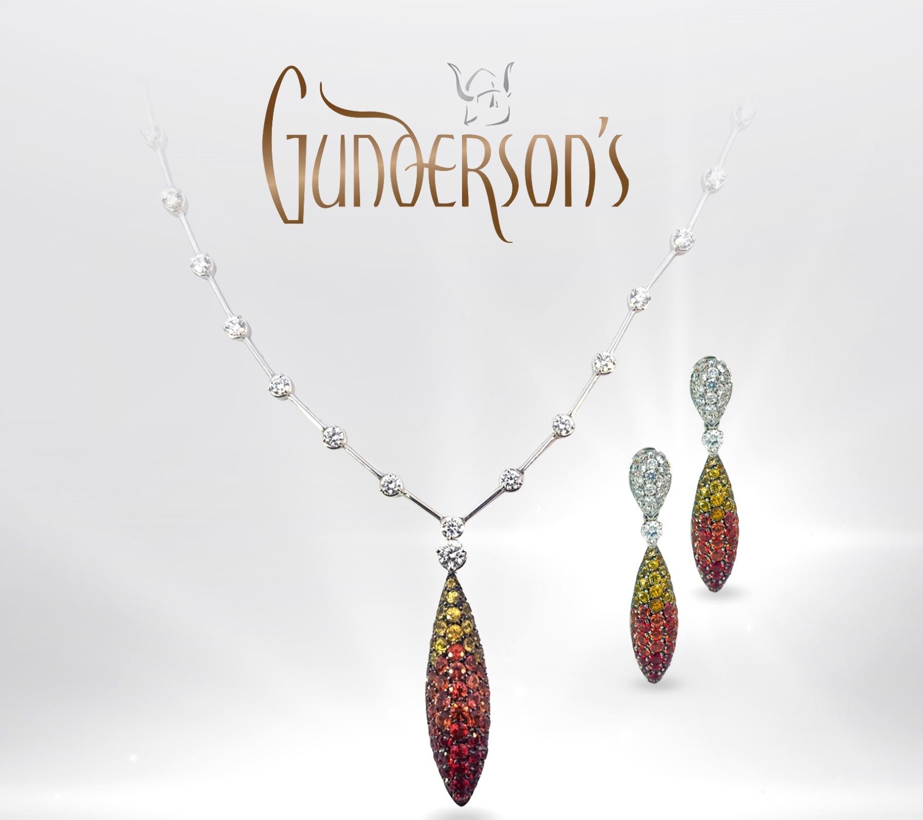 Ignite the night with this breathtaking necklace and earring set by Italian designer Picchiotti, a dazzling donation from Gunderson's Jewelers. The necklace features 26 brilliant diamonds, leading to a captivating teardrop pendant that radiates in a sunset spectrum of yellow, orange and red sapphires. Coordinating drop earrings mirror the design with diamond encrusted teardrops, delicate diamond accents and vibrant sapphire drops that echo the necklace's fiery charm. This set is a stunning celebration of color, craftsmanship and elegance designed to turn heads and capture hearts. DSC FOUNDATION THANKS GUNDERSON'S JEWELERS FOR THIS 100% DONATION. Breanne Demers, breanne.demers@gundersons.com, 712-255-7229.