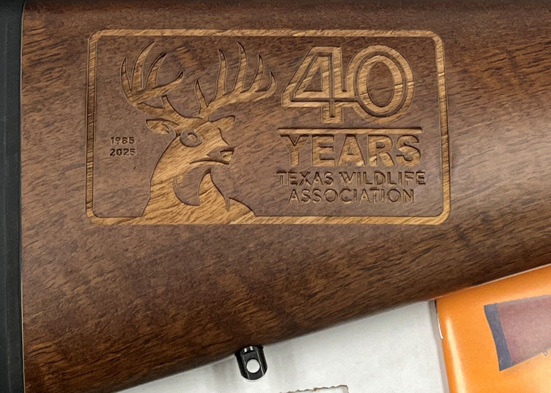 What makes this rifle truly one-of-a-kind is the custom-engraved Texas Wildlife Association 40th Anniversary logo in the stock, making it a collector’s piece and a lasting symbol of support for Texas land, wildlife, and hunting heritage.