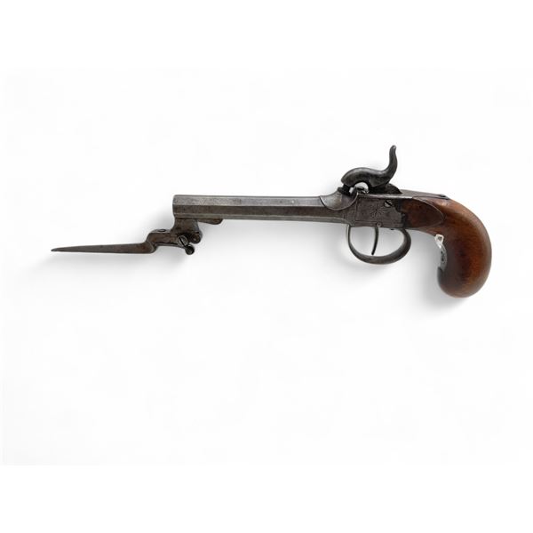 Smooth Bore Percussion Cap Pistol 4" Barrel Wood Grips With Folding Bayonet, Antique. Made in Belgium. You must be over 18 years of age to purchase this item; no license required as this is an antique.
