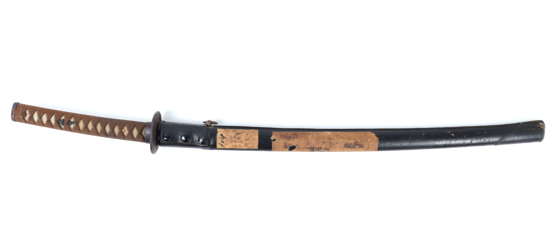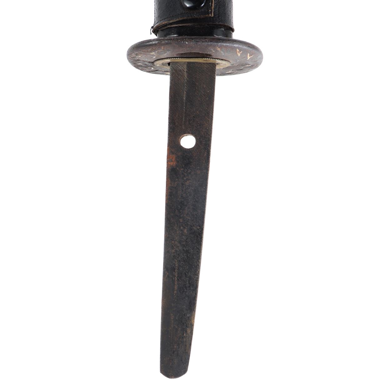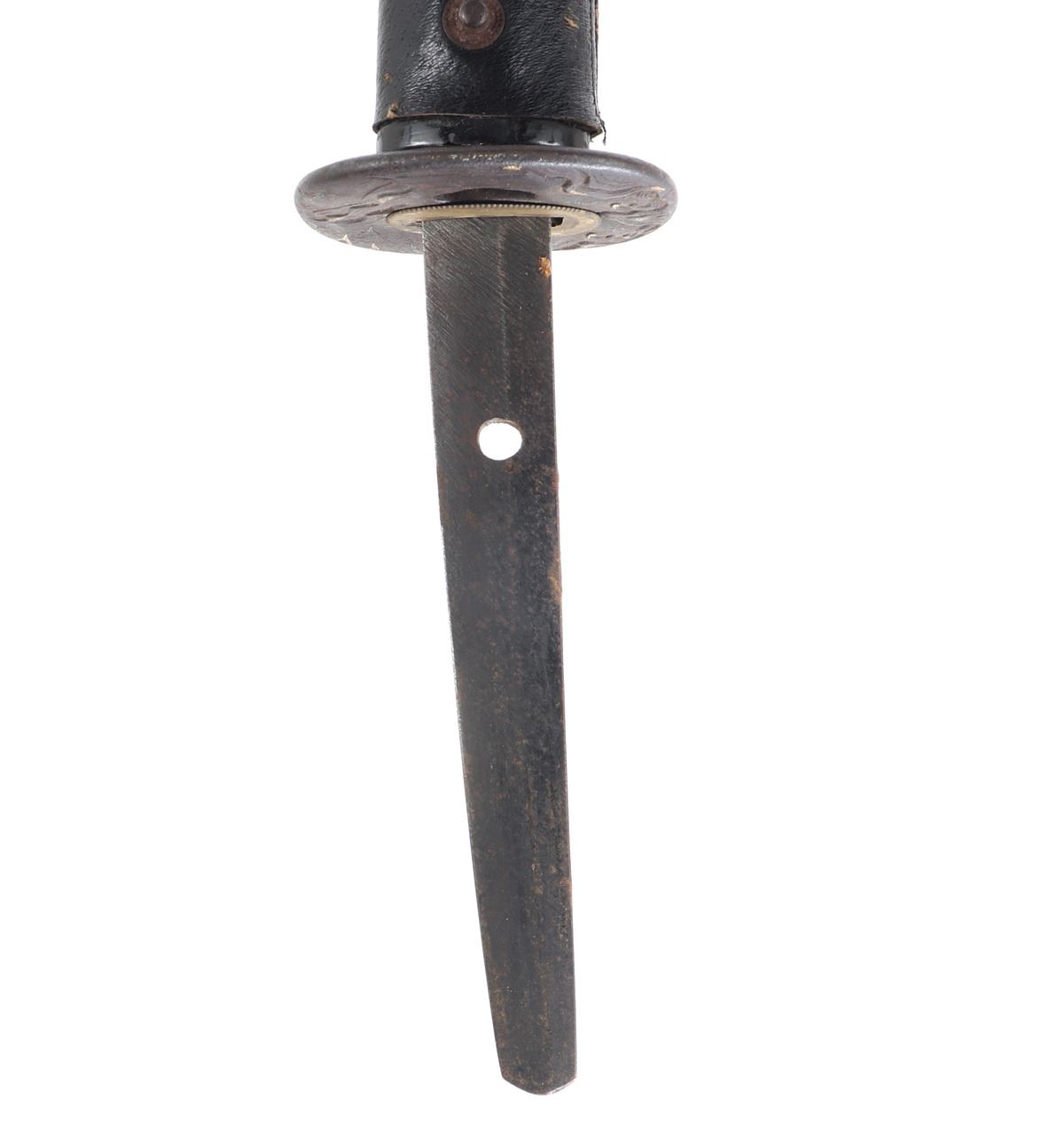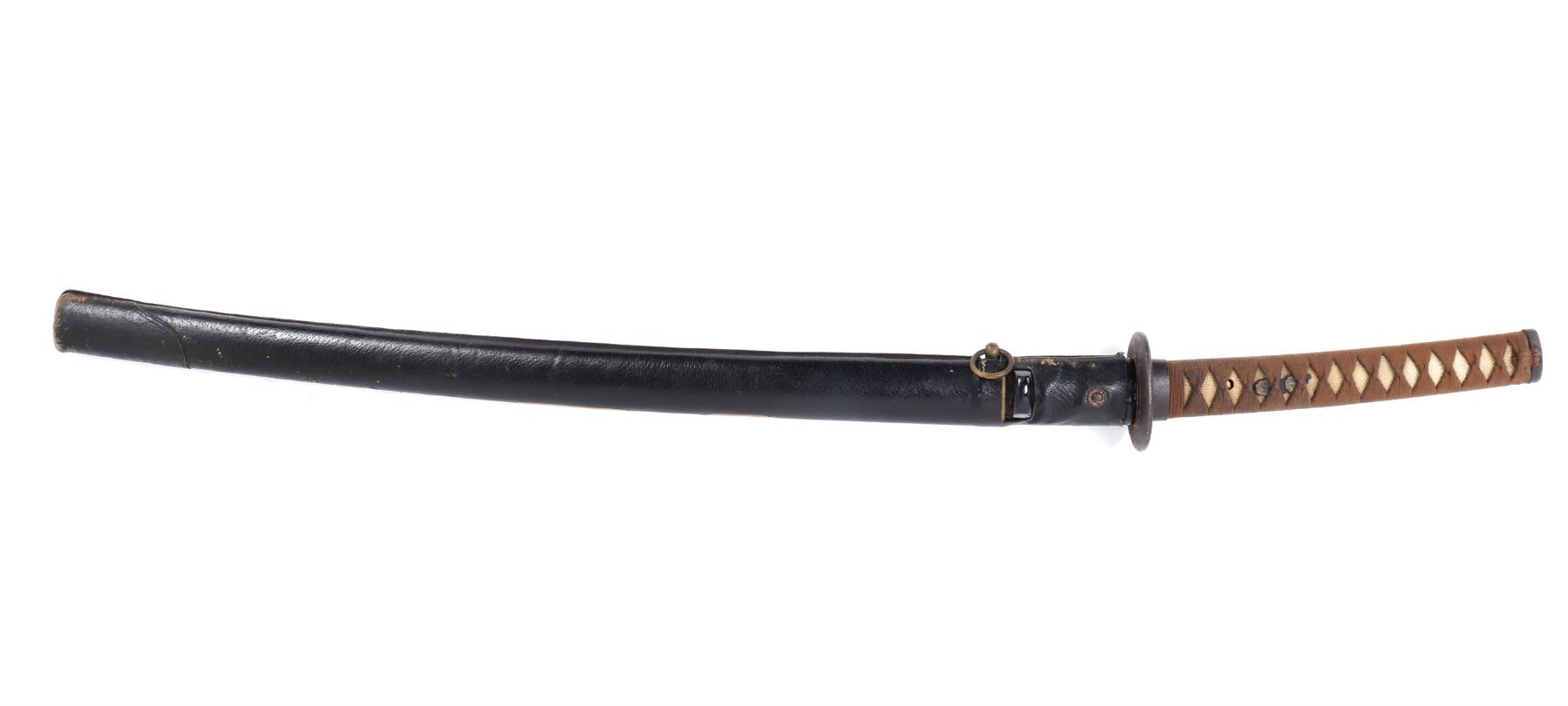 Japanese Katana sword and scabbard, Shin Shinto circa 1870s. Blade possibly circa 1500's. WWII Field Scabbard in black lacquer and wrapped in black leather and with two large surrender labels reading (Naka Japan?). Single edged curved blade with nicely patinated tang, single hole. Nice blade with good polish and with a mild wave or blowing pattern to the Hamon. Earlier Namban Tsuba with waves and remnants of gold lacquer finish. Ray-skin wrapped tsuka handle wrapped in brown colored silk. Menuki circa composition of the sword cast in copper with intricate scenes to either side obscured with years of patination. Plain iron Kashira. Size 36 1/2" L, blade 25" L. Condition: Good condition overall with light patination and wear commensurate with age and use. Provenance: Ex-Southern California Collection