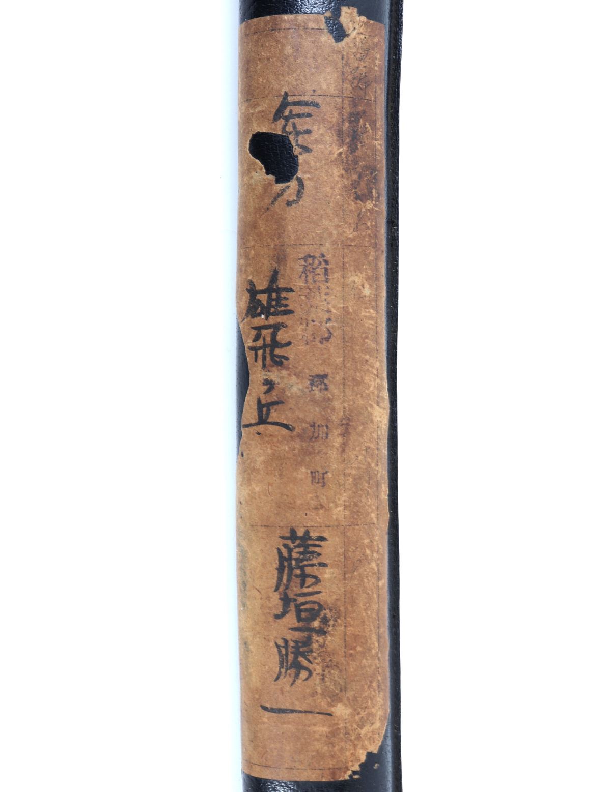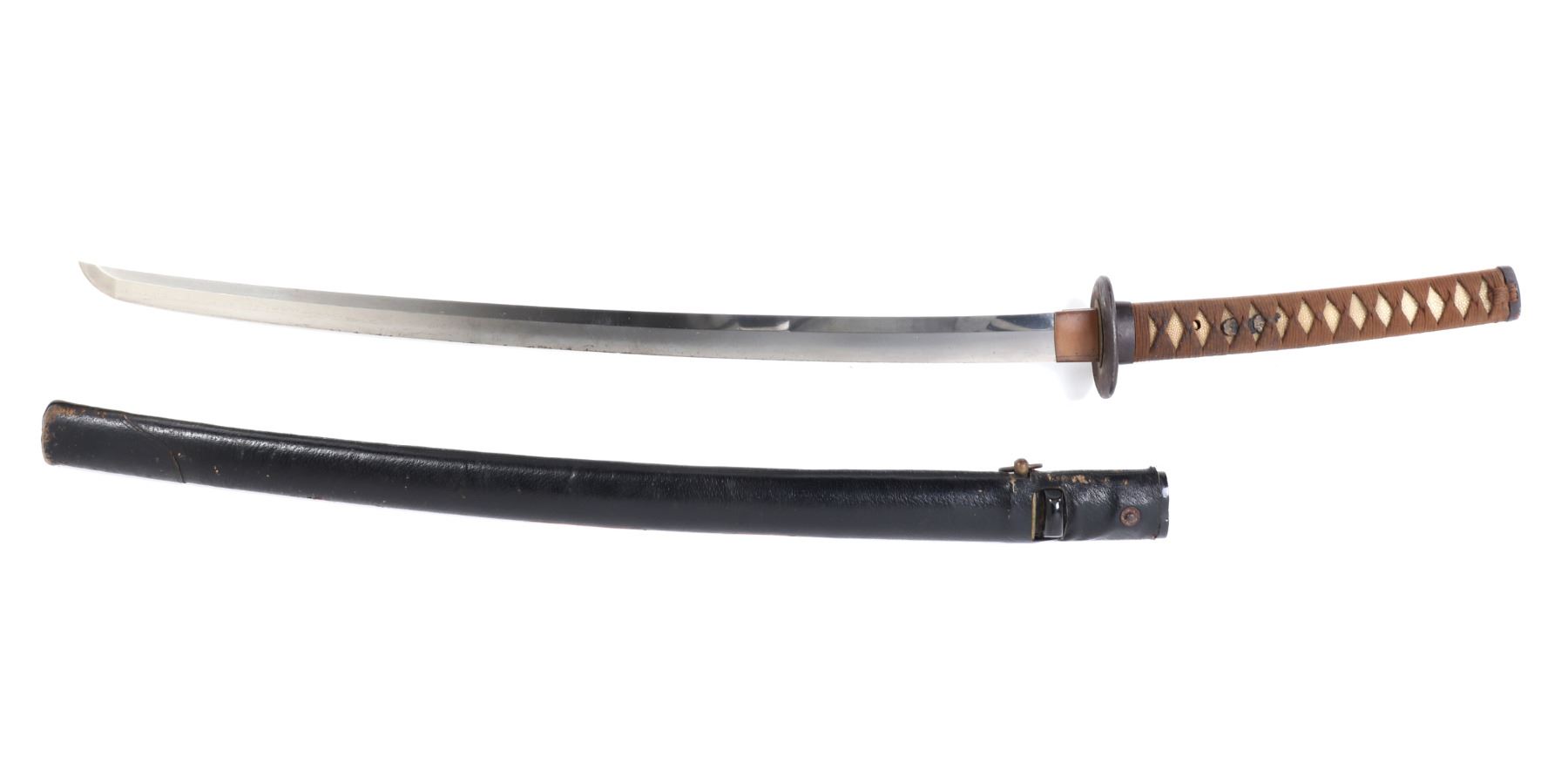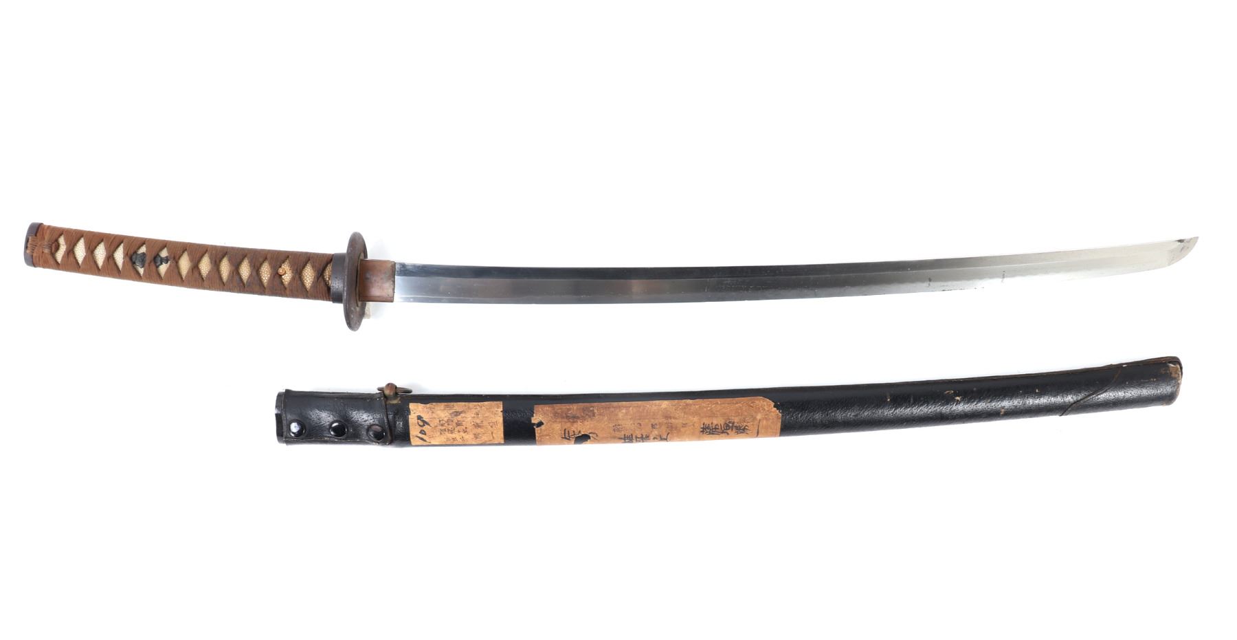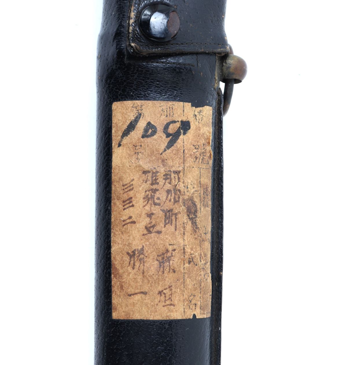 Japanese Katana sword and scabbard, Shin Shinto circa 1870s. Blade possibly circa 1500's. WWII Field Scabbard in black lacquer and wrapped in black leather and with two large surrender labels reading (Naka Japan?). Single edged curved blade with nicely patinated tang, single hole. Nice blade with good polish and with a mild wave or blowing pattern to the Hamon. Earlier Namban Tsuba with waves and remnants of gold lacquer finish. Ray-skin wrapped tsuka handle wrapped in brown colored silk. Menuki circa composition of the sword cast in copper with intricate scenes to either side obscured with years of patination. Plain iron Kashira. Size 36 1/2" L, blade 25" L. Condition: Good condition overall with light patination and wear commensurate with age and use. Provenance: Ex-Southern California Collection
