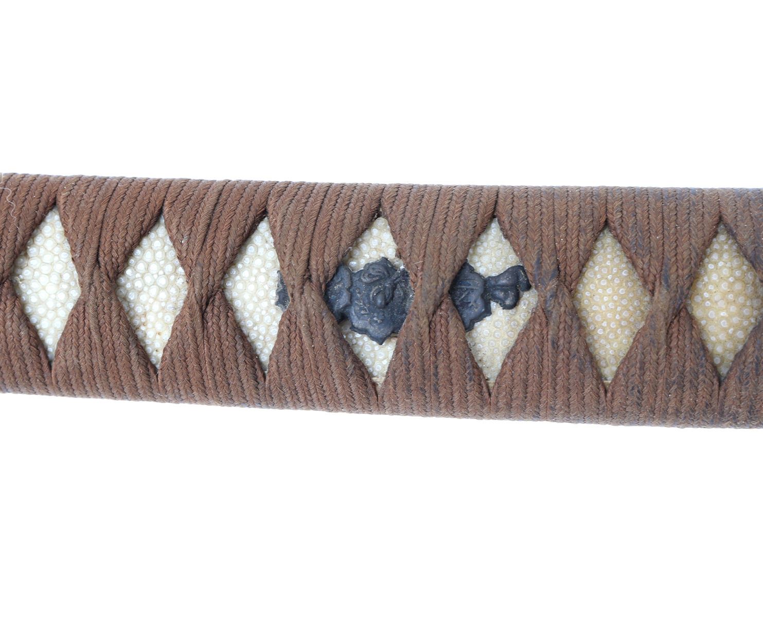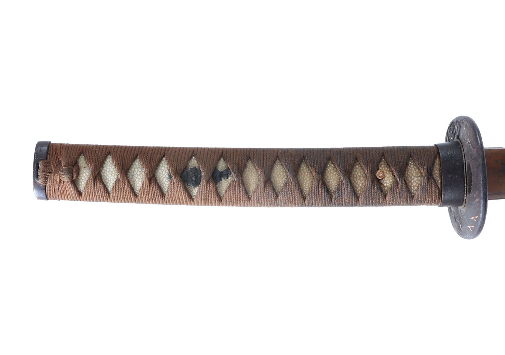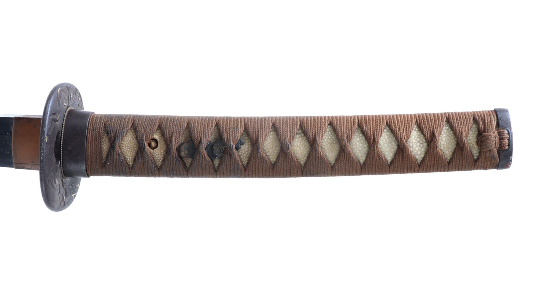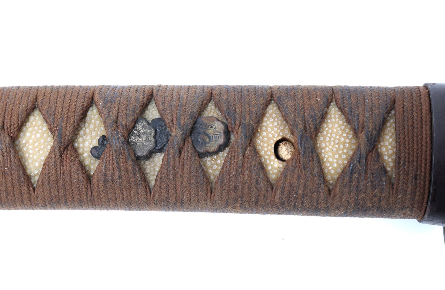 Japanese Katana sword and scabbard, Shin Shinto circa 1870s. Blade possibly circa 1500's. WWII Field Scabbard in black lacquer and wrapped in black leather and with two large surrender labels reading (Naka Japan?). Single edged curved blade with nicely patinated tang, single hole. Nice blade with good polish and with a mild wave or blowing pattern to the Hamon. Earlier Namban Tsuba with waves and remnants of gold lacquer finish. Ray-skin wrapped tsuka handle wrapped in brown colored silk. Menuki circa composition of the sword cast in copper with intricate scenes to either side obscured with years of patination. Plain iron Kashira. Size 36 1/2" L, blade 25" L. Condition: Good condition overall with light patination and wear commensurate with age and use. Provenance: Ex-Southern California Collection