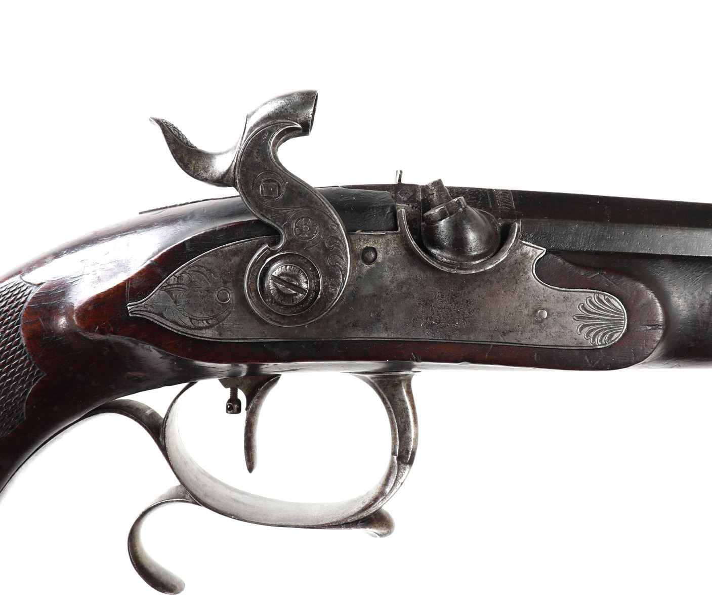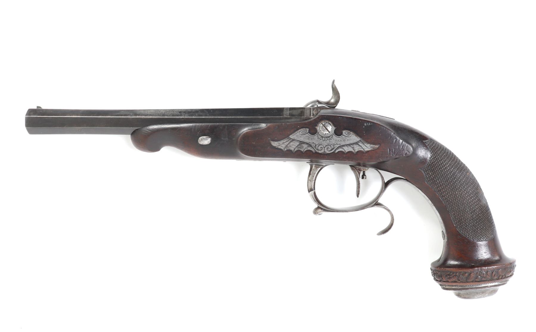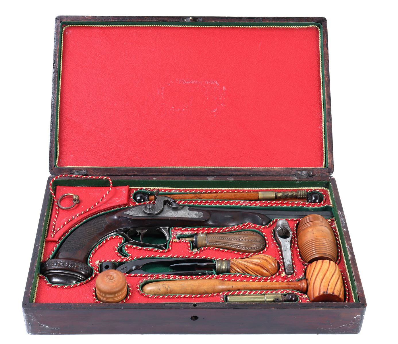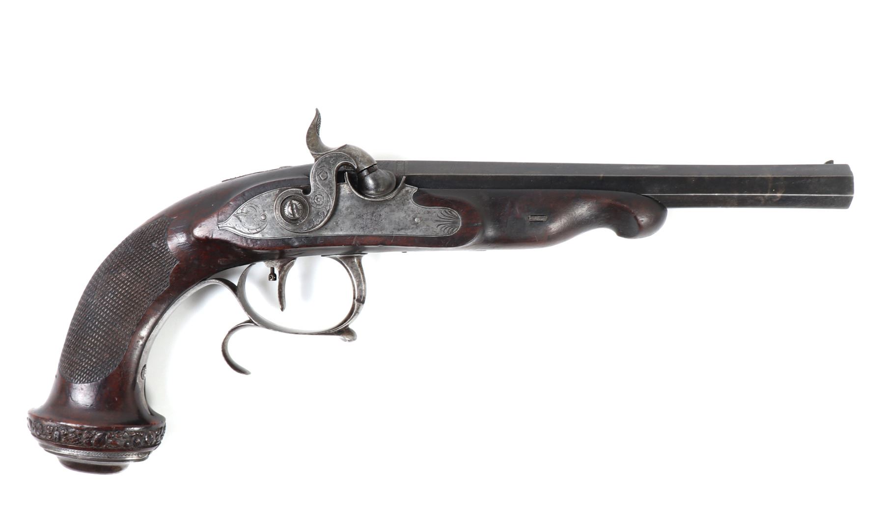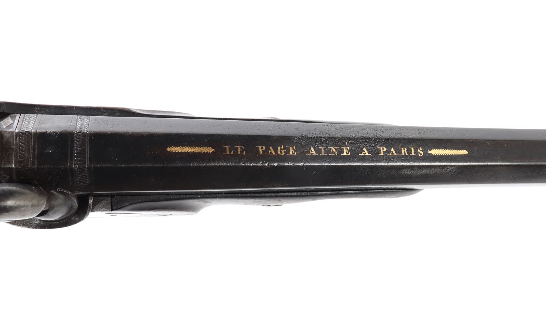 Officer's percussion pistol by LePage Aine (Paris, France) with "Le Page Aine A Paris" in gold to the blued octagonal barrel with remnants of hair rifling. The iron lock plat and cap is engraved with foliage designs. Trigger with adjusting screw, finger rest trigger guard. Checkered walnut stock. Later decorated box in the manner of LePage with accessories including screwdriver mallet with spiraled design, bullet mold, copper powder flask, chopsticks, cookie cutter. Size case 15 1/8" L x 9" W x 2 3/4" H, pistol 14 1/4" L, barrel 10 1/2" L
