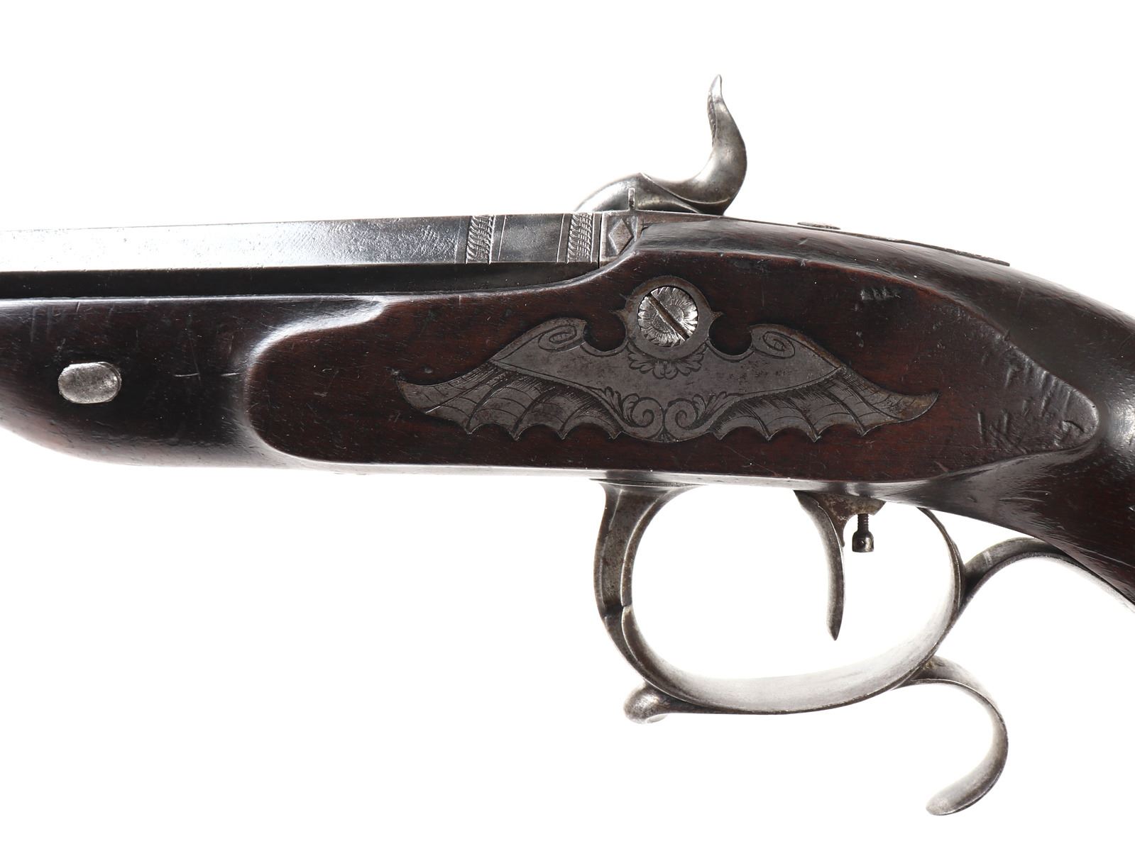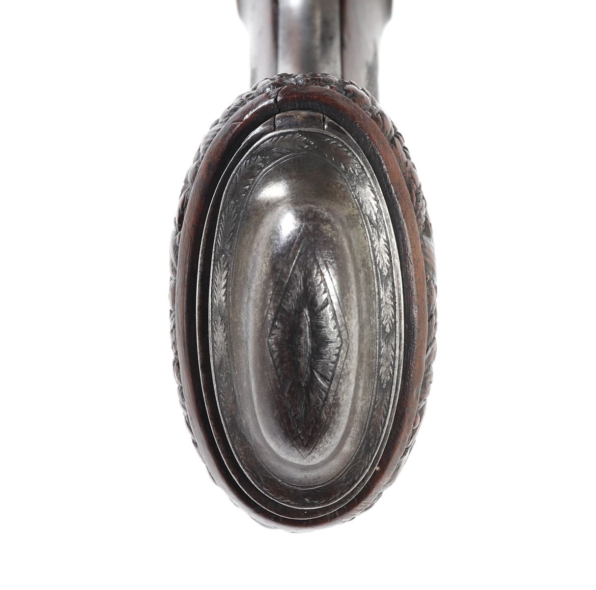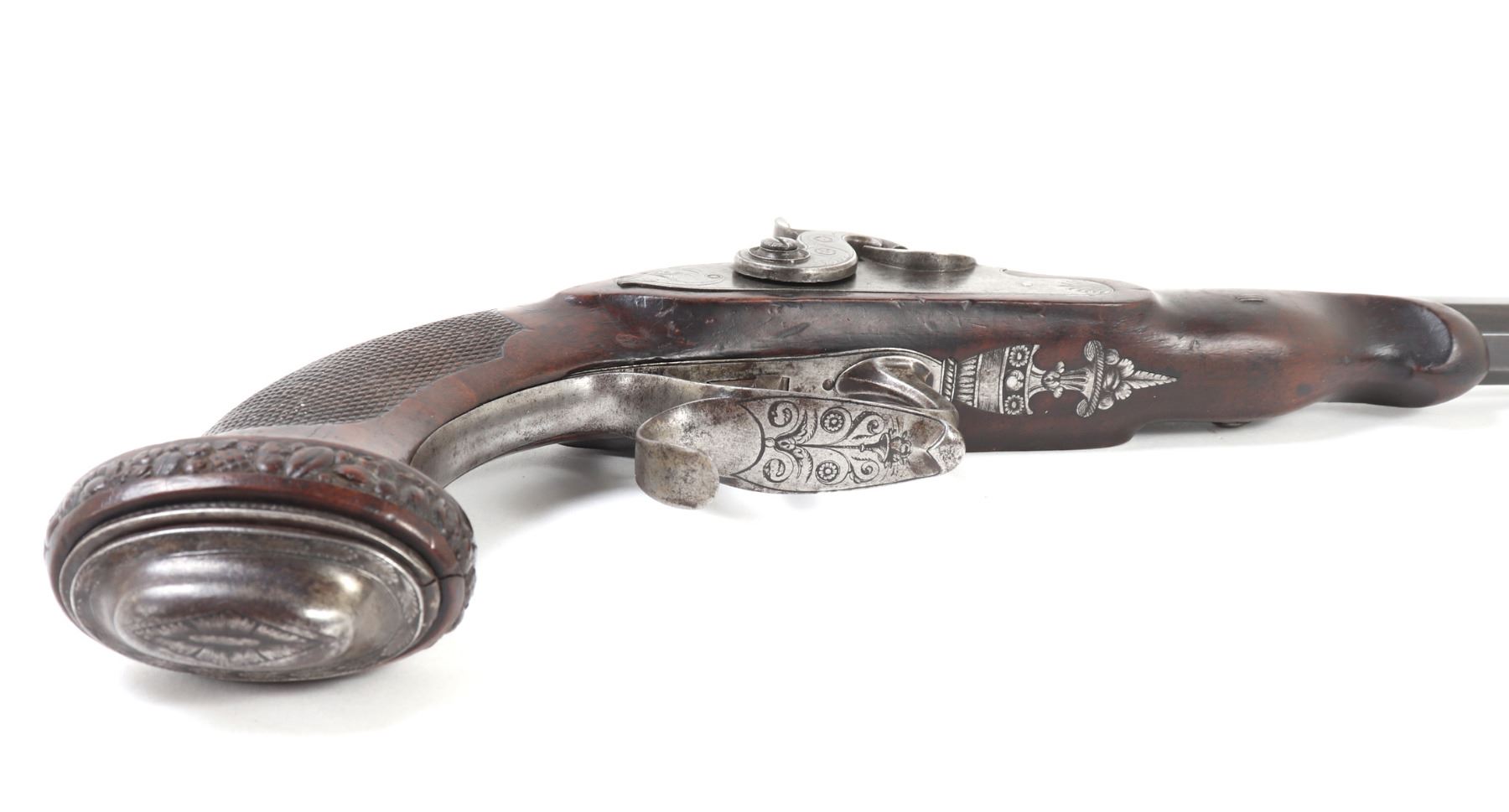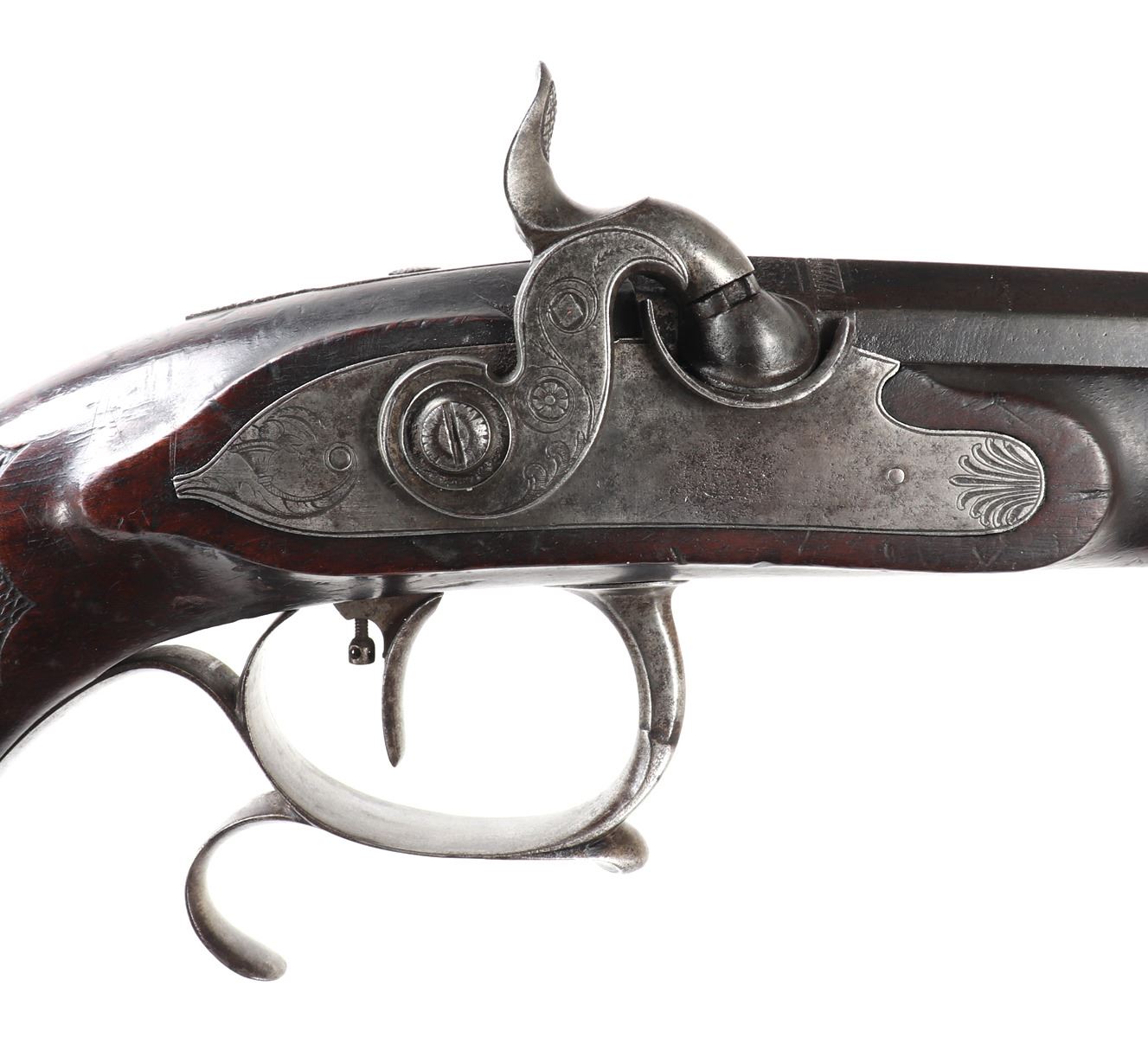 Officer's percussion pistol by LePage Aine (Paris, France) with "Le Page Aine A Paris" in gold to the blued octagonal barrel with remnants of hair rifling. The iron lock plat and cap is engraved with foliage designs. Trigger with adjusting screw, finger rest trigger guard. Checkered walnut stock. Later decorated box in the manner of LePage with accessories including screwdriver mallet with spiraled design, bullet mold, copper powder flask, chopsticks, cookie cutter. Size case 15 1/8" L x 9" W x 2 3/4" H, pistol 14 1/4" L, barrel 10 1/2" L