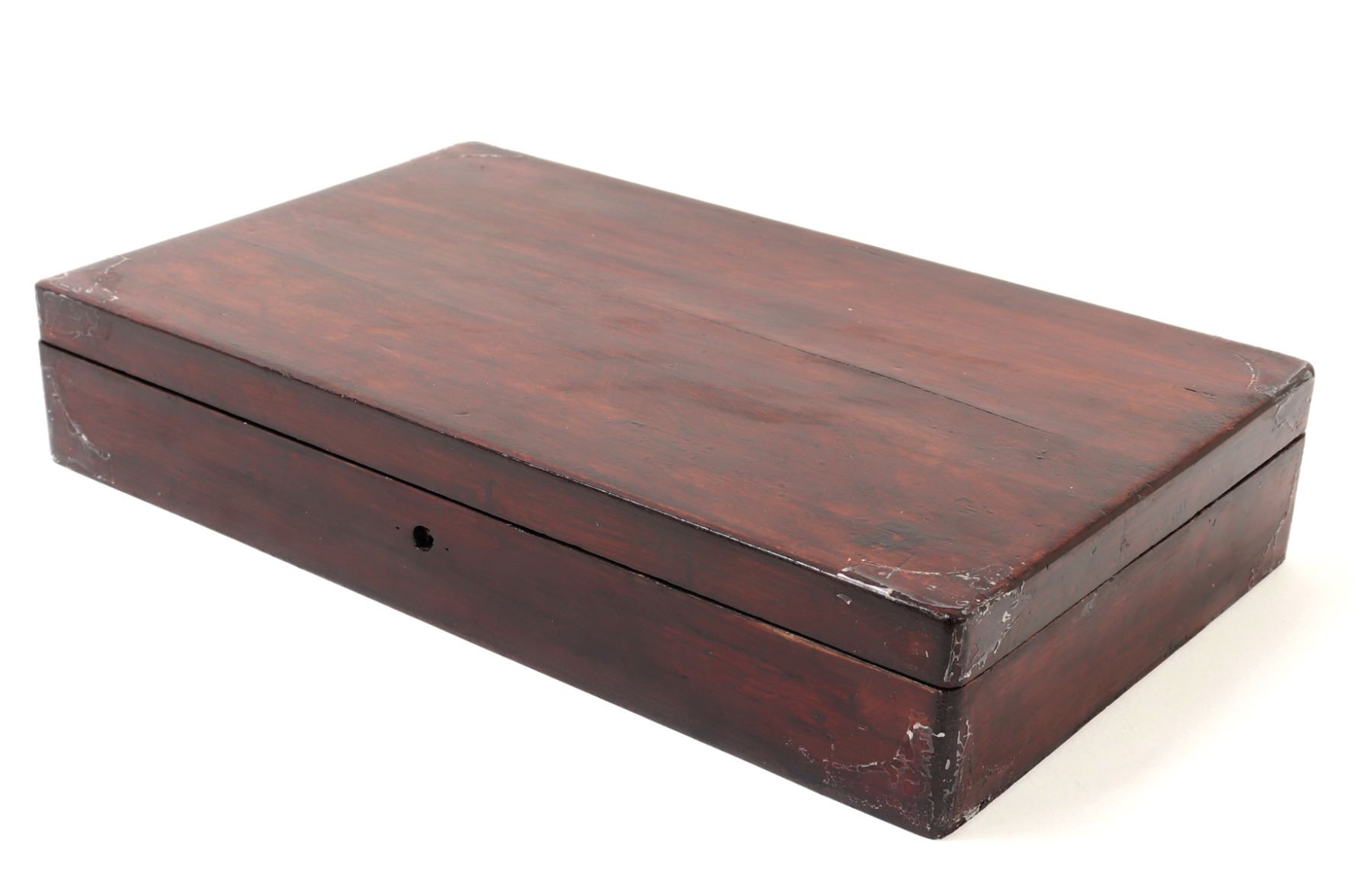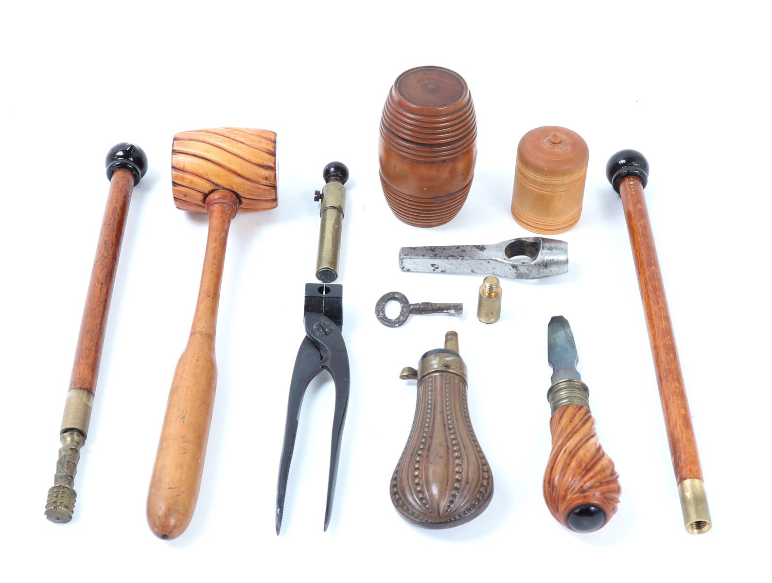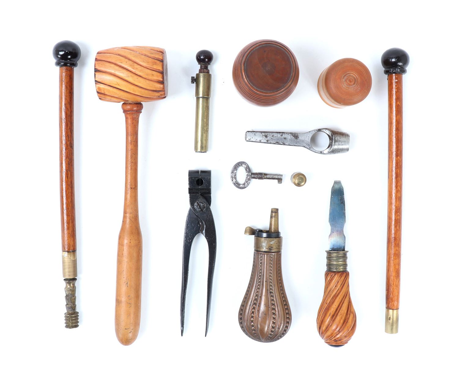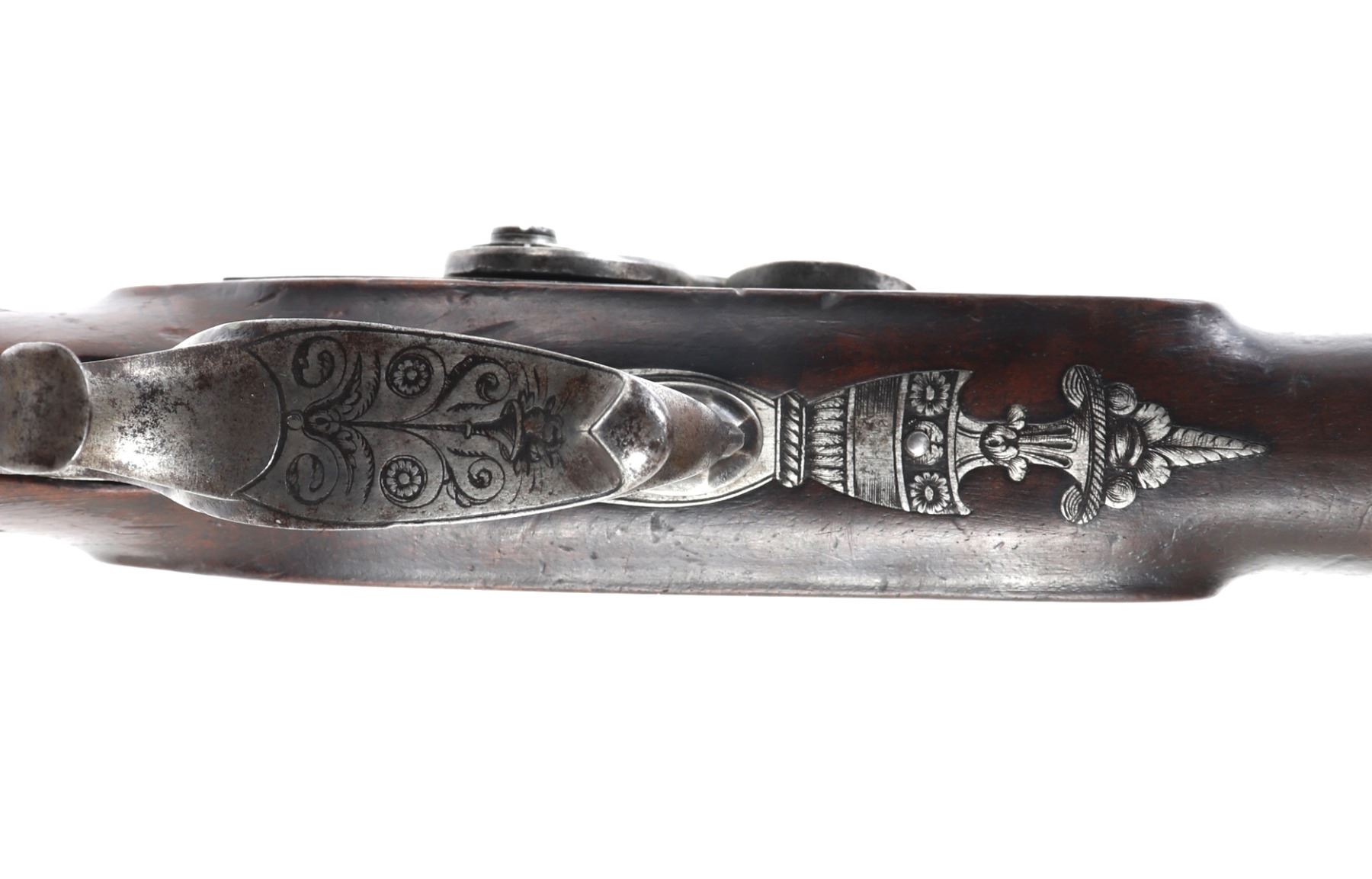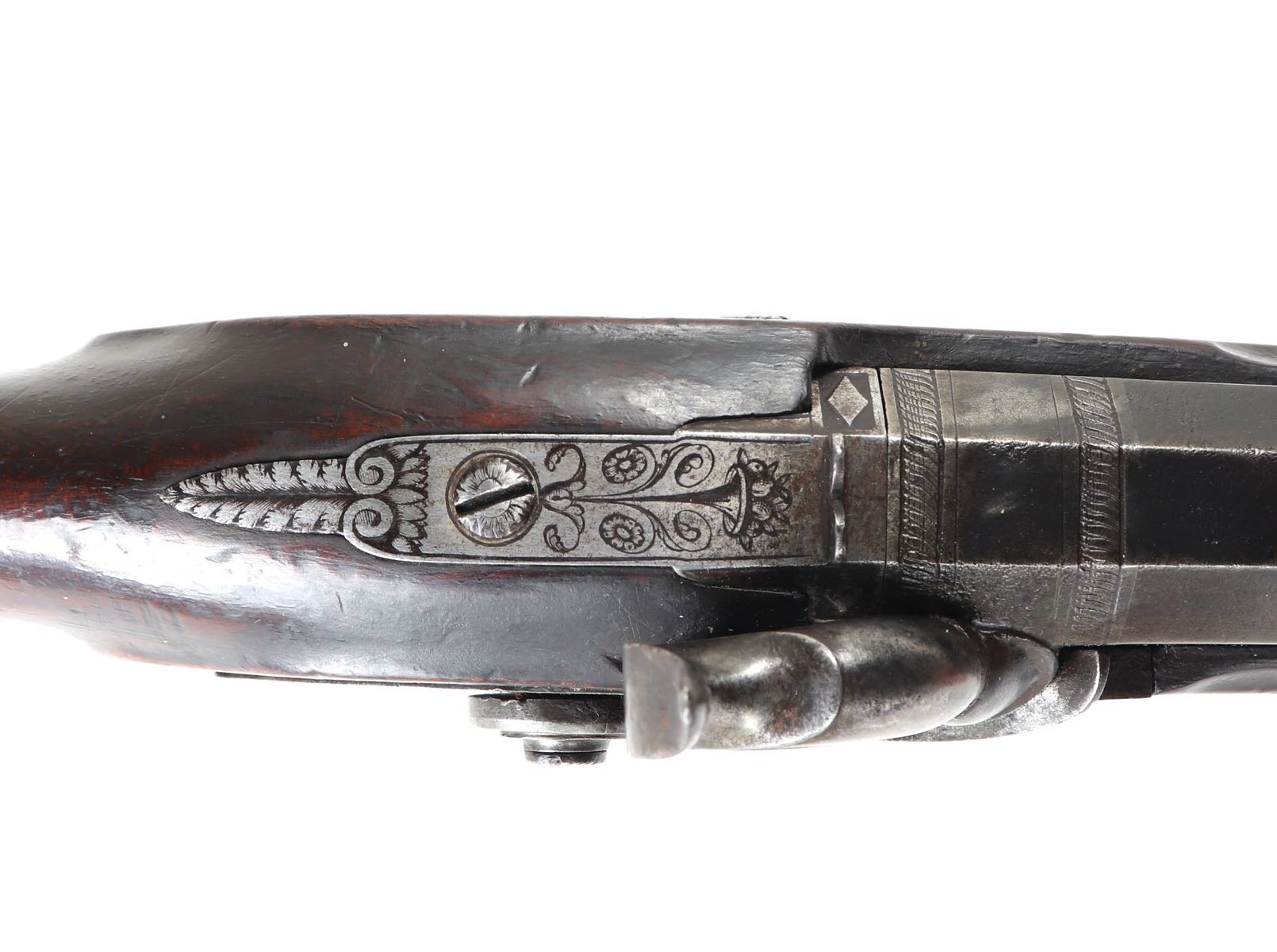 Officer's percussion pistol by LePage Aine (Paris, France) with "Le Page Aine A Paris" in gold to the blued octagonal barrel with remnants of hair rifling. The iron lock plat and cap is engraved with foliage designs. Trigger with adjusting screw, finger rest trigger guard. Checkered walnut stock. Later decorated box in the manner of LePage with accessories including screwdriver mallet with spiraled design, bullet mold, copper powder flask, chopsticks, cookie cutter. Size case 15 1/8" L x 9" W x 2 3/4" H, pistol 14 1/4" L, barrel 10 1/2" L