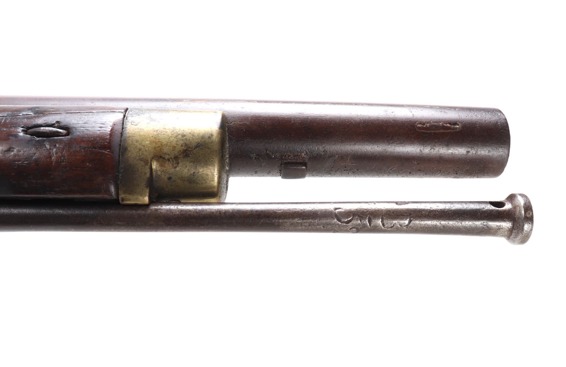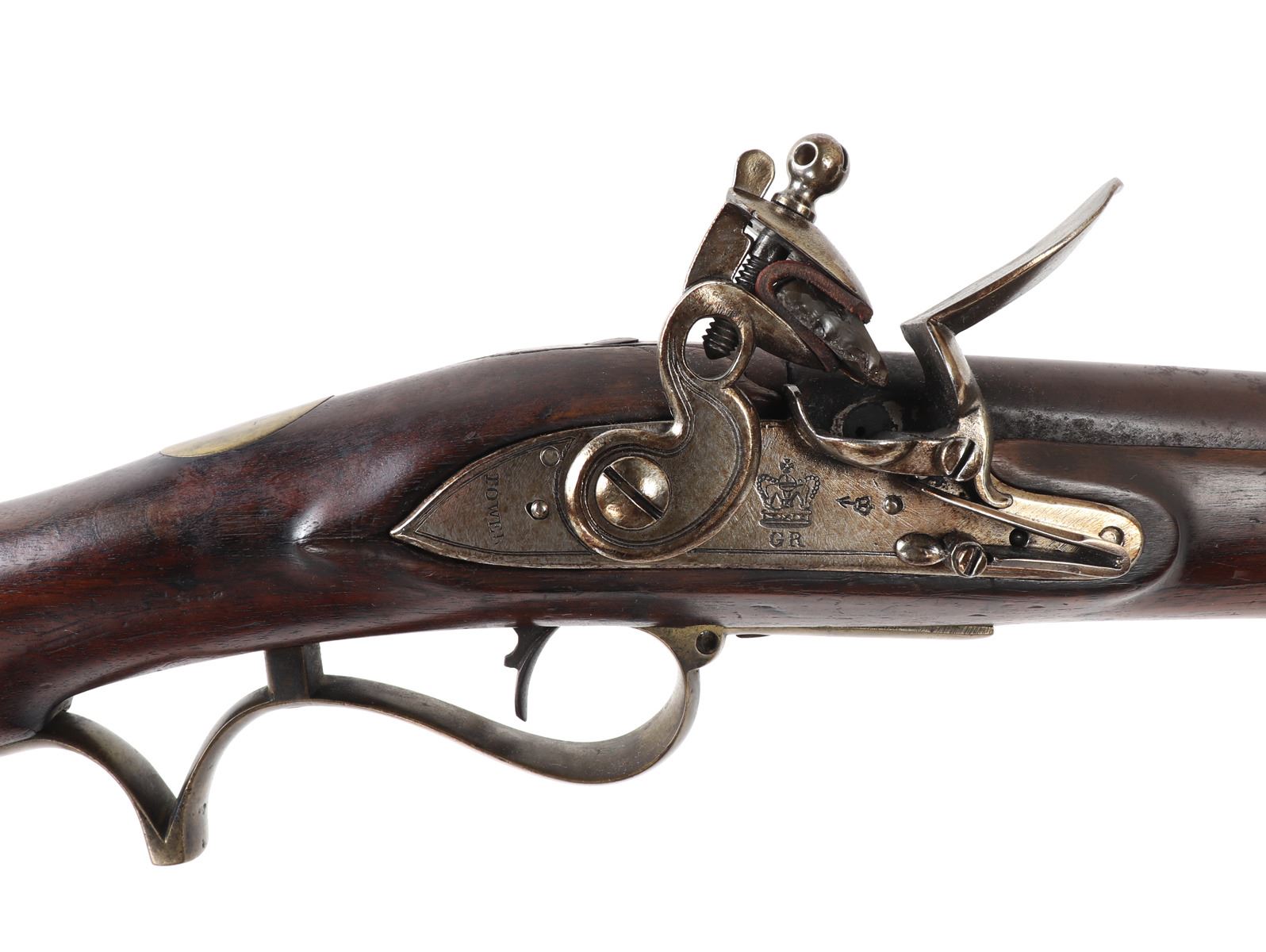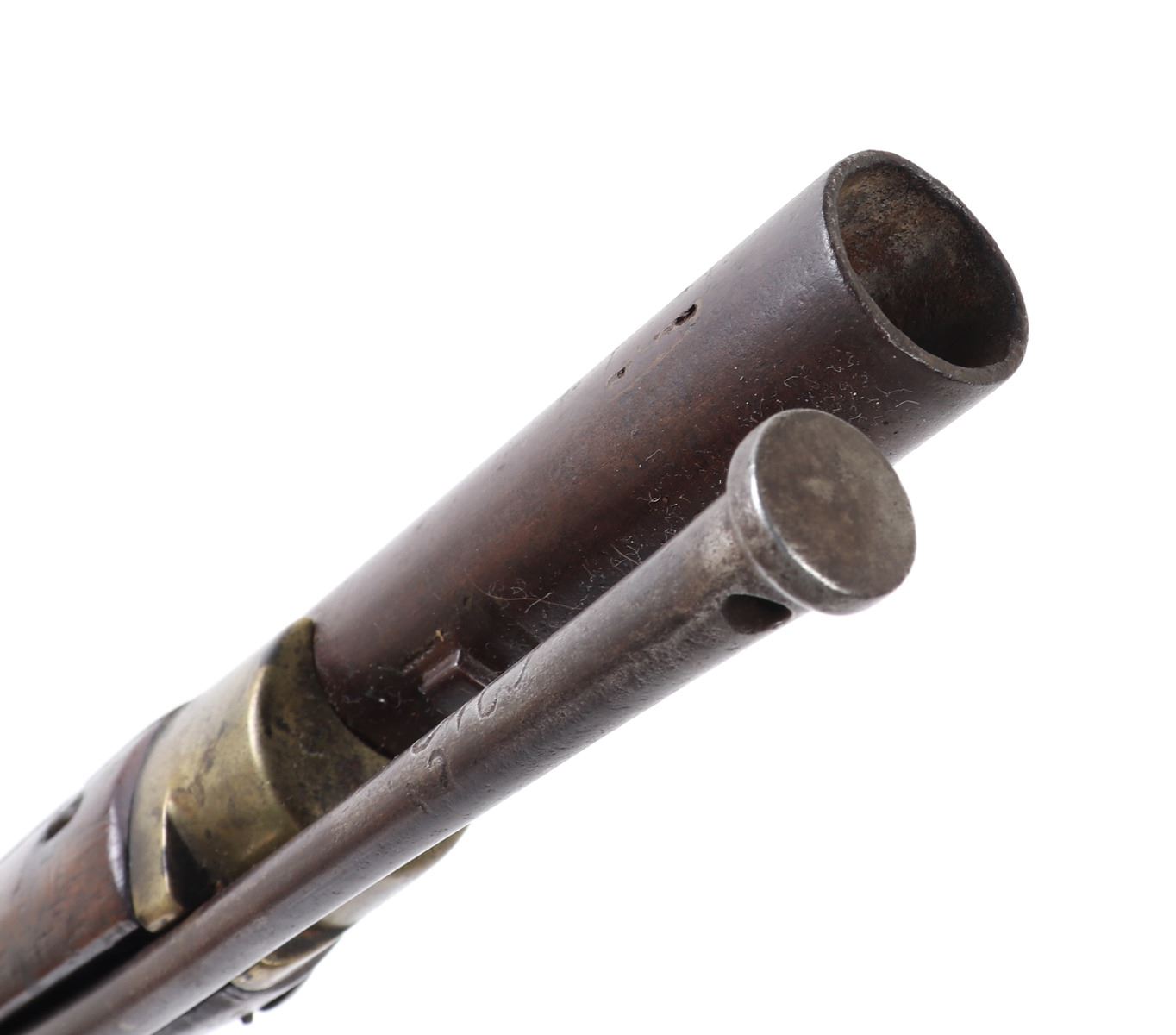 Rare example of a British military pattern 1800/1810 Baker flintlock infantry rifle, dating from approximately 1800 to 1815. This .70 caliber rifle features a 30.25" rifled browned twist-iron barrel with a patent breech. The left side of the breech bears remnants of a TOWER proof mark. Originally fitted with a bayonet bar, the bar later modified to accept a socketed bayonet, a period alteration. The rifle remains in flintlock configuration (see notes below for details). The flat lock is marked internally with “GILL,” indicating manufacture by the contractor to the Tower Ordnance. External markings include a small crown over broad arrow (denoting government ownership), a crown over “GR” (for King George III), and “TOWER” stamped at the tail of the lock. The rifle retains its standard all-brass pattern furniture, including the butt plate, which is regimentally marked "B / 52." The original steel ramrod is also present and bears the matching regimental mark "B / 52." The walnut stock displays several period military markings, including the British broad arrow over "BO" (Board of Ordnance) located on the right side ahead of the brass patch box. Additional markings include two inspector's stamps at the tail of the trigger guard, a crown over "P," and an "L" on the left side of the stock, just behind the side plate. Size 45 7/8" L, Barrel 32 1/4" L. Condition: Good condition overall with sling swivels absent and likely period removed. Middle barrel key/ wedge absent.. Provenance: Ex-Southern California Collection