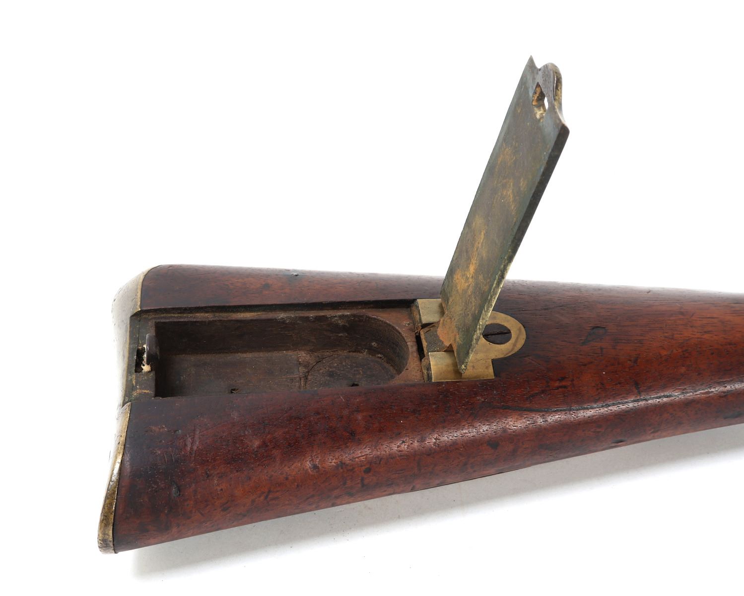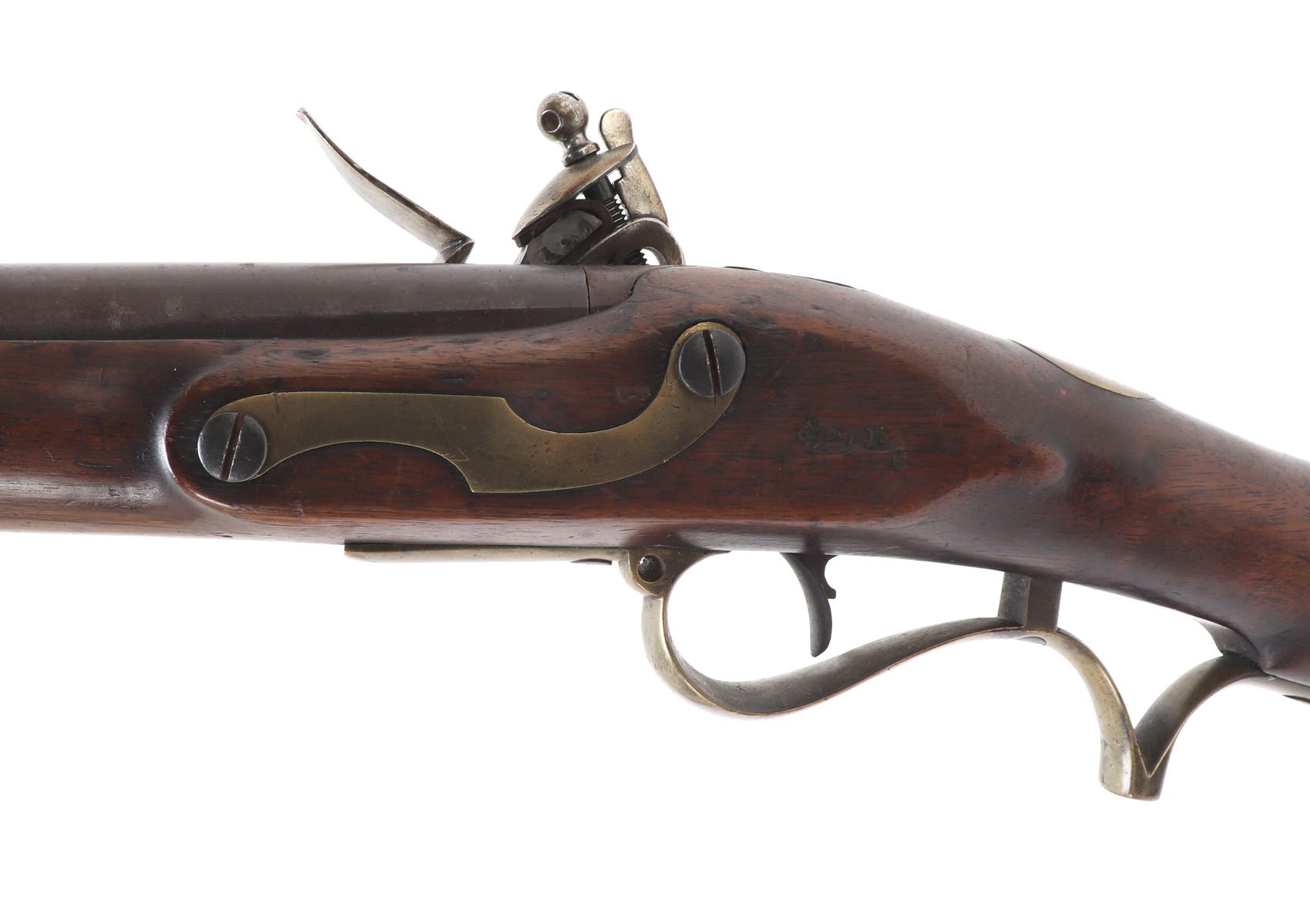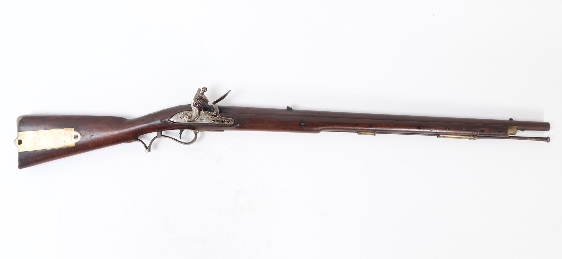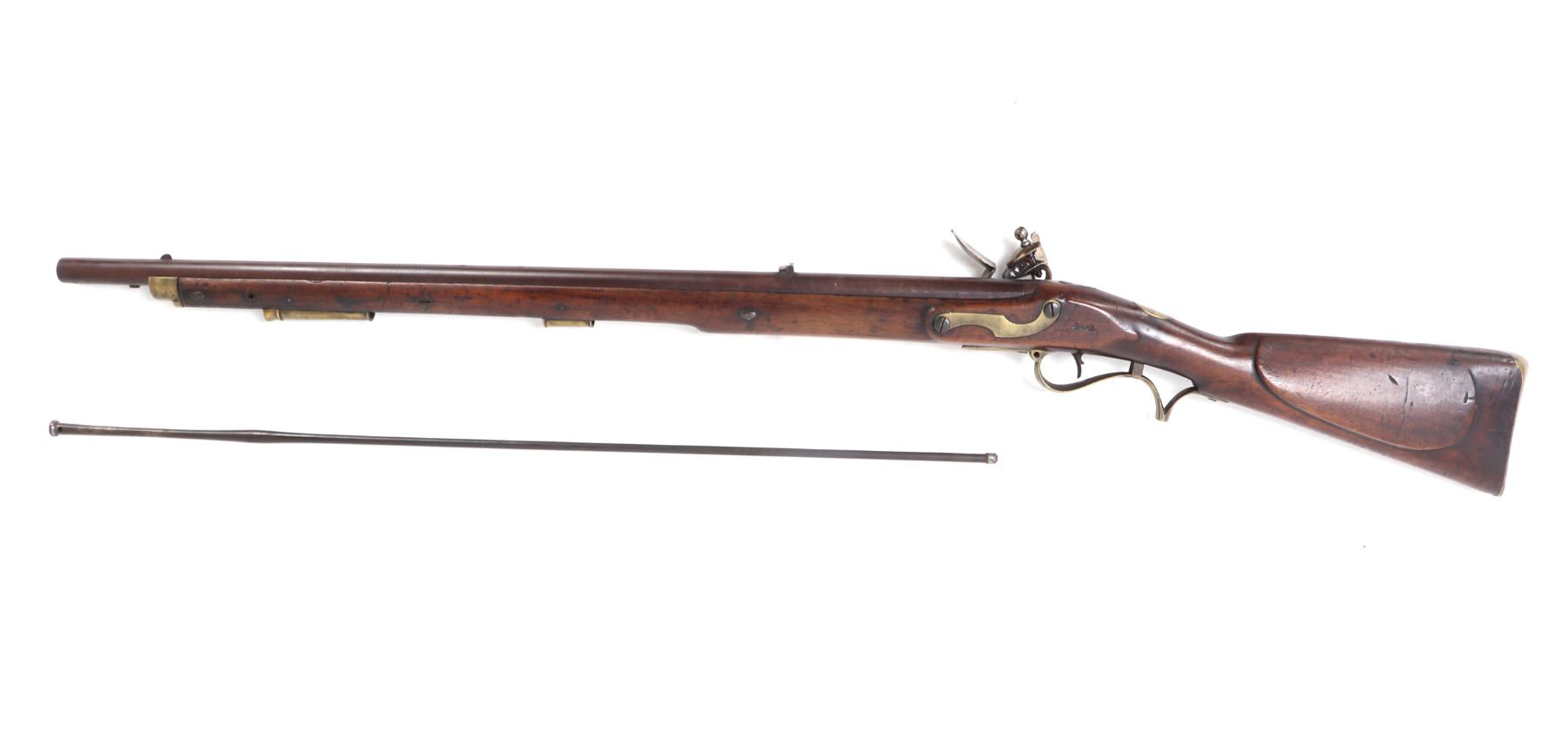 Rare example of a British military pattern 1800/1810 Baker flintlock infantry rifle, dating from approximately 1800 to 1815. This .70 caliber rifle features a 30.25" rifled browned twist-iron barrel with a patent breech. The left side of the breech bears remnants of a TOWER proof mark. Originally fitted with a bayonet bar, the bar later modified to accept a socketed bayonet, a period alteration. The rifle remains in flintlock configuration (see notes below for details). The flat lock is marked internally with “GILL,” indicating manufacture by the contractor to the Tower Ordnance. External markings include a small crown over broad arrow (denoting government ownership), a crown over “GR” (for King George III), and “TOWER” stamped at the tail of the lock. The rifle retains its standard all-brass pattern furniture, including the butt plate, which is regimentally marked "B / 52." The original steel ramrod is also present and bears the matching regimental mark "B / 52." The walnut stock displays several period military markings, including the British broad arrow over "BO" (Board of Ordnance) located on the right side ahead of the brass patch box. Additional markings include two inspector's stamps at the tail of the trigger guard, a crown over "P," and an "L" on the left side of the stock, just behind the side plate. Size 45 7/8" L, Barrel 32 1/4" L. Condition: Good condition overall with sling swivels absent and likely period removed. Middle barrel key/ wedge absent.. Provenance: Ex-Southern California Collection