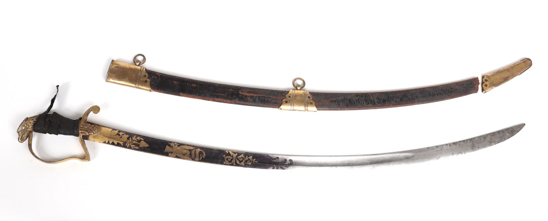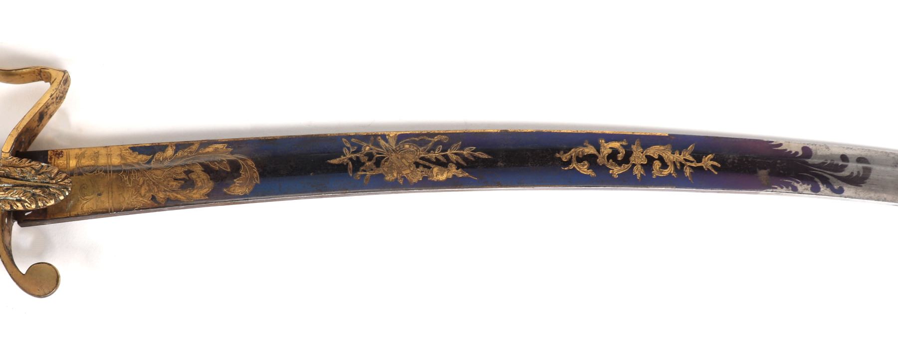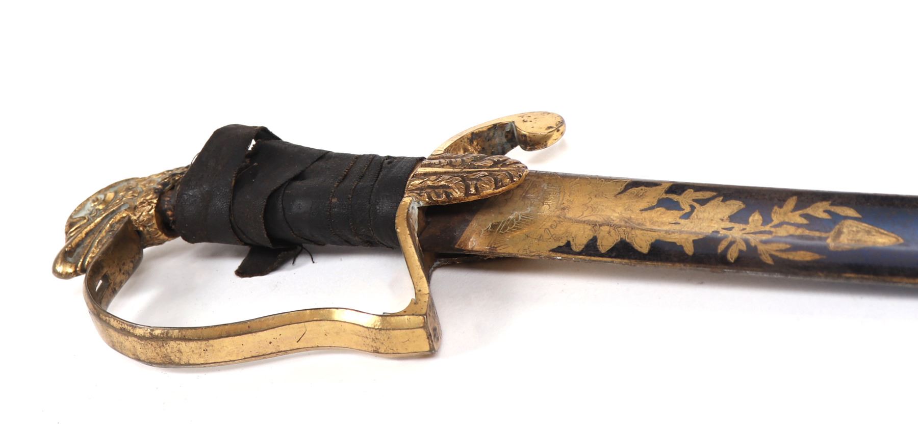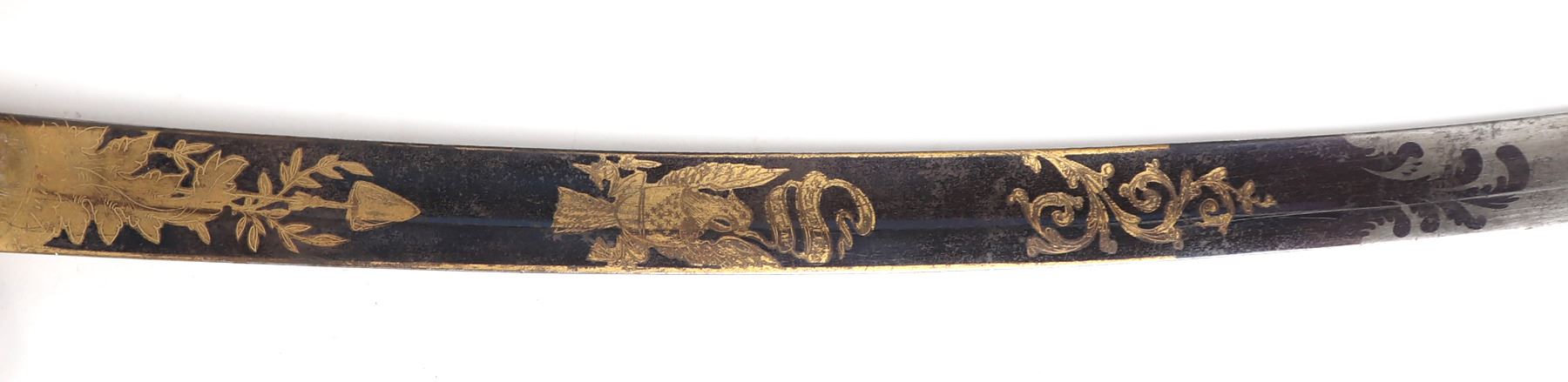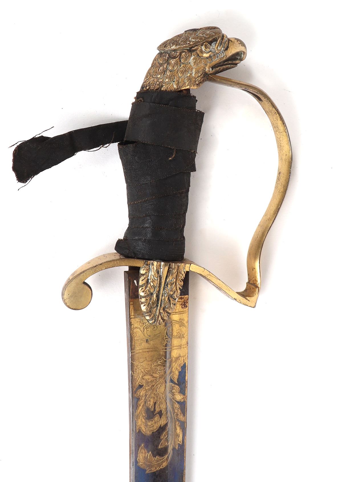 American circa 1805-1820 bright fire-blued blade with gilt accented inscribed American Eagle, E PLURIBUS UNUM on banner, and various military motifs. With scabbard and heavily gilt scabbard fittings. The leather on the bottom of the scabbard has a separation – and needs reinforcement. Heavily gilt hilt. The grip insert is absent. Desirable sword with fine gilt brass components and bluing. Overall 38" L, blade 33" L