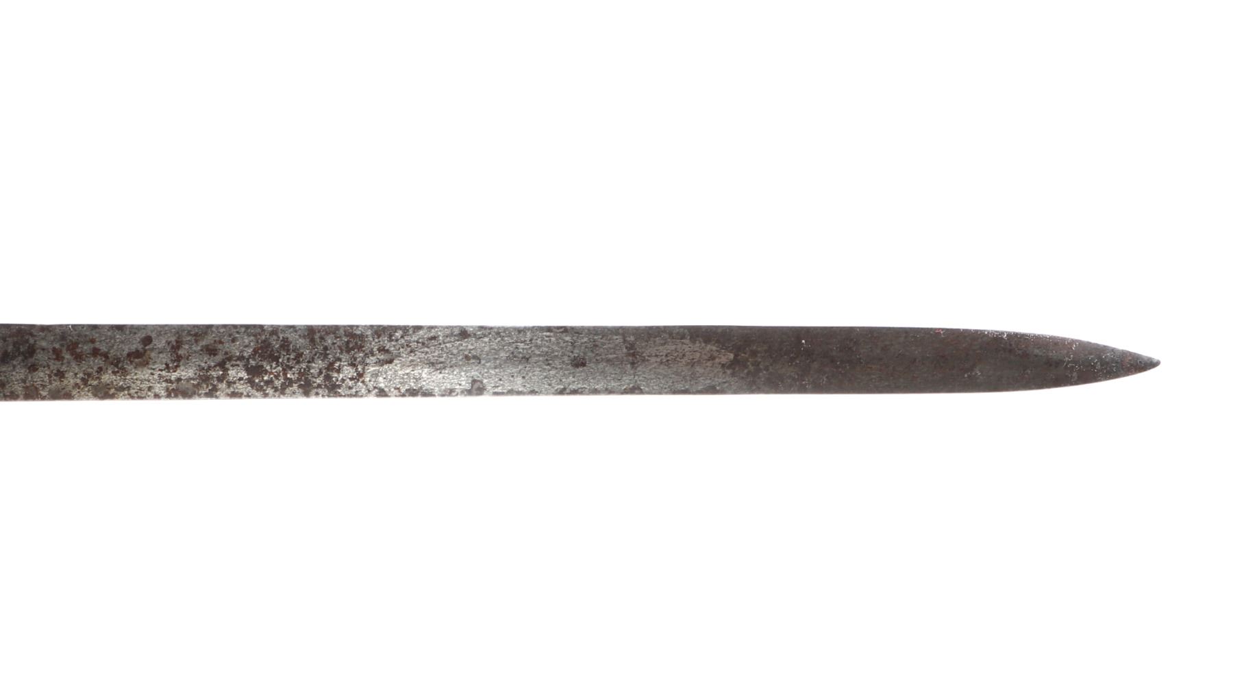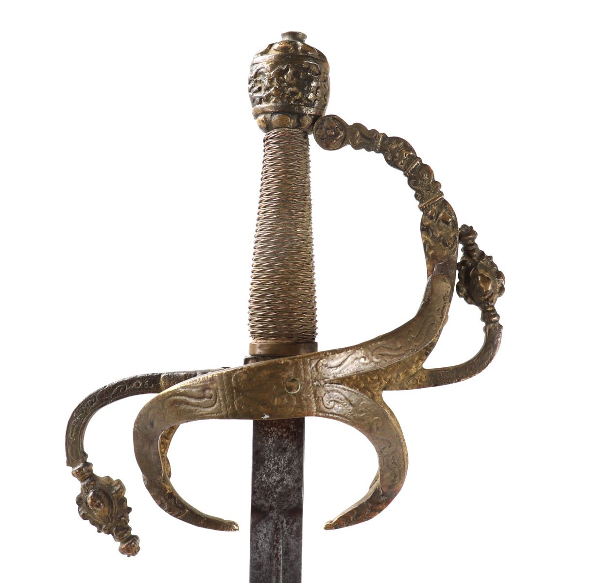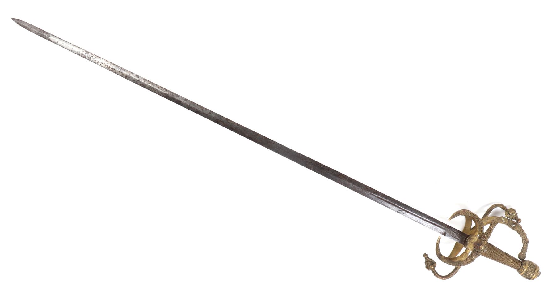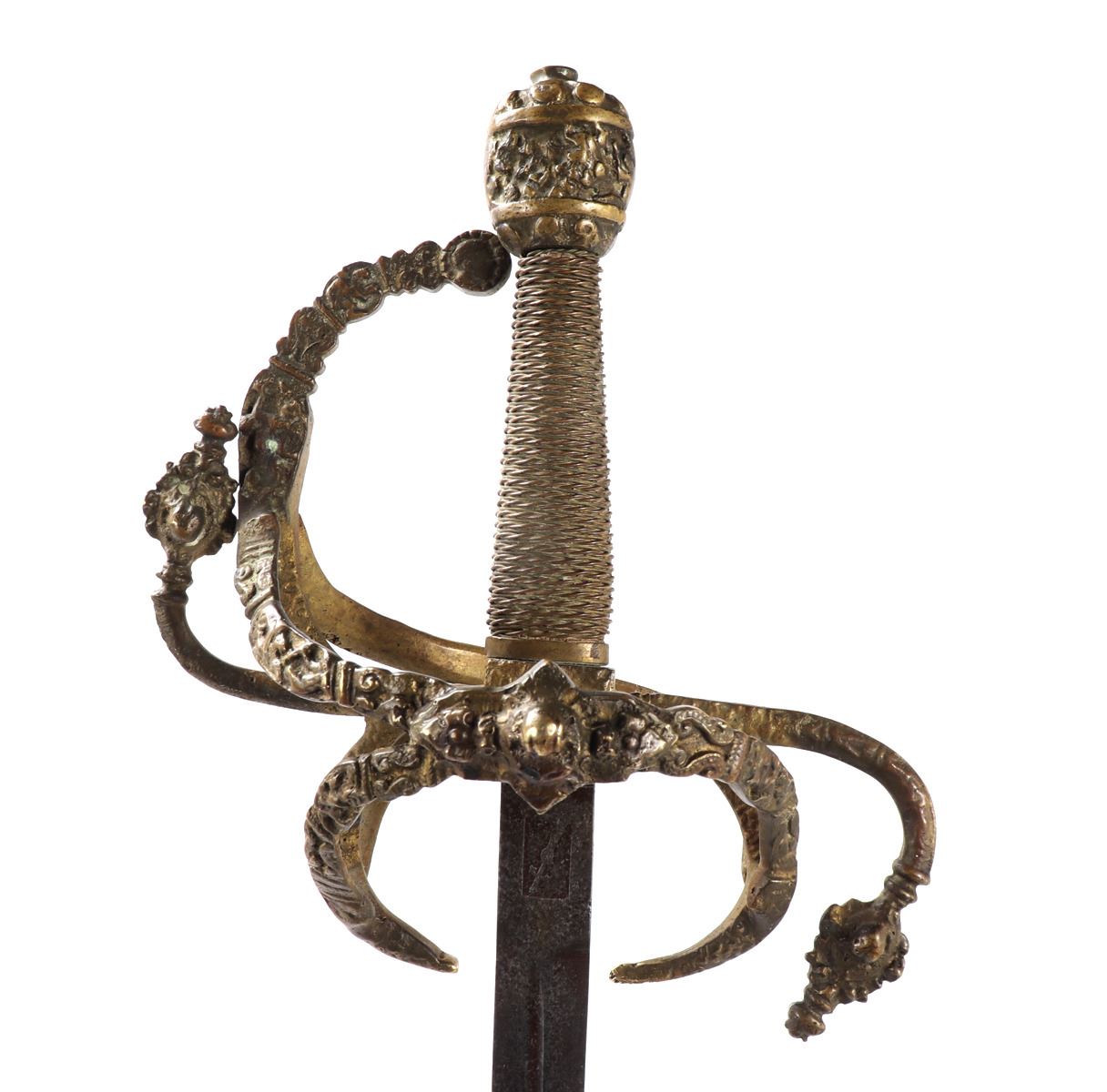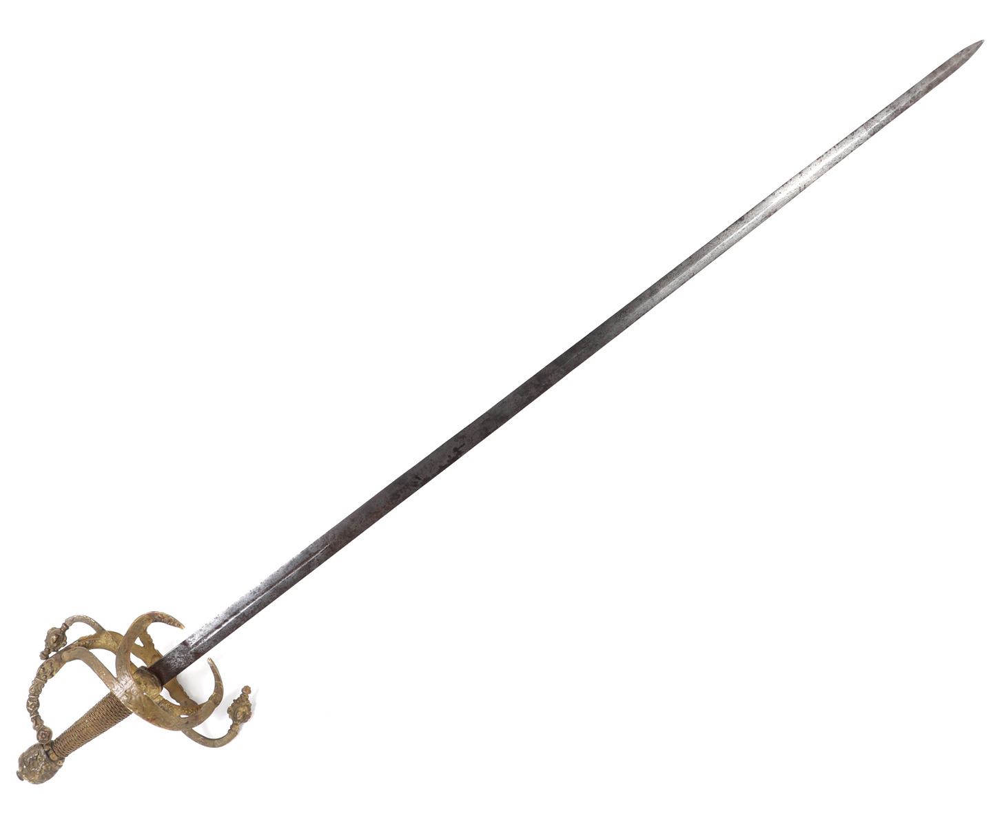 Large Toledo swept hilt rapier with cast handle. Double edged blade with short fuller to one section of the blade. Size 43" L, Blade 37" L. Provenance: Ex-Southern California Estate