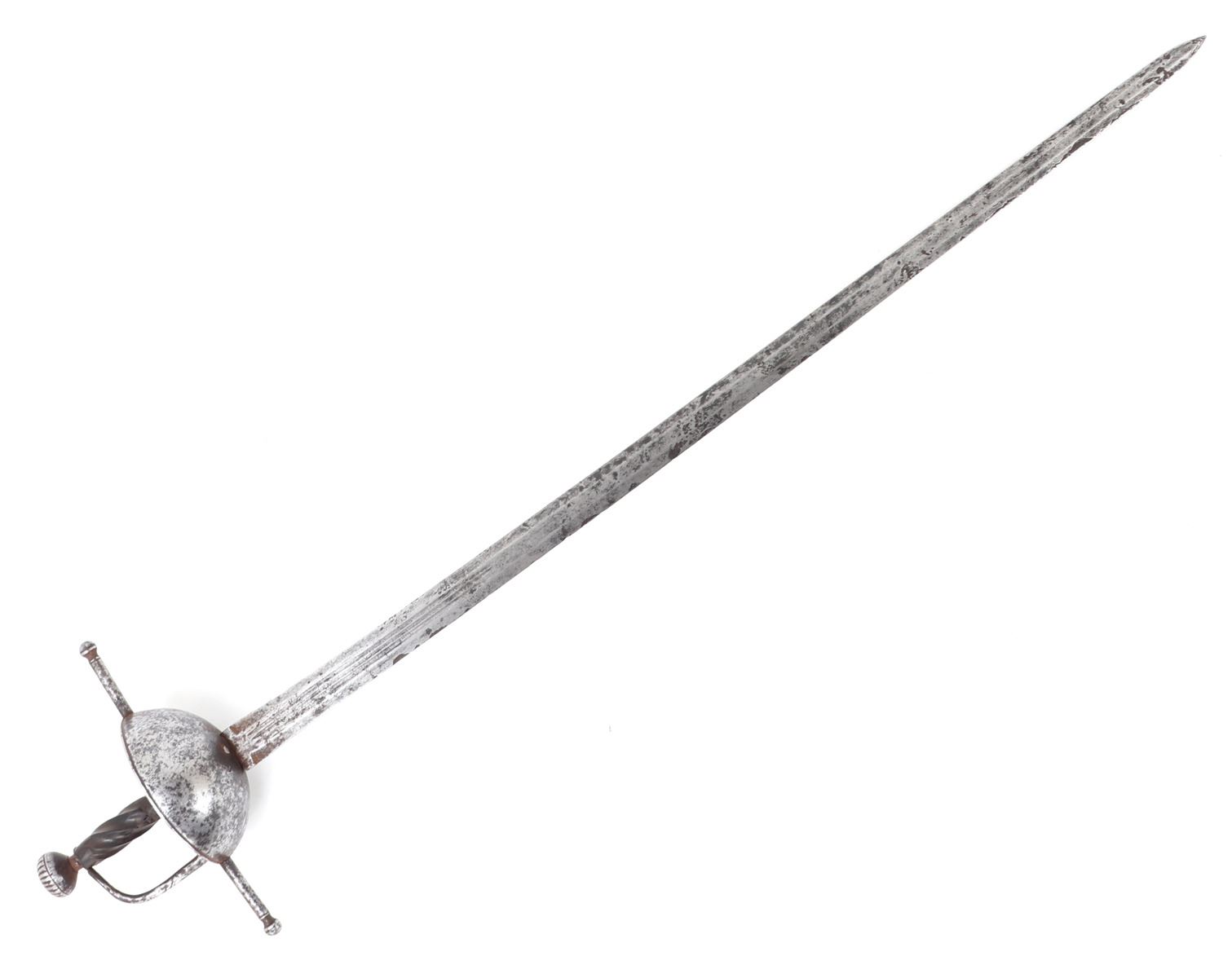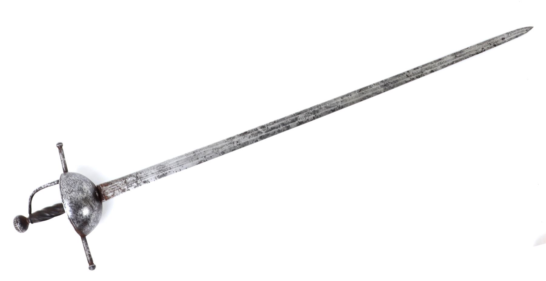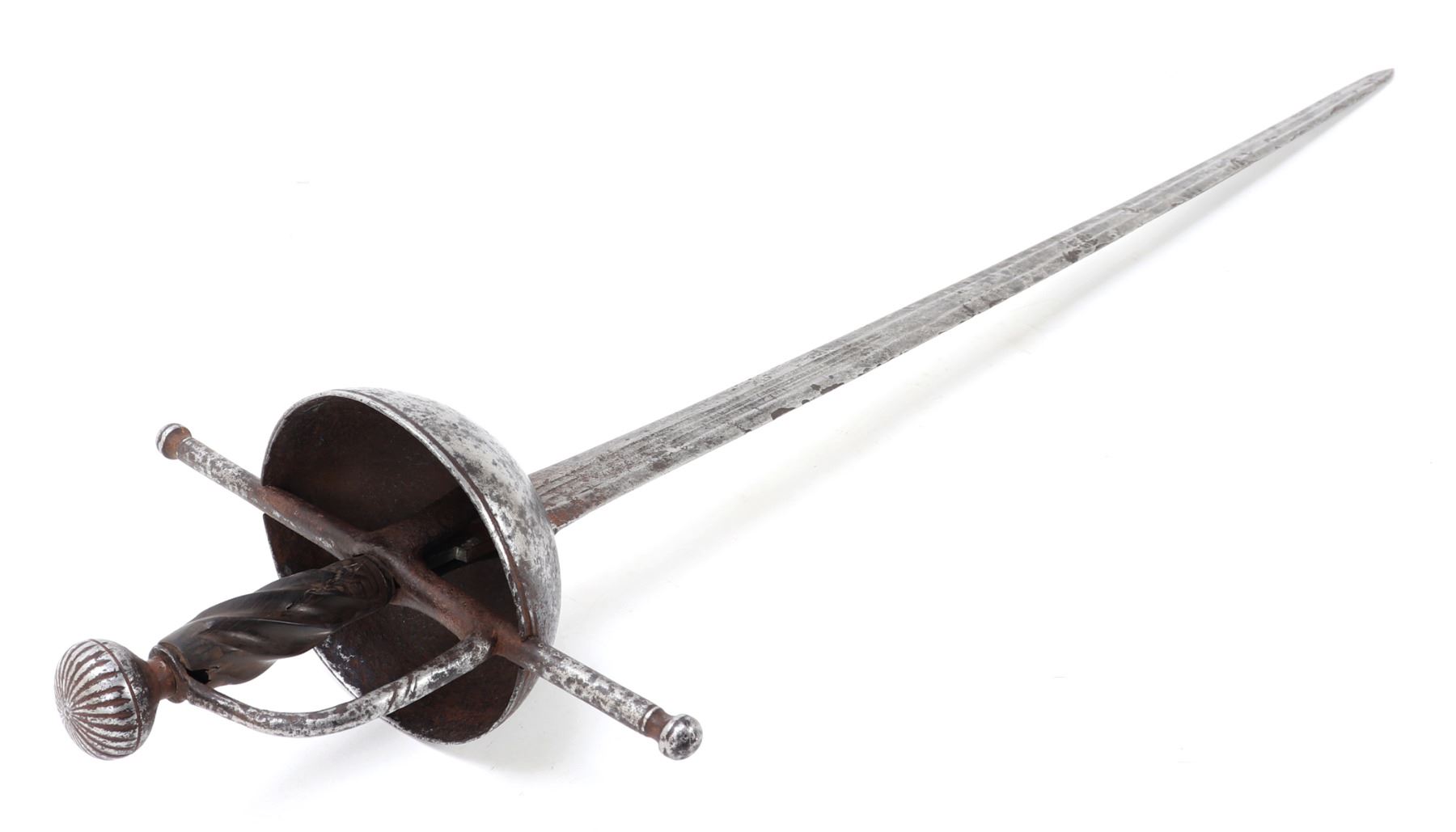 Iberian Peninsula, Spain, Spanish Colonial period 18th century cup hilt broadsword. Nice wide nearly 1.5" blade with a triple fuller and double edge straight blade 37" long to the base of the cup. Fitted later with horn grip and D shaped guard over. Straight quillion with mushroom ends. Cup bowl with single horizontal engraved line to the top. Size 44 1/4" L x 10 1/2" W. Condition: Typical wear, blade with remnants of the famous Spanish Motto (Not To Remove without reason, or use without Honor)c. Provenance: Ex-Western USA Collection
