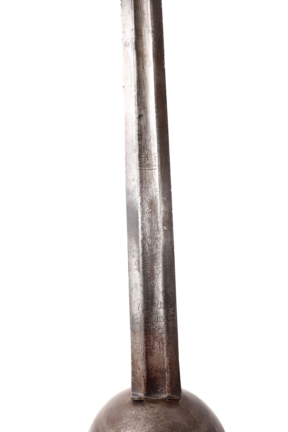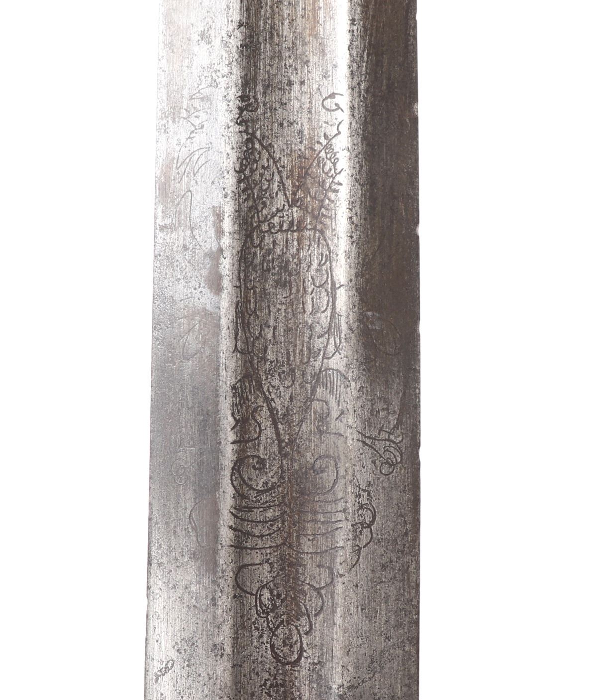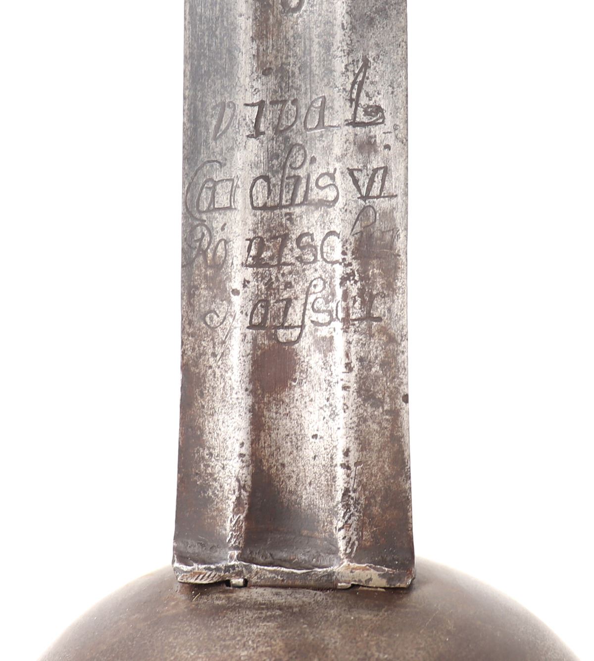 Age of Sail, spanish colonial cup hilt rapier with engraved broad blade. Large straight double-edged blade with central shallow wide fuller. Etched to the blade with partially legible inscription reading to one side "Viva La,…" and the other a date with possible reference to a King Ferdinand VI. Each surrounded by scenes of crowns, scrolling, double-headed eagle, and other heraldic symbols. Solid cup hilt guard with heavy roped steel edge. Well marked to the ricasso at either side with hallmark stamps. Wide straight quillion with flared scalloped ends. D-shaped hand guard with matching decoration. Turned steel twisted wire grip. Oval carved pommel, hand peened. Size 46" L, blade 37 1/2" L