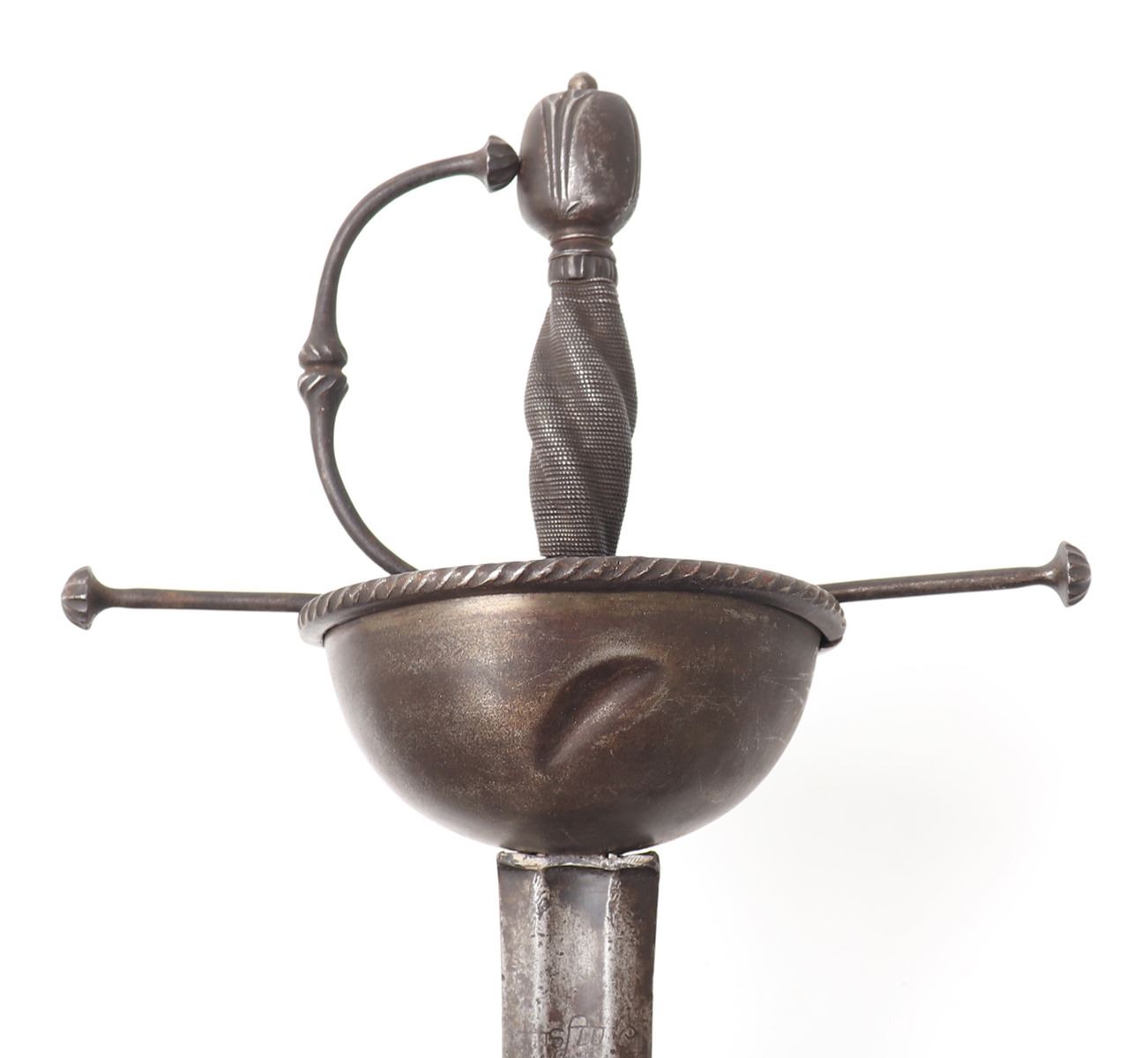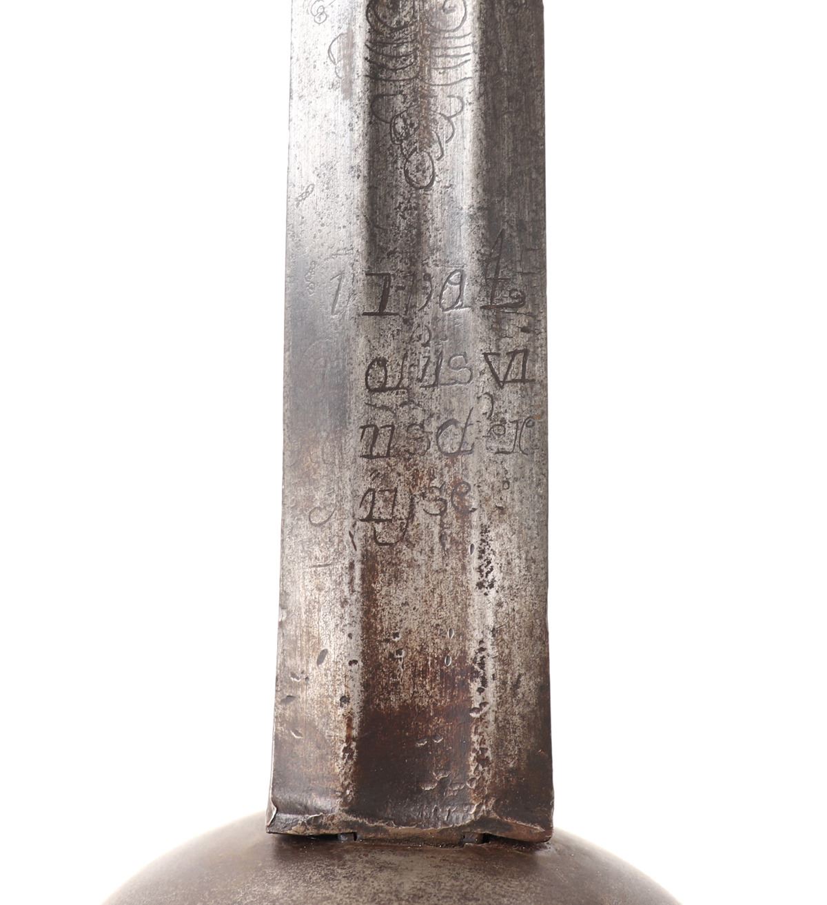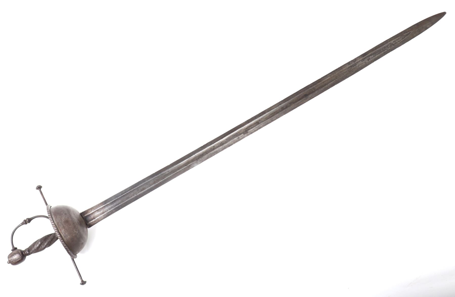 Age of Sail, spanish colonial cup hilt rapier with engraved broad blade. Large straight double-edged blade with central shallow wide fuller. Etched to the blade with partially legible inscription reading to one side "Viva La,…" and the other a date with possible reference to a King Ferdinand VI. Each surrounded by scenes of crowns, scrolling, double-headed eagle, and other heraldic symbols. Solid cup hilt guard with heavy roped steel edge. Well marked to the ricasso at either side with hallmark stamps. Wide straight quillion with flared scalloped ends. D-shaped hand guard with matching decoration. Turned steel twisted wire grip. Oval carved pommel, hand peened. Size 46" L, blade 37 1/2" L