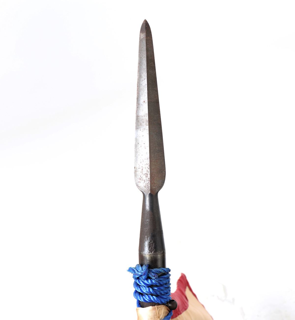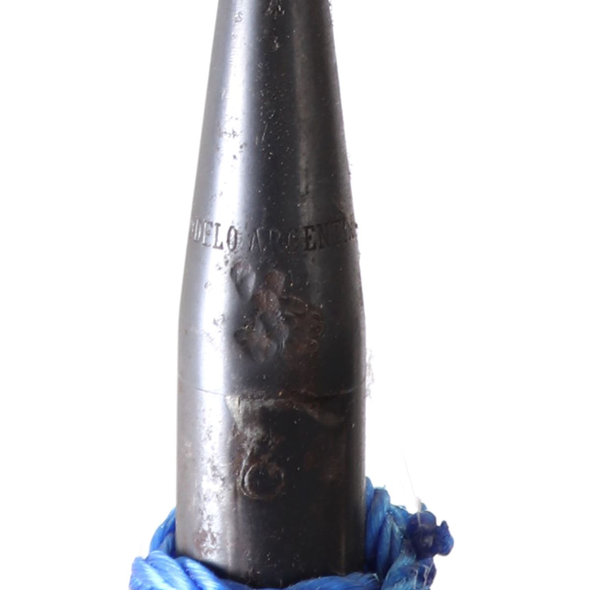 Great group Lot of (5) Infantry pike pole arms from the world famous Higgin Armory Museum. The Spiked polearms in all-steel. Argentina Model 1895 steel cavalry lances issued in WWI, made in Germany. Flags in silk of various colors including beige with red, purple with beige, red with blue trim, and blue with red trim. Poles with stamped markings and dates to the base of the spike. Spikes to the lower sections and grips with typical chipping or losses. Size Tip 11" L, Full 125 3/4" L. Provenance: Ex-Southern California Collection, Ex-Higgins Armory Museum Collection