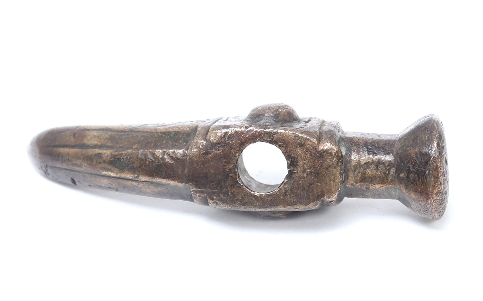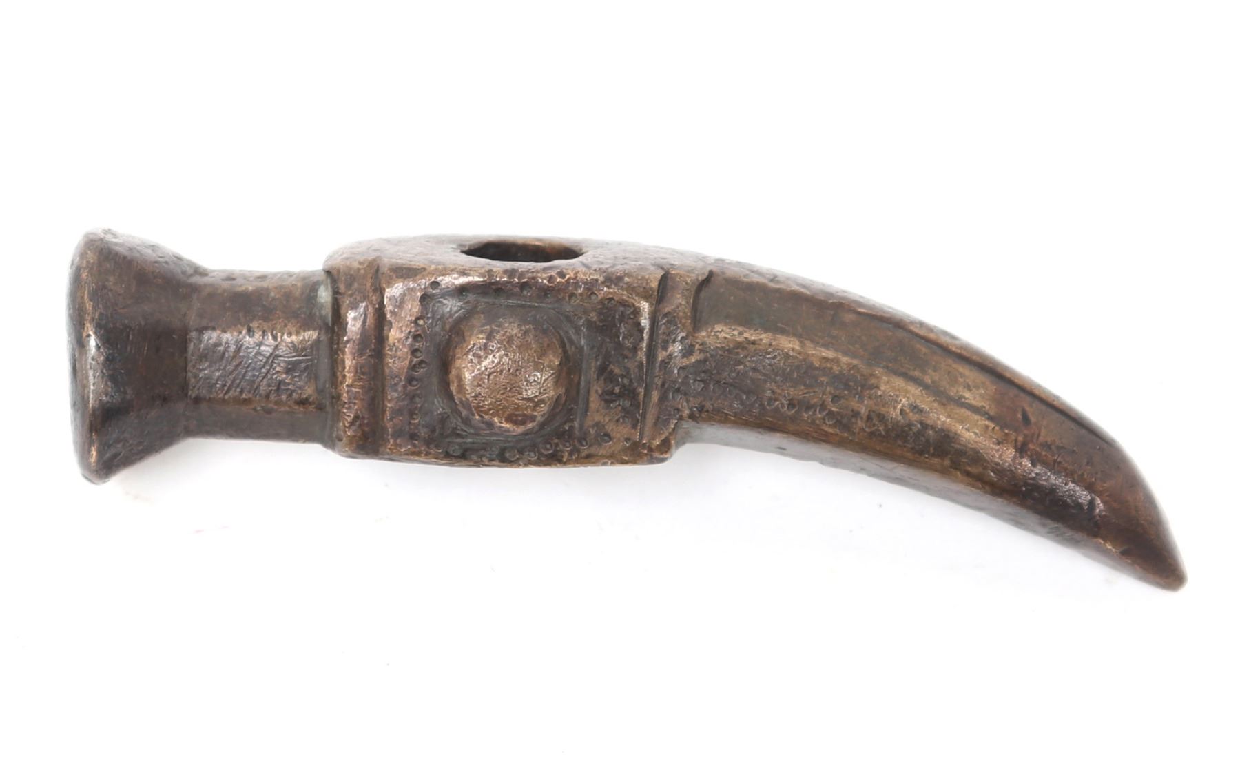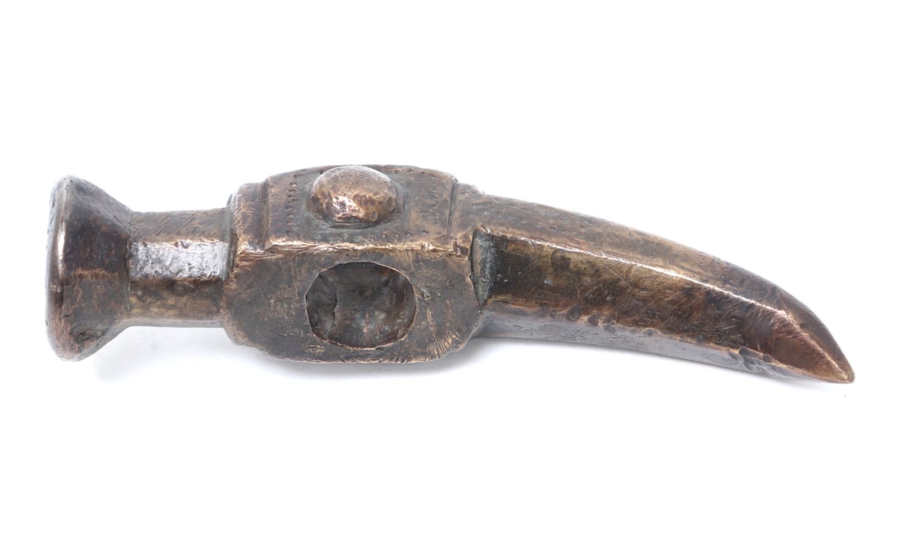 Turkey, Ottoman Empire 16th century for use as a war hammer or horseman's pick in bronze. Round flared hammer side with a square body pierced to the center with a bulbous semicircle decoration at either side. Reverse a curved spike multisided spike. Size 4 1/2" L. Provenance: Ex-USA Collection