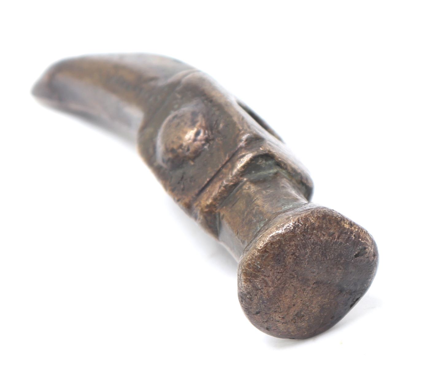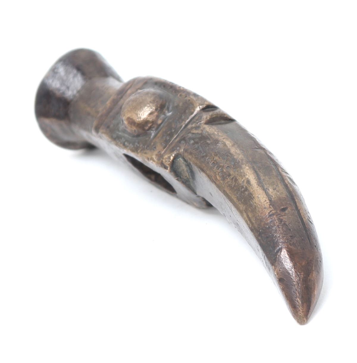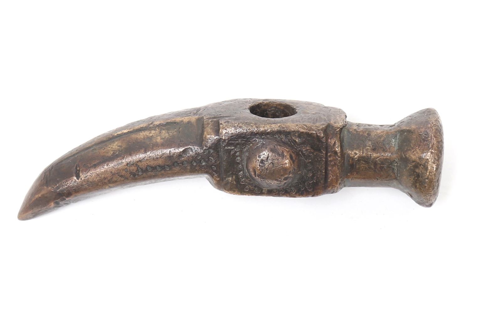 Turkey, Ottoman Empire 16th century for use as a war hammer or horseman's pick in bronze. Round flared hammer side with a square body pierced to the center with a bulbous semicircle decoration at either side. Reverse a curved spike multisided spike. Size 4 1/2" L. Provenance: Ex-USA Collection