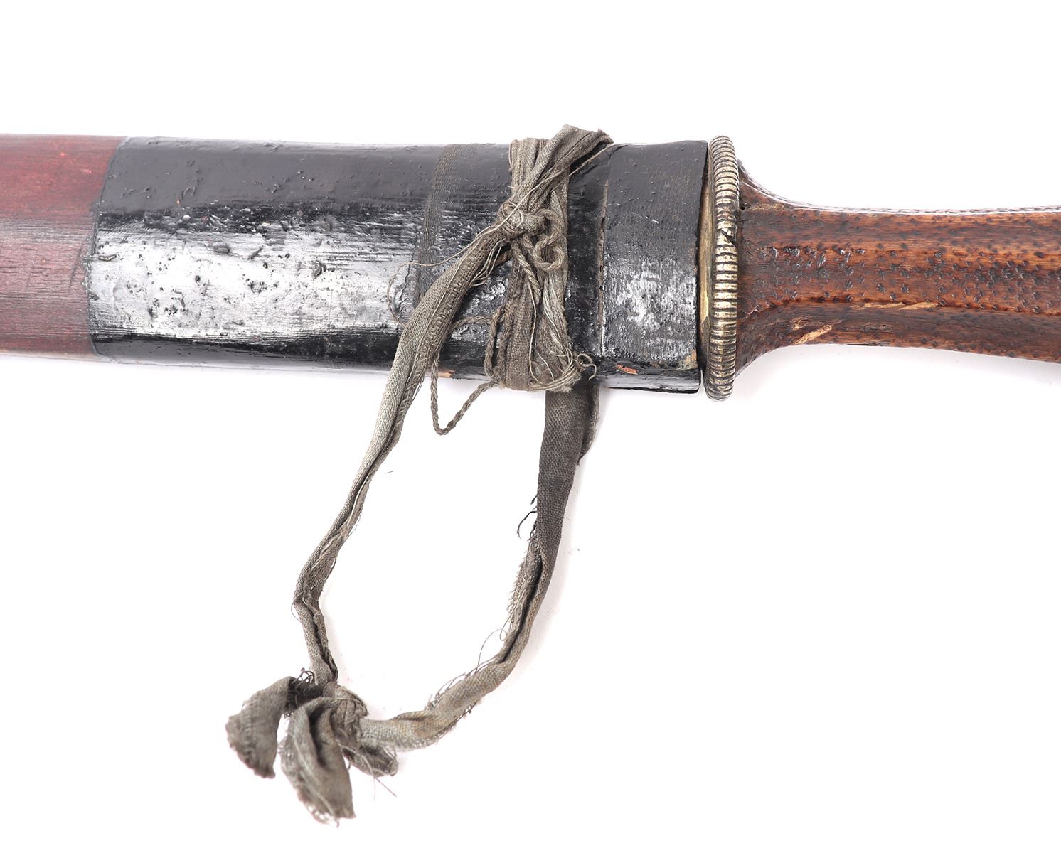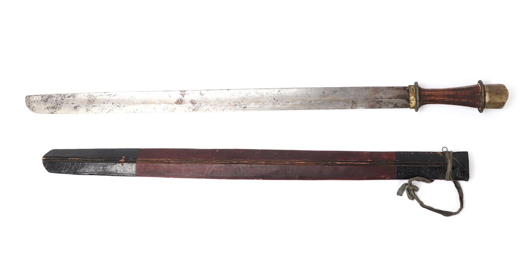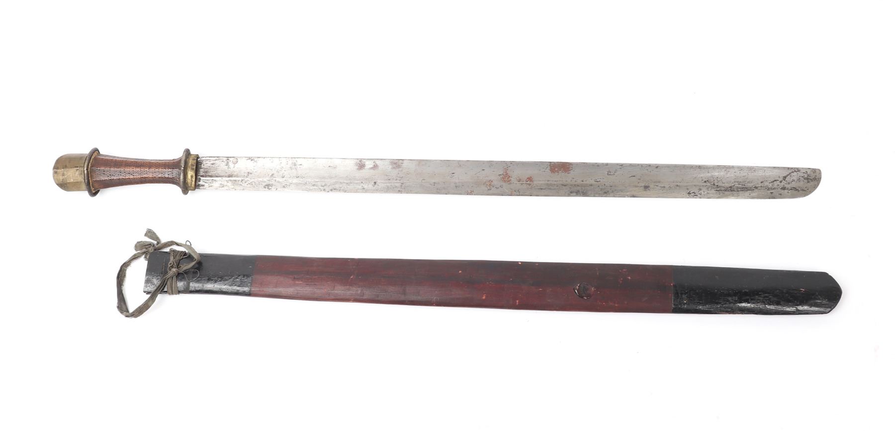 Tibetan Plateau, early Tibet long sword 19th century in traditional form with scabbard in red with painted black foux mounts, strung to the top as a belt loop. The sword with a wide straight single edged blade that curves upward at the tip and features a lightly raised ridge. The handle in brass to the base and pommel with a single band of foux wound spring decoration and the grip in wood with a stippled pattern in bands. Size 33 1/4" L, blade 25 5/8"