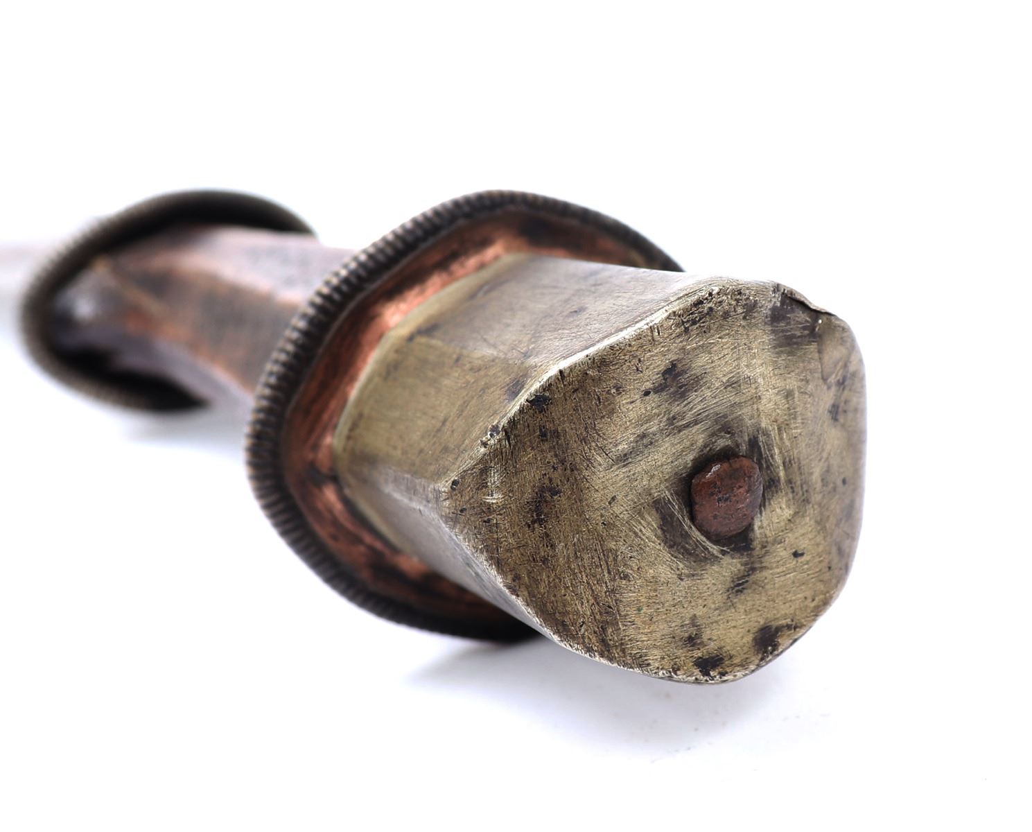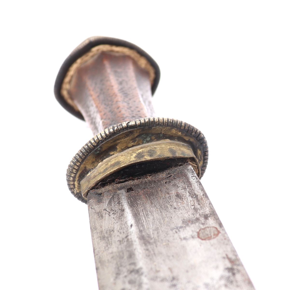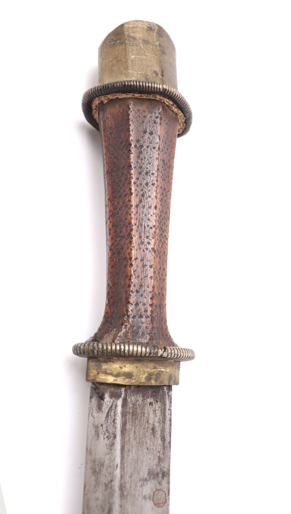 Tibetan Plateau, early Tibet long sword 19th century in traditional form with scabbard in red with painted black foux mounts, strung to the top as a belt loop. The sword with a wide straight single edged blade that curves upward at the tip and features a lightly raised ridge. The handle in brass to the base and pommel with a single band of foux wound spring decoration and the grip in wood with a stippled pattern in bands. Size 33 1/4" L, blade 25 5/8"