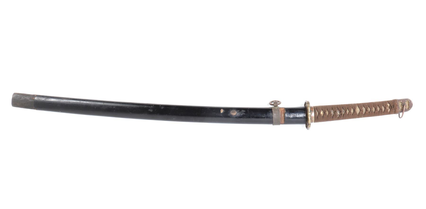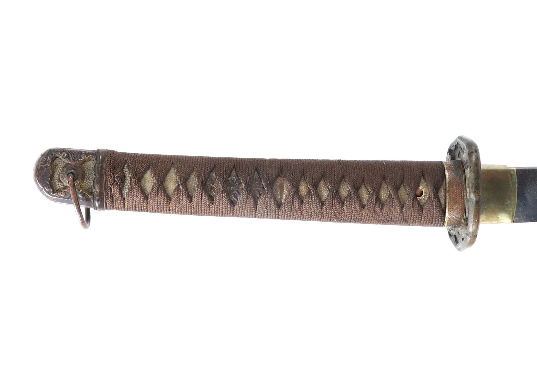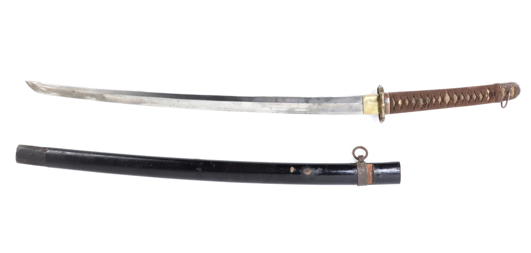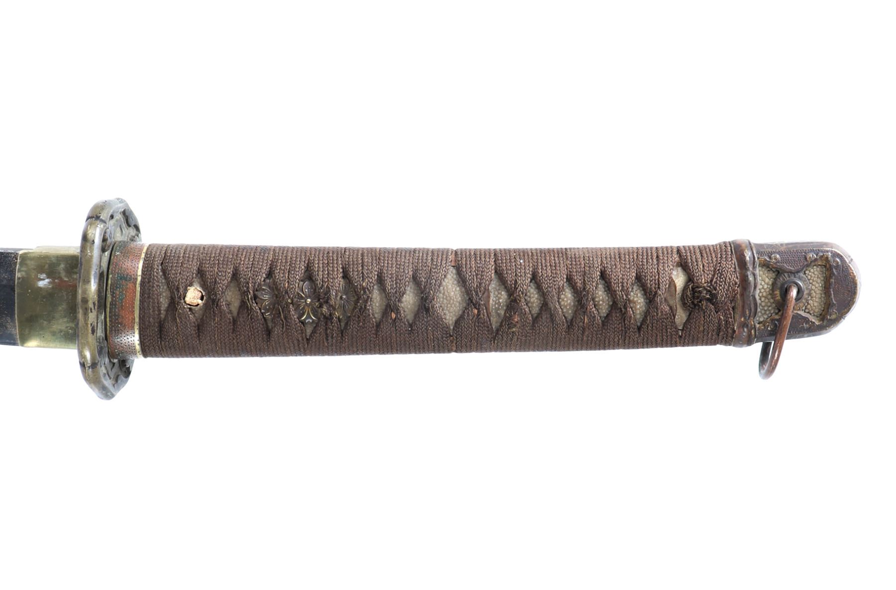 Japanese army officers sword and scabbard. Blade single edge slightly curved with cascading wave Hamon temper line probably Gunome zigzag style. Gunto mounts to tsuba and Kashira. Ray skin grip with brown wrapped cotton over. Menuki matching to mounts. Size 37 1/4" L, blade 25 3/4" L, Not Signed. Condition: Loss to scabbard lacquer, scabbard missing endcap with crack at end. Other wear from age and use.. Provenance: Ex-Los Angeles Estate