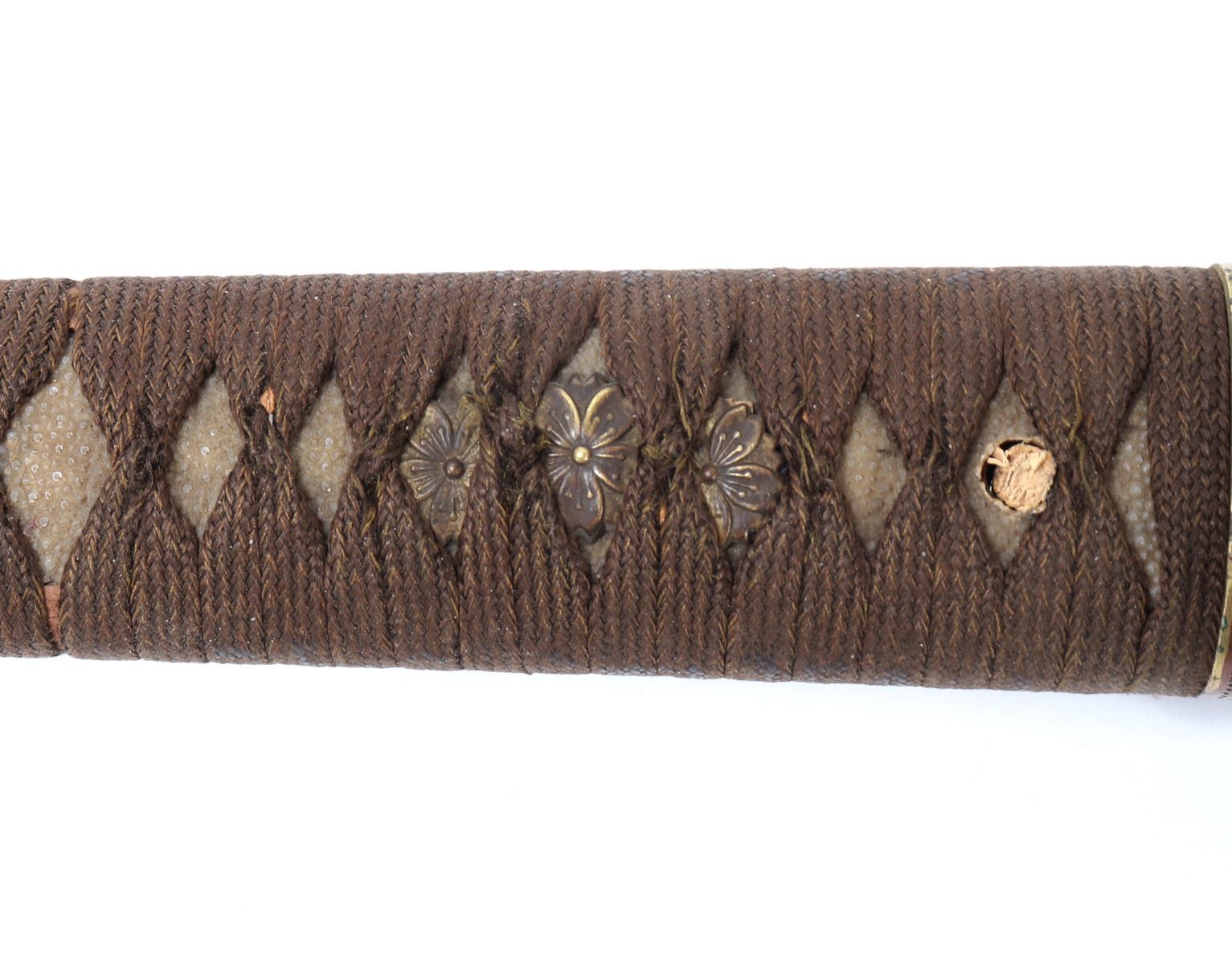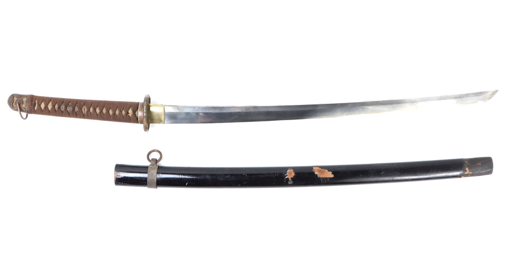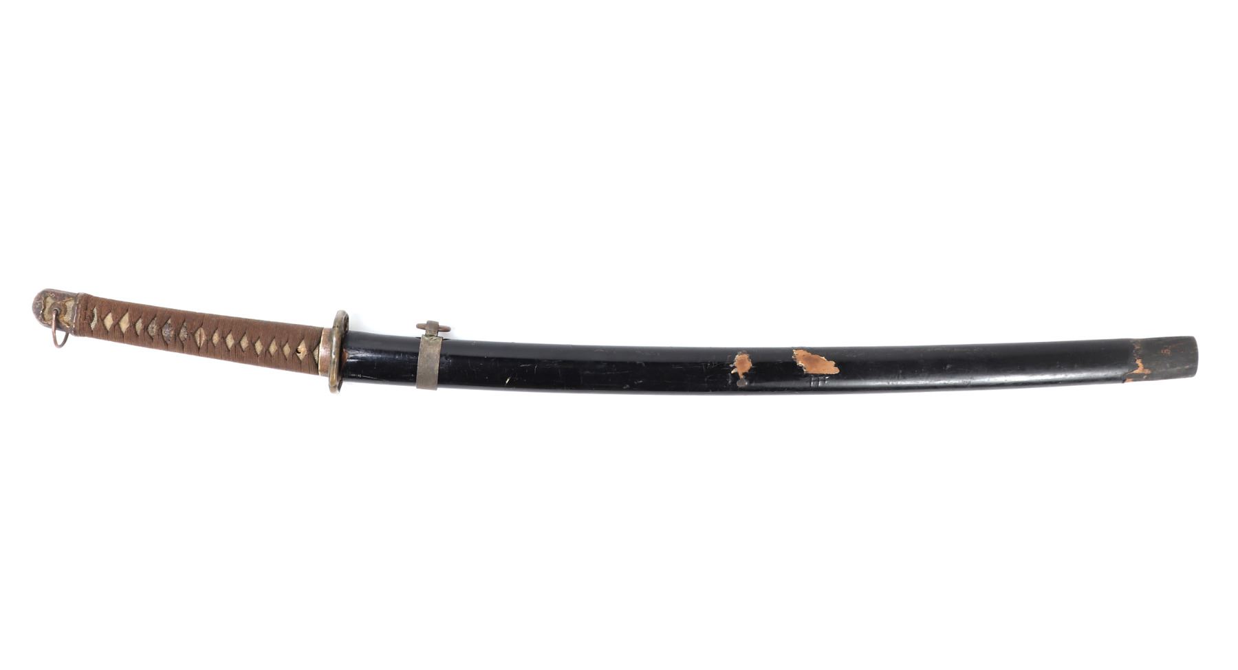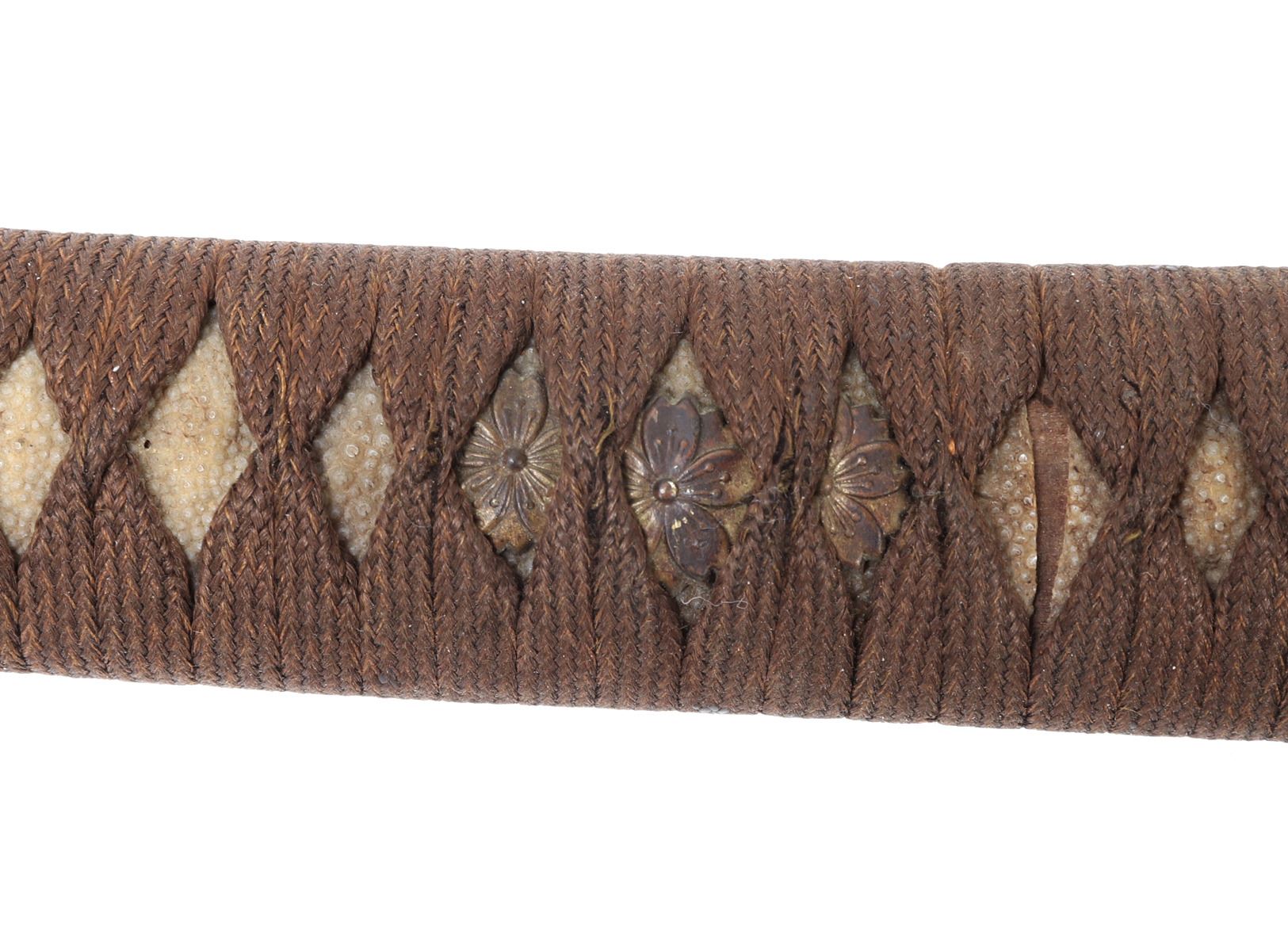 Japanese army officers sword and scabbard. Blade single edge slightly curved with cascading wave Hamon temper line probably Gunome zigzag style. Gunto mounts to tsuba and Kashira. Ray skin grip with brown wrapped cotton over. Menuki matching to mounts. Size 37 1/4" L, blade 25 3/4" L, Not Signed. Condition: Loss to scabbard lacquer, scabbard missing endcap with crack at end. Other wear from age and use.. Provenance: Ex-Los Angeles Estate
