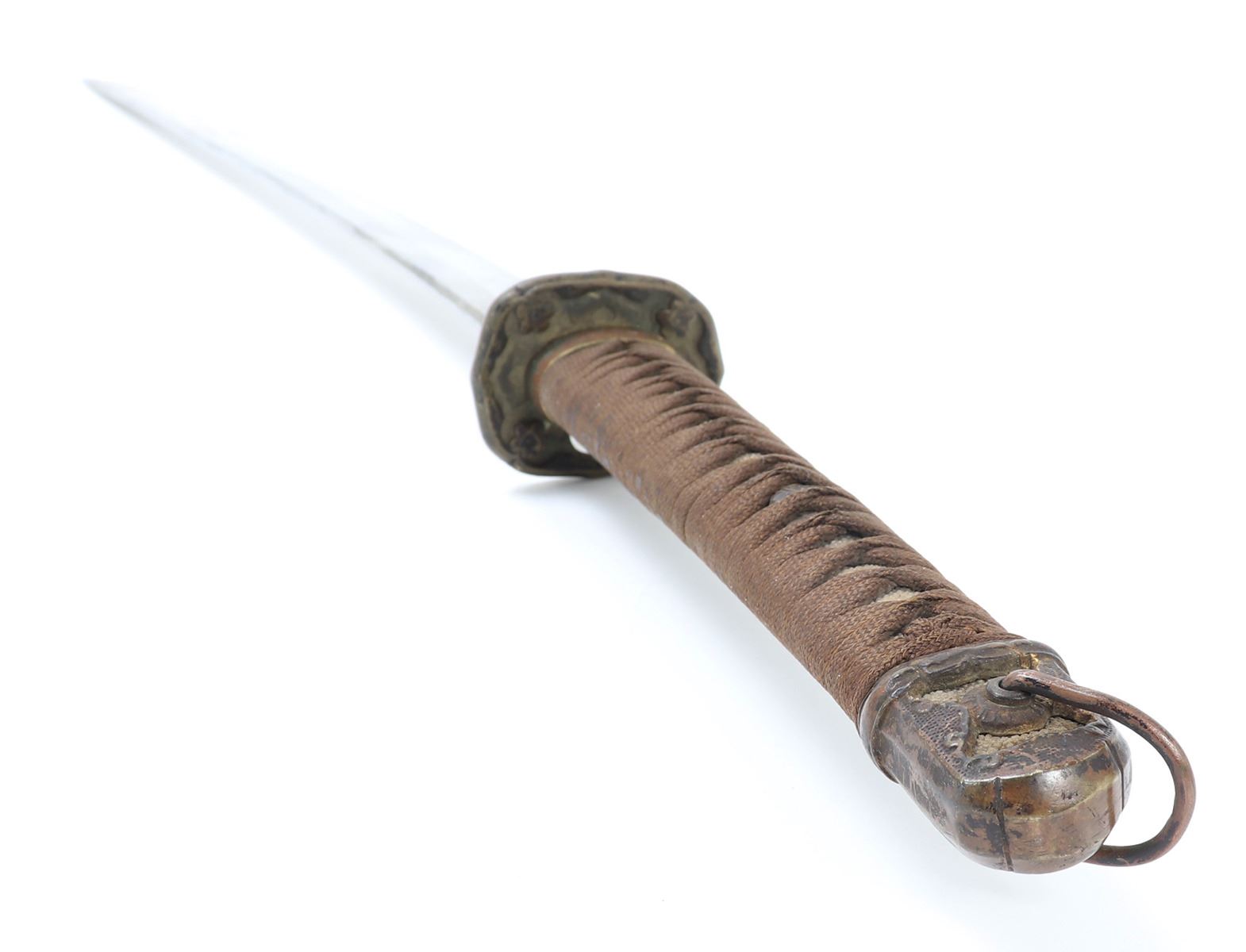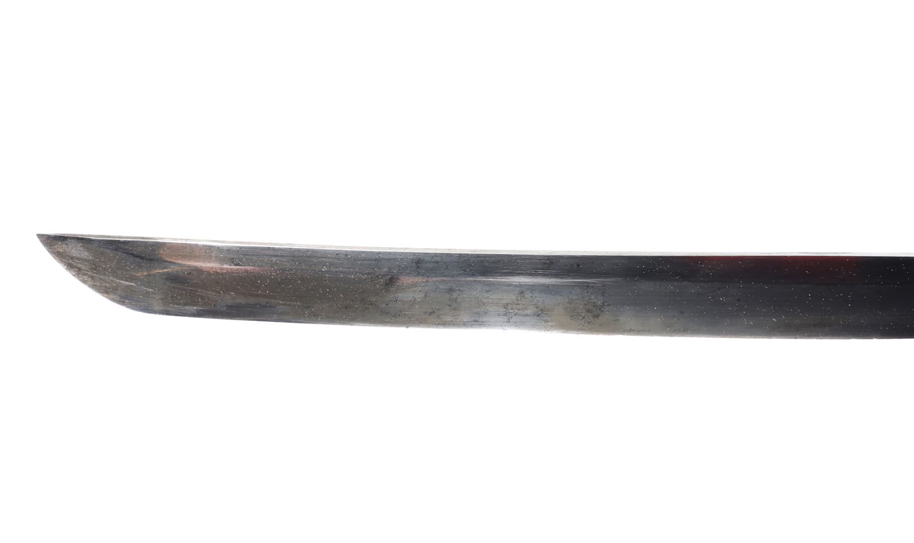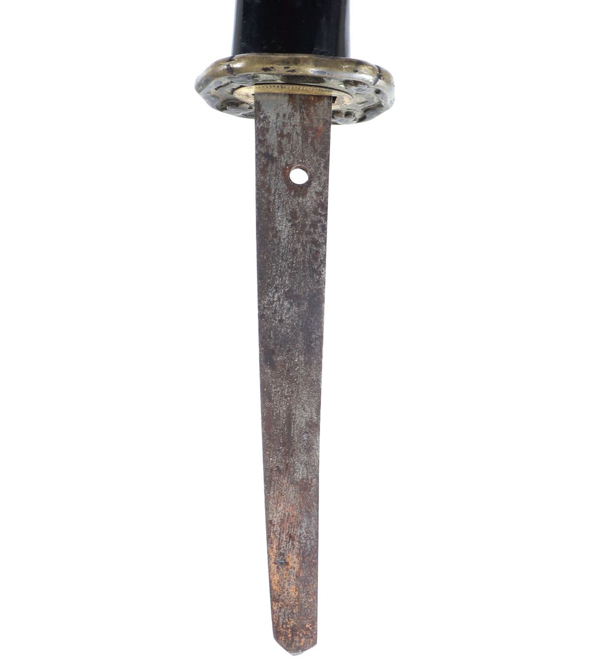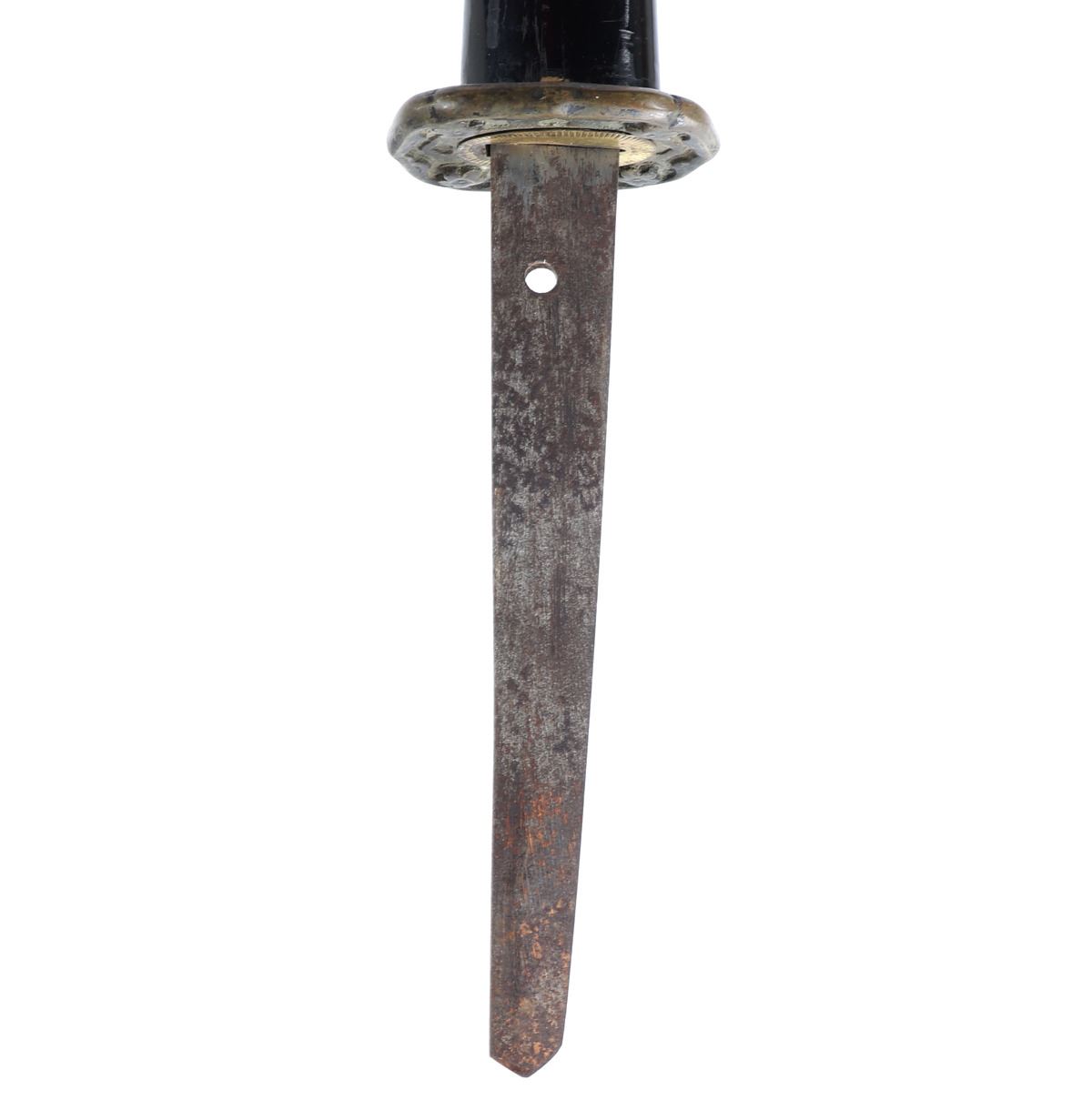 Japanese army officers sword and scabbard. Blade single edge slightly curved with cascading wave Hamon temper line probably Gunome zigzag style. Gunto mounts to tsuba and Kashira. Ray skin grip with brown wrapped cotton over. Menuki matching to mounts. Size 37 1/4" L, blade 25 3/4" L, Not Signed. Condition: Loss to scabbard lacquer, scabbard missing endcap with crack at end. Other wear from age and use.. Provenance: Ex-Los Angeles Estate