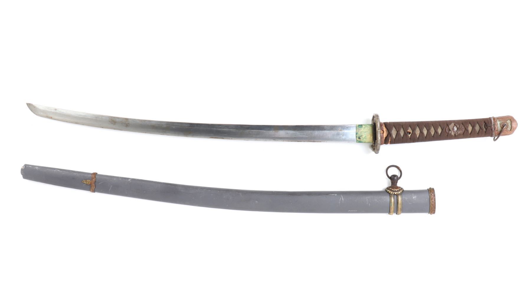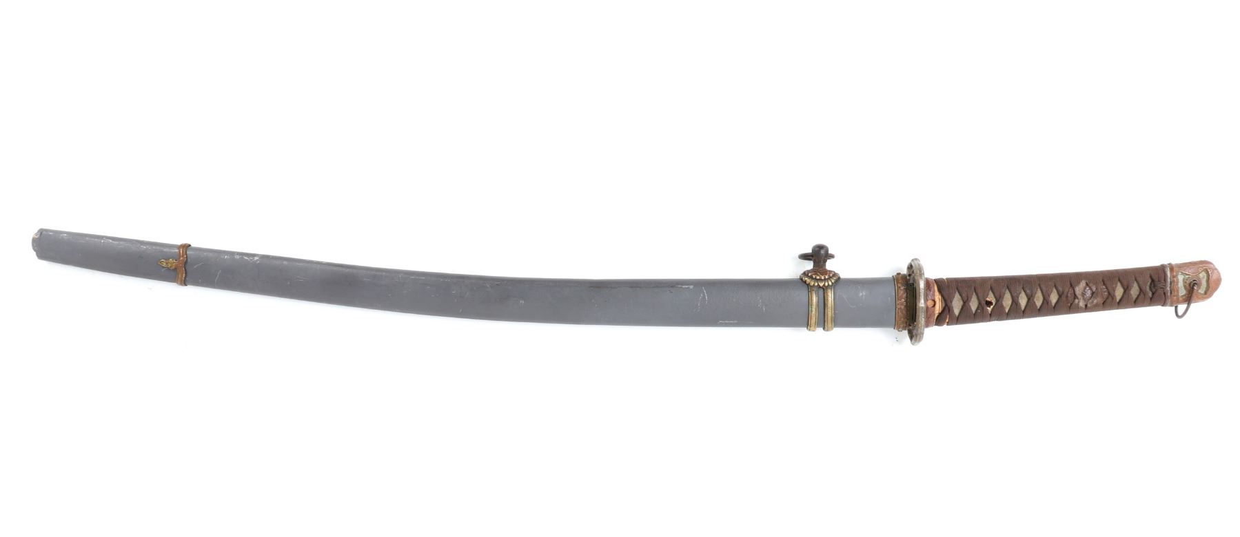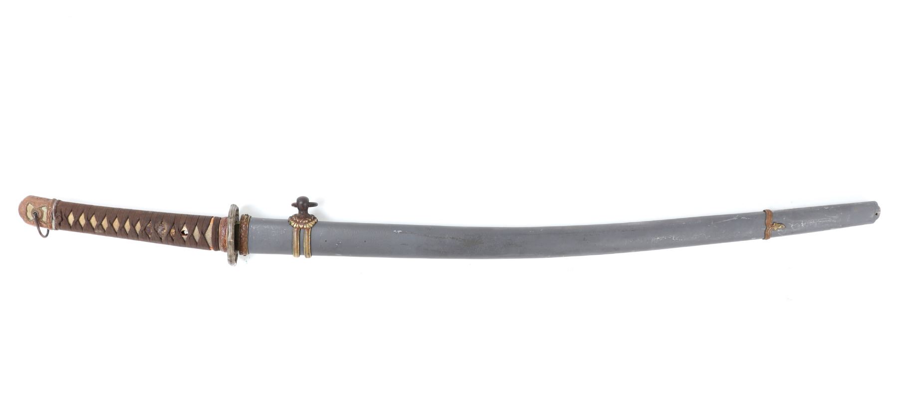 Japanese army officers gunto sword and scabbard. Single edge blade with slight curve. Cast metal tsuba in brass with four flowers to either side. Unsigned to the tang of the blade. Handle in ray skin wrap with twisted cotton over. Sleeve fitting with floral decoration matching Gunto style mounts. Scabbard in grey finish and gilt mounts. Size 39 1/4" L, Blade 25" L. Condition: Brass blade collar with oxidation and discoloration, other minor wear as shown.. Provenance: Ex-Los Angeles Estate