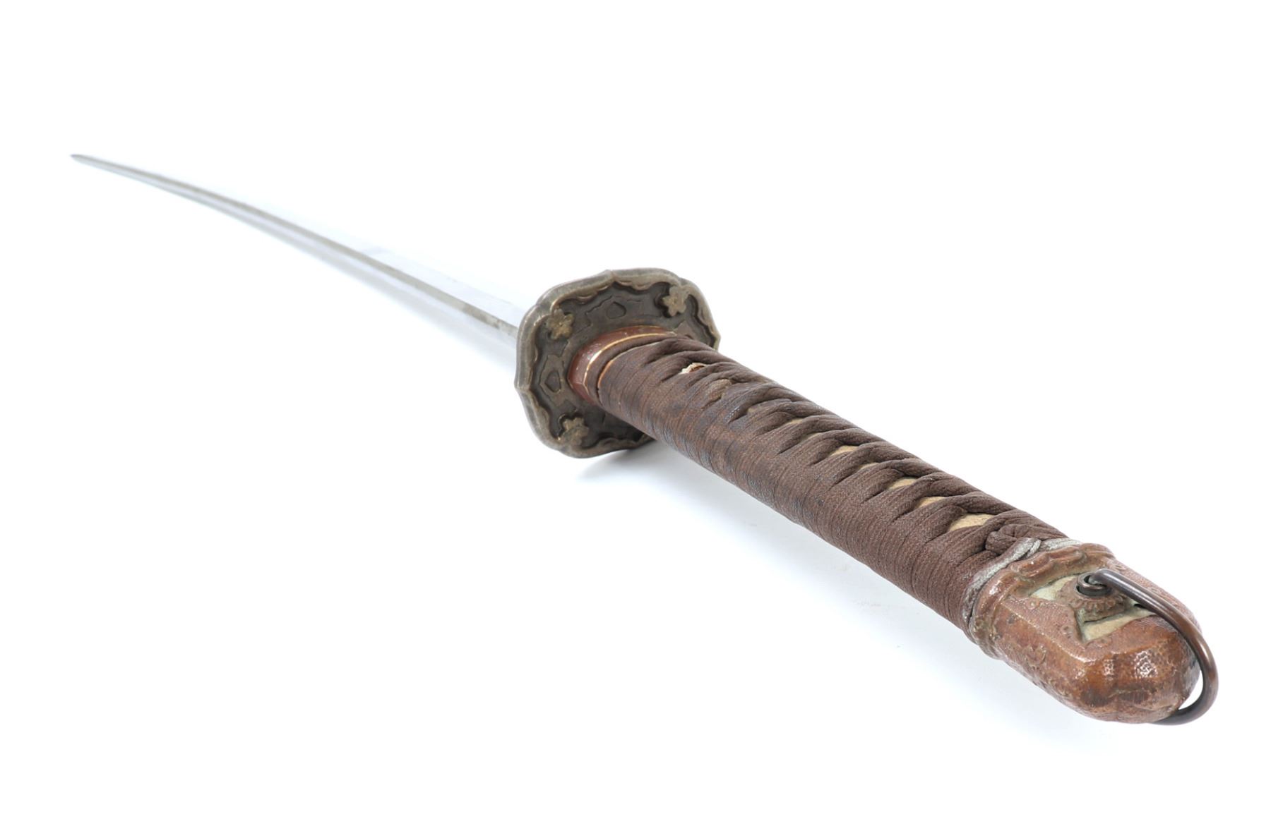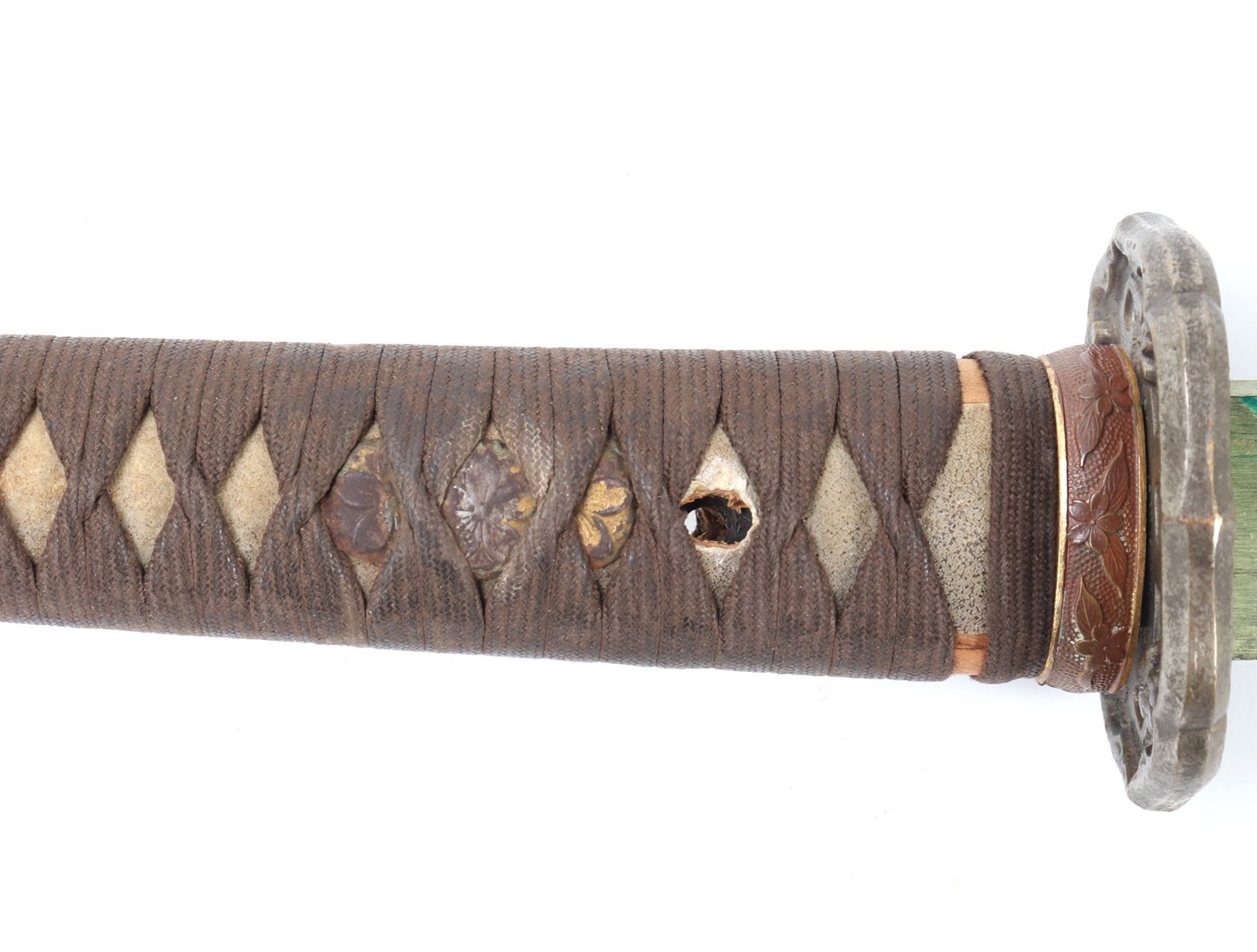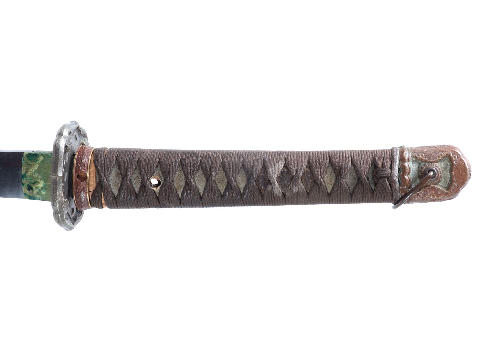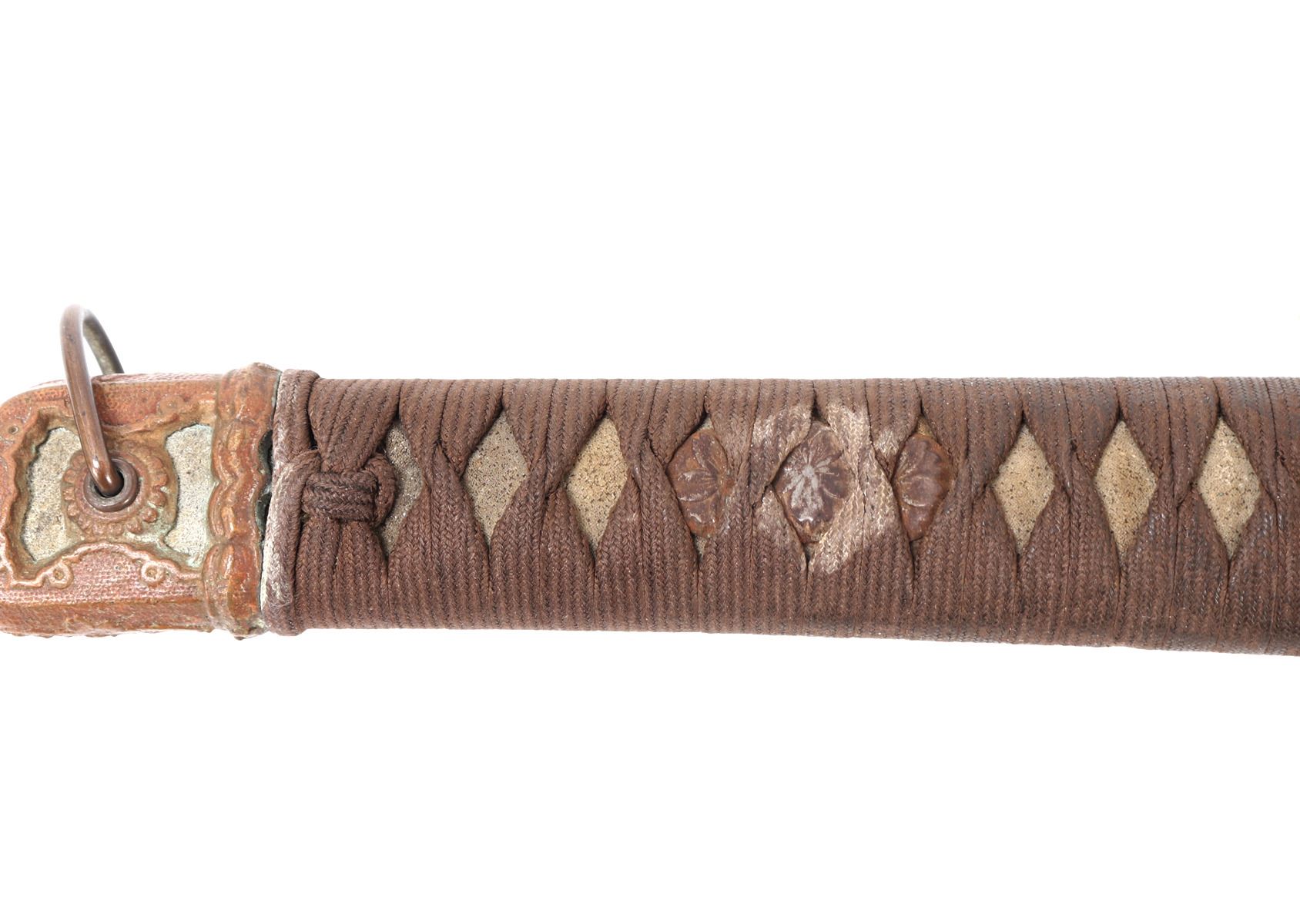 Japanese army officers gunto sword and scabbard. Single edge blade with slight curve. Cast metal tsuba in brass with four flowers to either side. Unsigned to the tang of the blade. Handle in ray skin wrap with twisted cotton over. Sleeve fitting with floral decoration matching Gunto style mounts. Scabbard in grey finish and gilt mounts. Size 39 1/4" L, Blade 25" L. Condition: Brass blade collar with oxidation and discoloration, other minor wear as shown.. Provenance: Ex-Los Angeles Estate