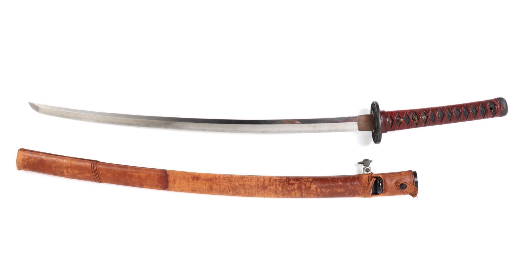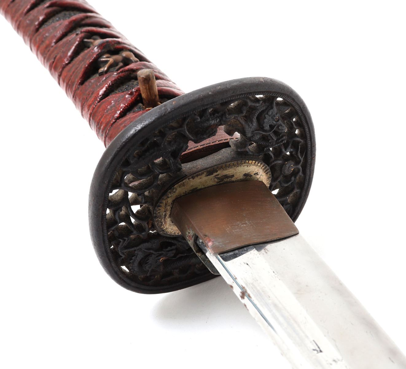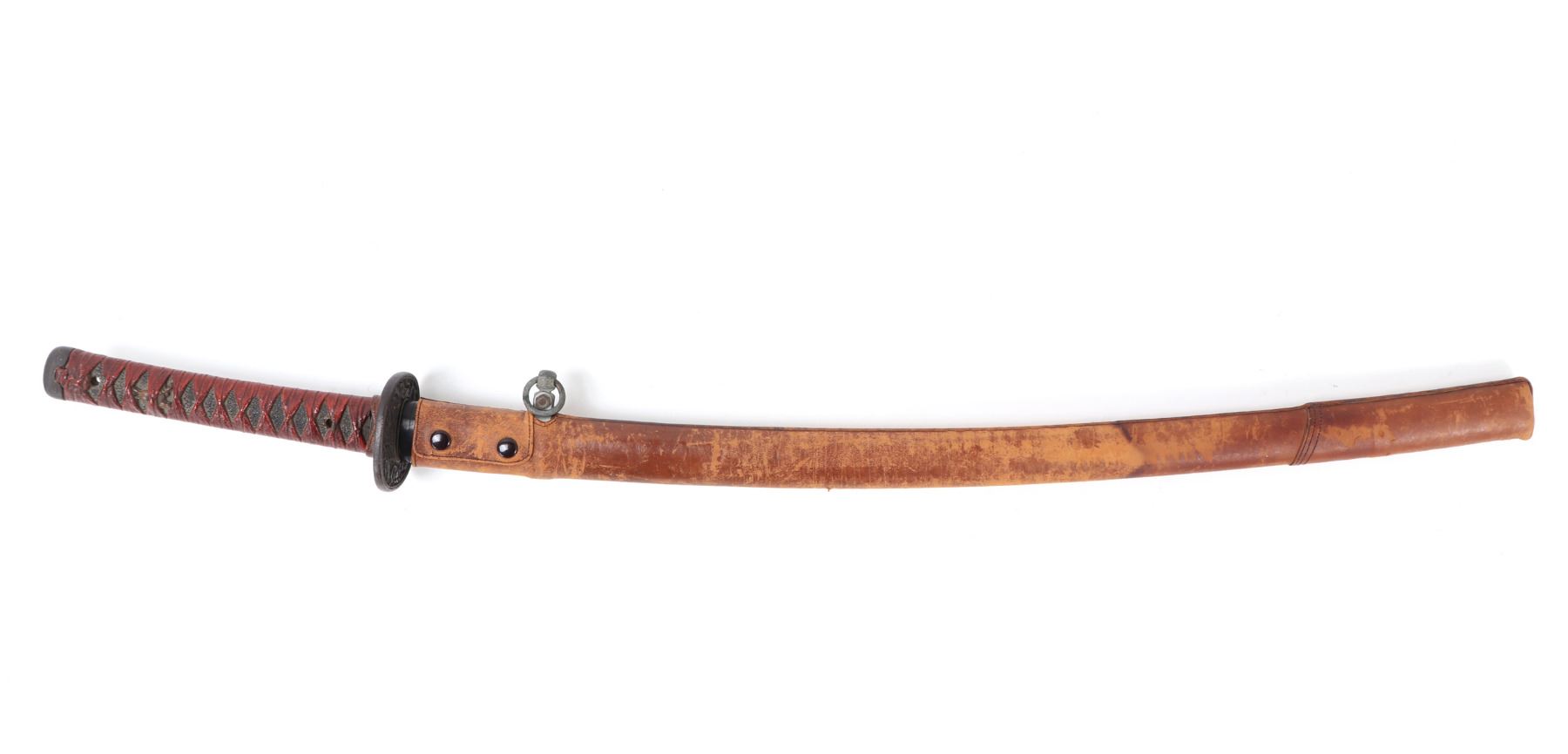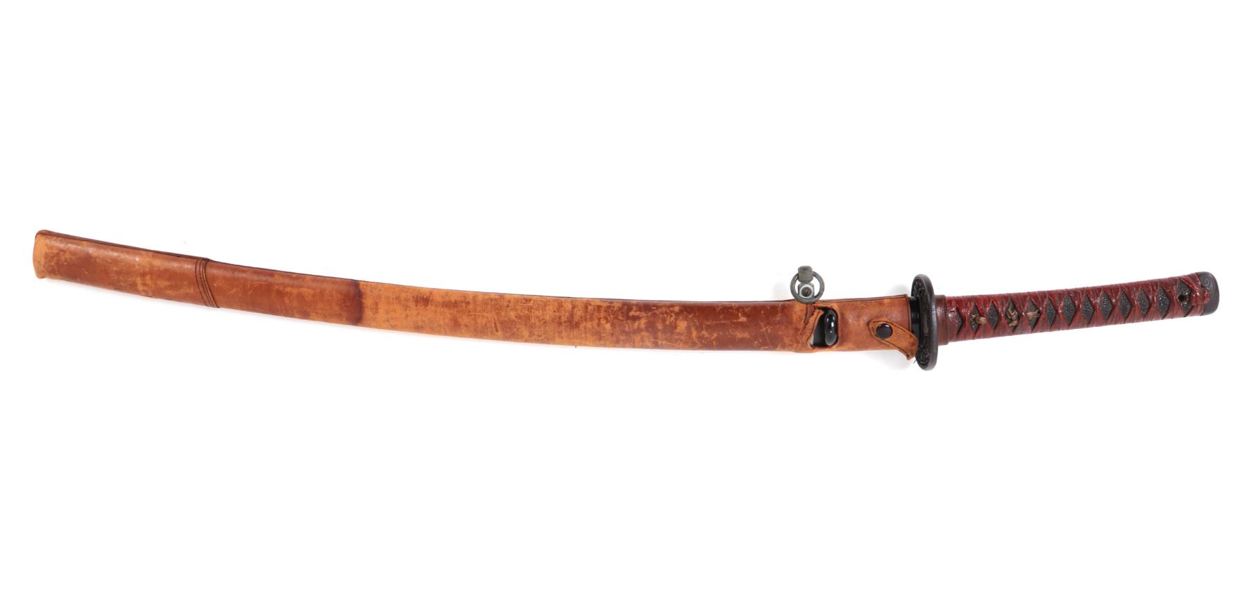 Japanese Type 98 Shin Gunto Katana sword with ancestral blade as used in WWII. Early war time tag reads (Swordsmith: Unknown, Kane ?, Age: Late Koto, ca 1590, Province: Mino, Honshu Island, Value: ca $50 to $100). Early curved single edge blade with Gunome Hamon temper, tang with excellent signs of patination and age Late Koto Period. Tsuka or handle with blackened ray-skin grip tightly wrapped in red lacquer. Menuki very well made relif cast horses with black lacquer highlights. Tsuba guard Maru Gata shape with wonderful pierced openwork depicting dragons and intricate. Scabbard with tan leather cover over a black lacquered scabbard. Size 38 3/4" L, Blade 25 3/4" L, Not Signed. Condition: Good condition overall with wear commensurate to age and use. Provenance: Ex-Southern California Estate