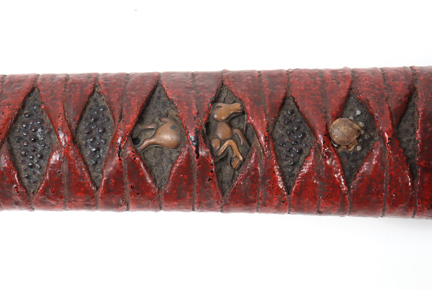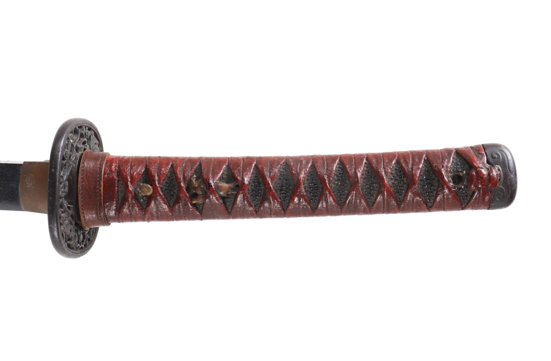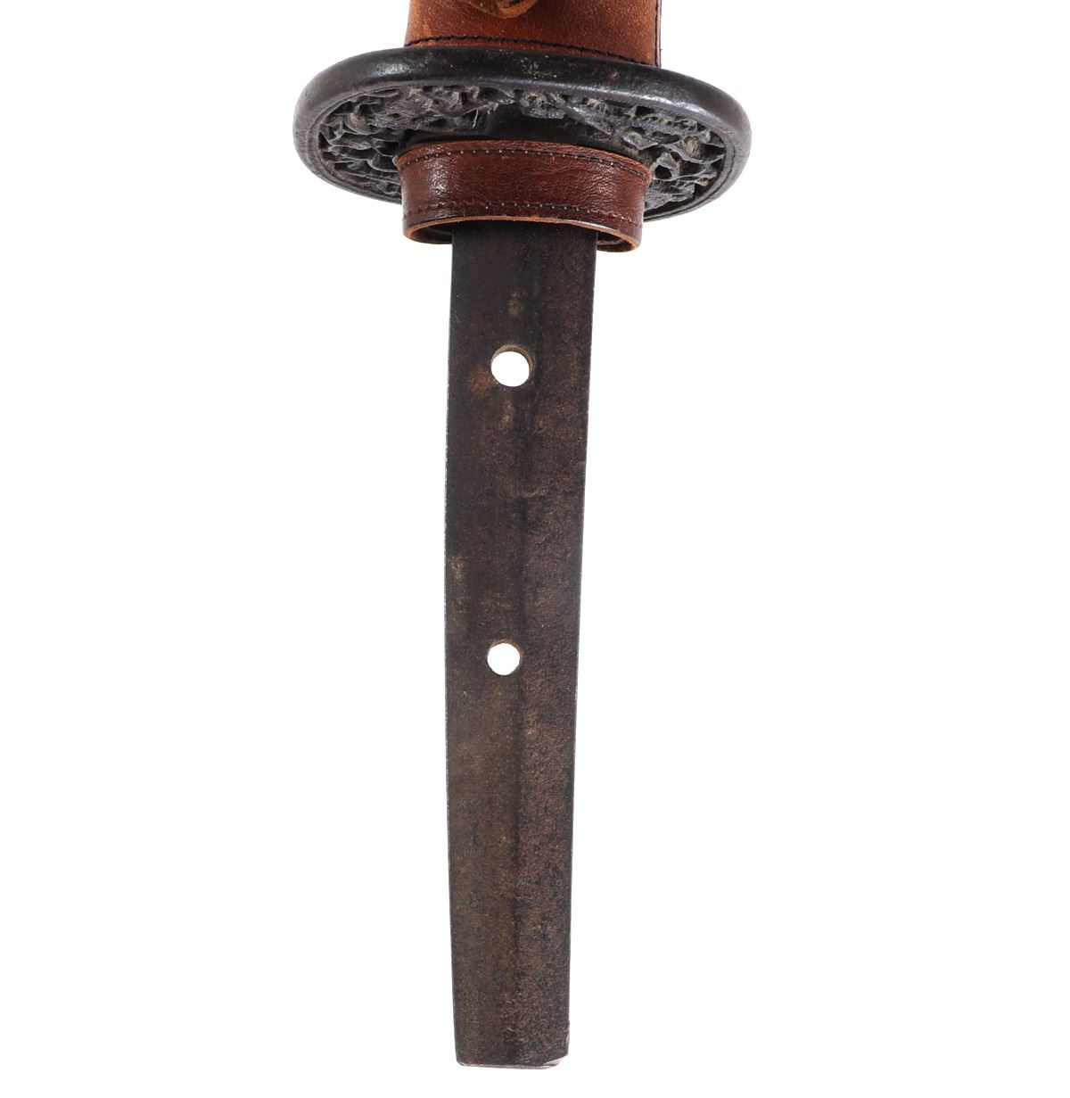 Japanese Type 98 Shin Gunto Katana sword with ancestral blade as used in WWII. Early war time tag reads (Swordsmith: Unknown, Kane ?, Age: Late Koto, ca 1590, Province: Mino, Honshu Island, Value: ca $50 to $100). Early curved single edge blade with Gunome Hamon temper, tang with excellent signs of patination and age Late Koto Period. Tsuka or handle with blackened ray-skin grip tightly wrapped in red lacquer. Menuki very well made relif cast horses with black lacquer highlights. Tsuba guard Maru Gata shape with wonderful pierced openwork depicting dragons and intricate. Scabbard with tan leather cover over a black lacquered scabbard. Size 38 3/4" L, Blade 25 3/4" L, Not Signed. Condition: Good condition overall with wear commensurate to age and use. Provenance: Ex-Southern California Estate