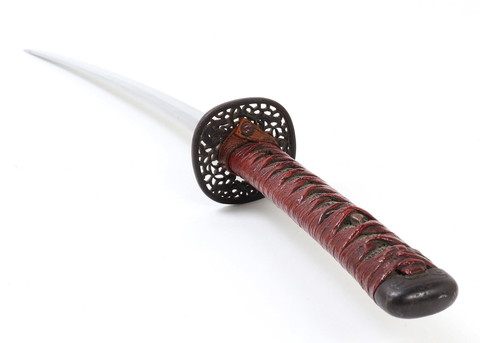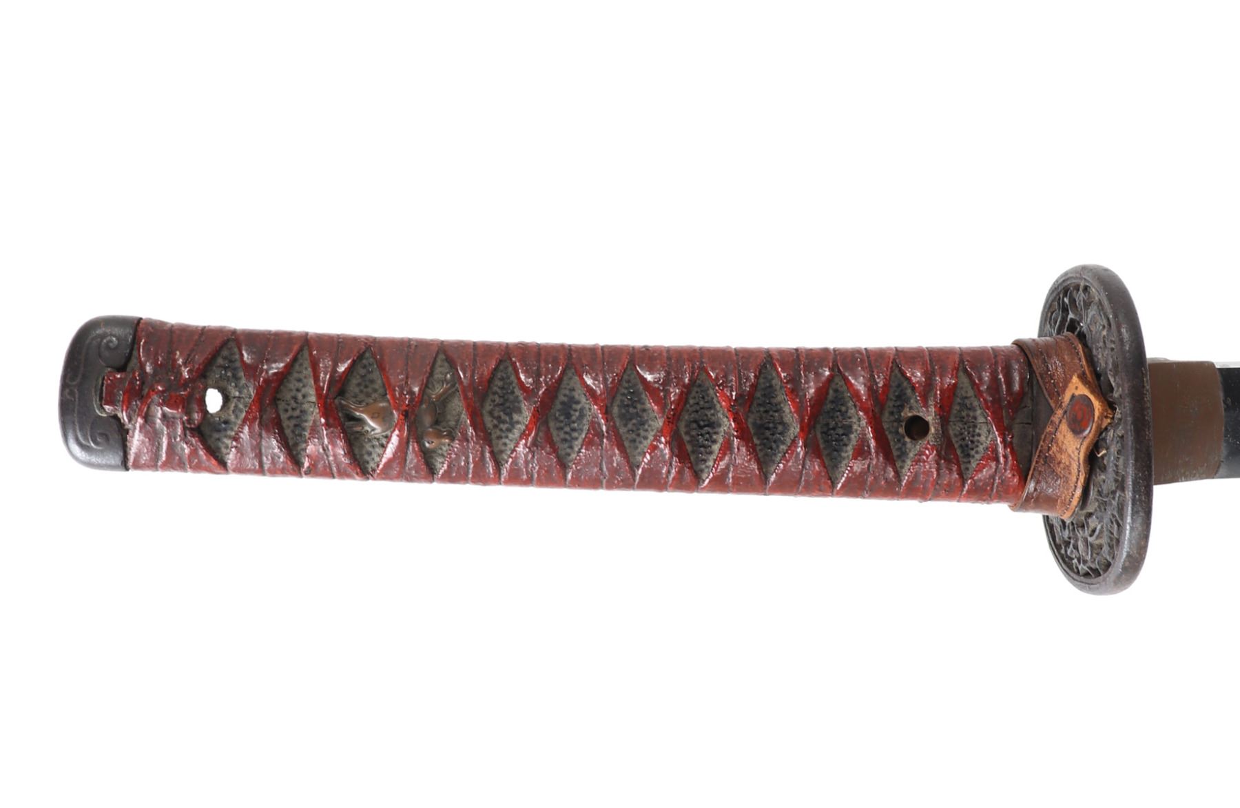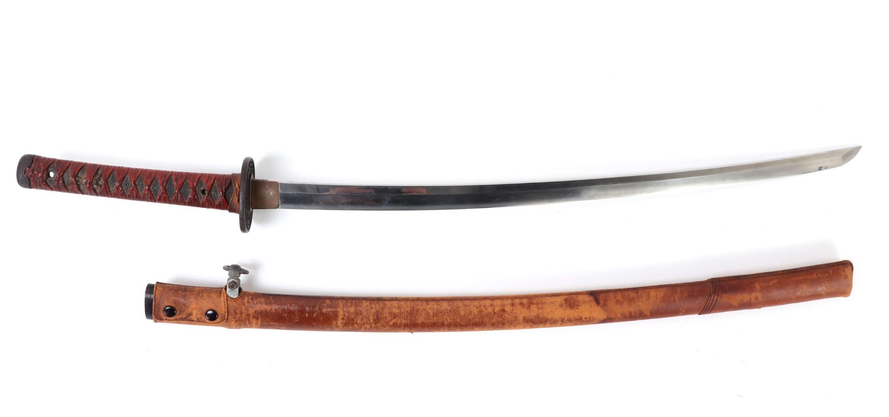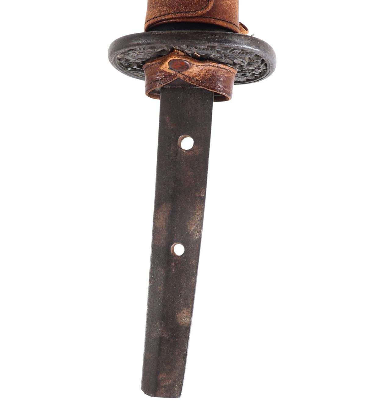 Japanese Type 98 Shin Gunto Katana sword with ancestral blade as used in WWII. Early war time tag reads (Swordsmith: Unknown, Kane ?, Age: Late Koto, ca 1590, Province: Mino, Honshu Island, Value: ca $50 to $100). Early curved single edge blade with Gunome Hamon temper, tang with excellent signs of patination and age Late Koto Period. Tsuka or handle with blackened ray-skin grip tightly wrapped in red lacquer. Menuki very well made relif cast horses with black lacquer highlights. Tsuba guard Maru Gata shape with wonderful pierced openwork depicting dragons and intricate. Scabbard with tan leather cover over a black lacquered scabbard. Size 38 3/4" L, Blade 25 3/4" L, Not Signed. Condition: Good condition overall with wear commensurate to age and use. Provenance: Ex-Southern California Estate
