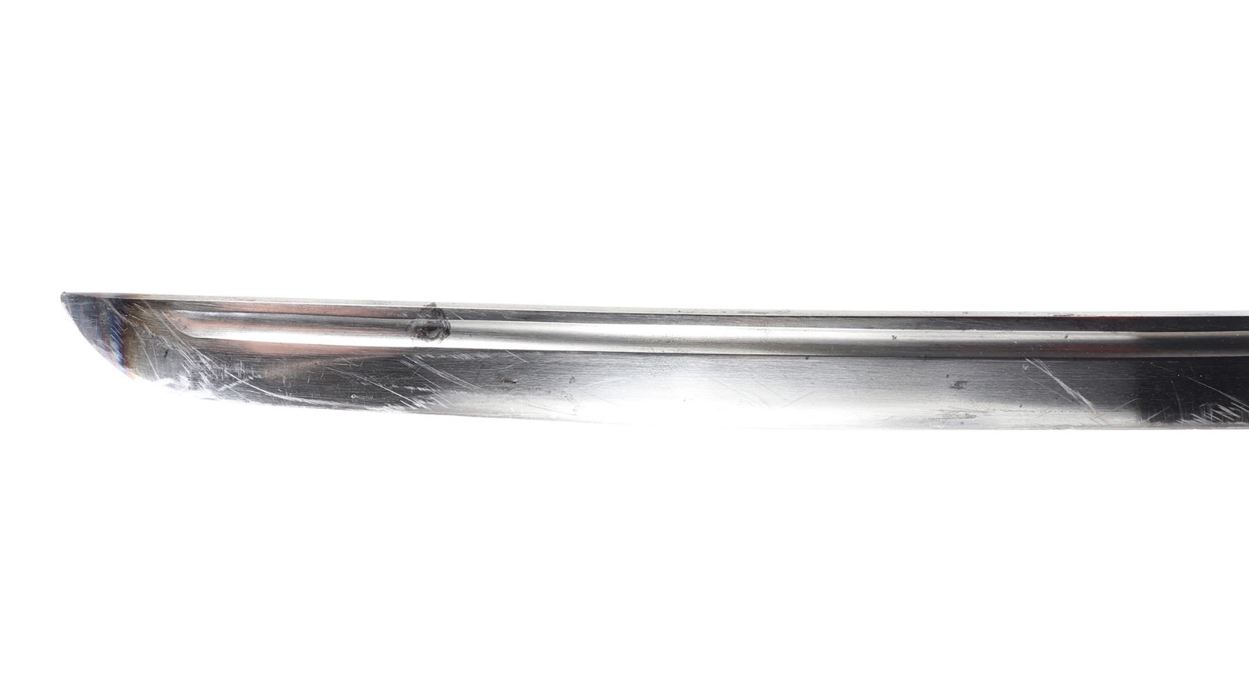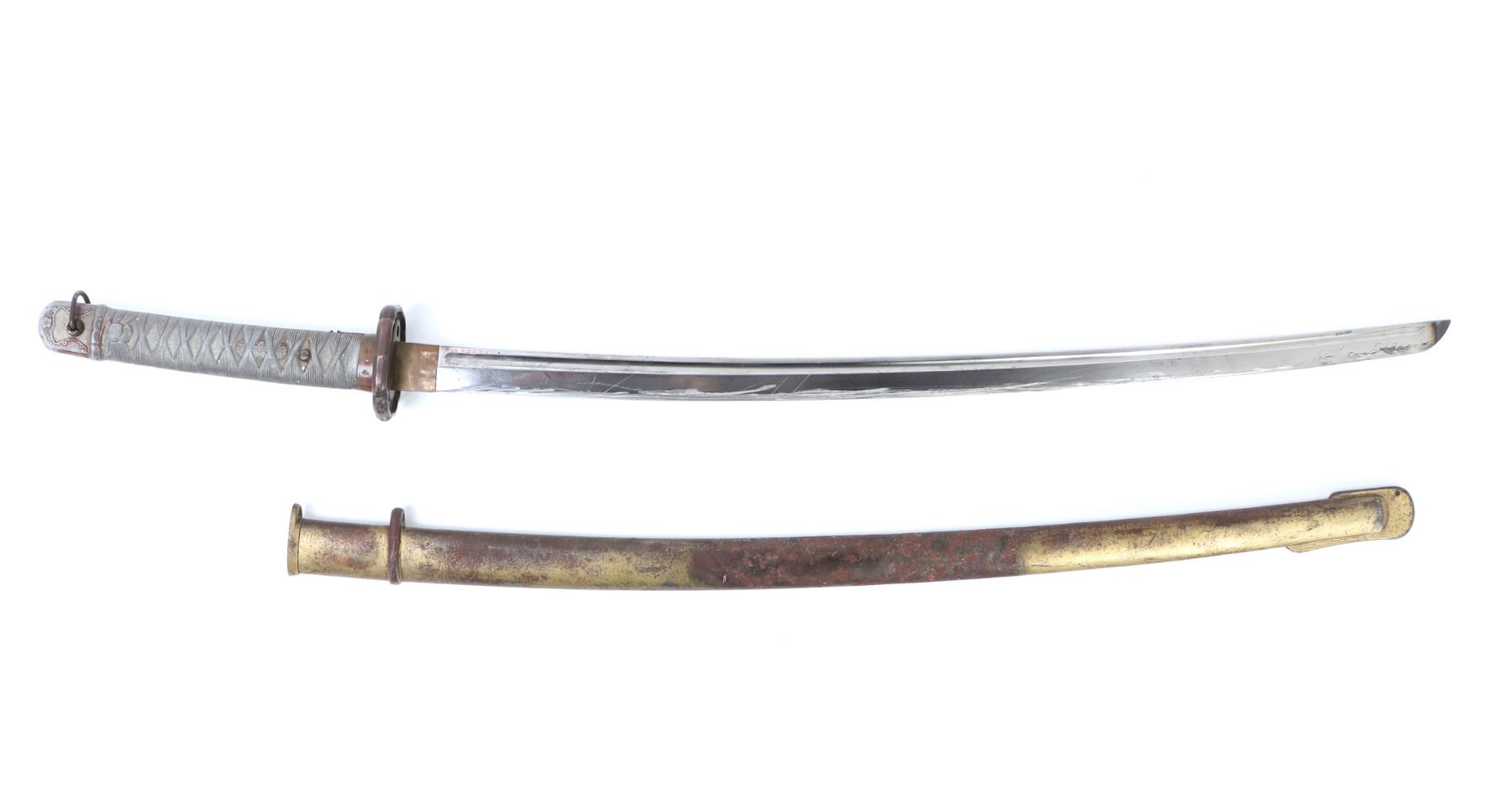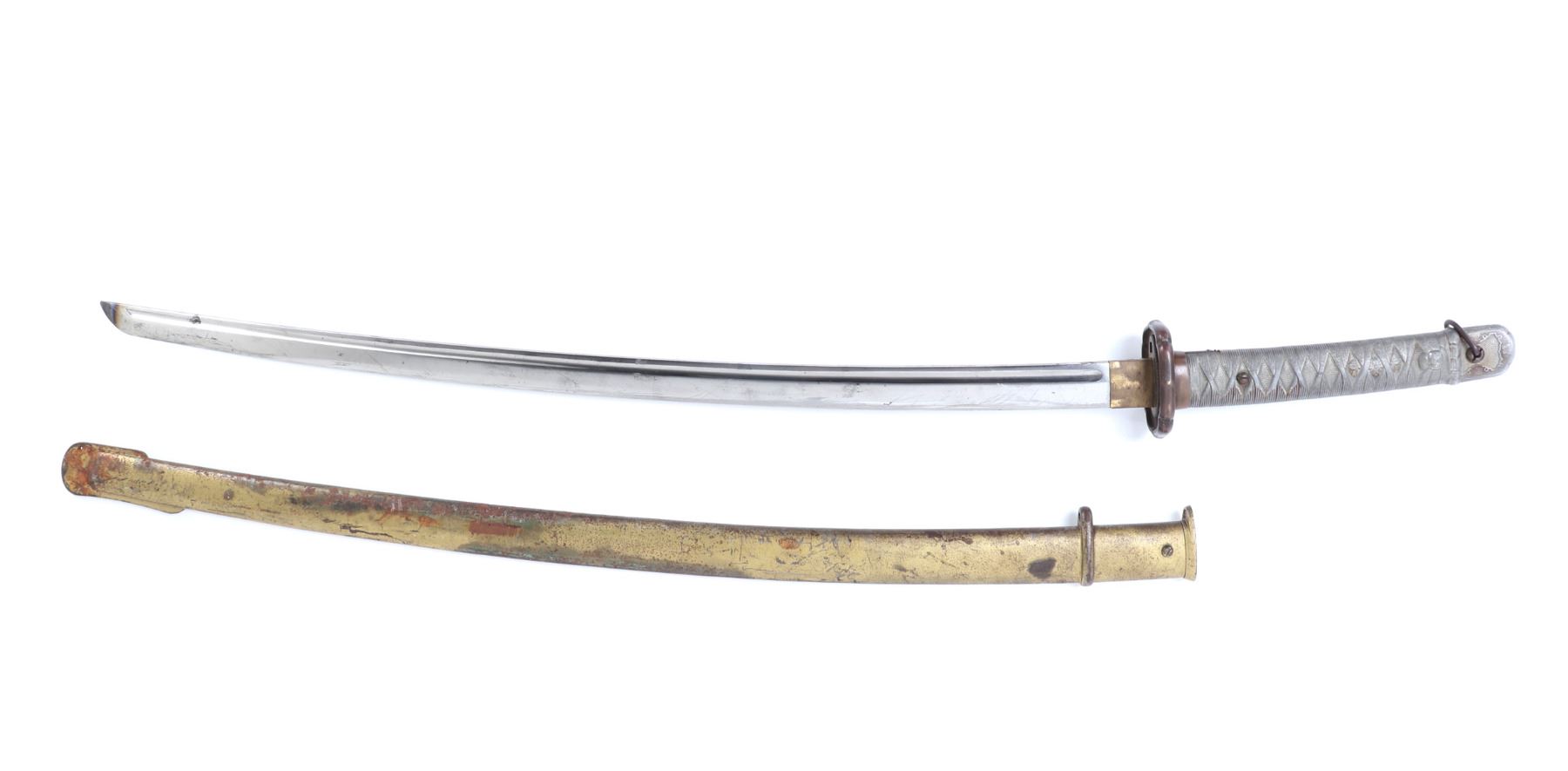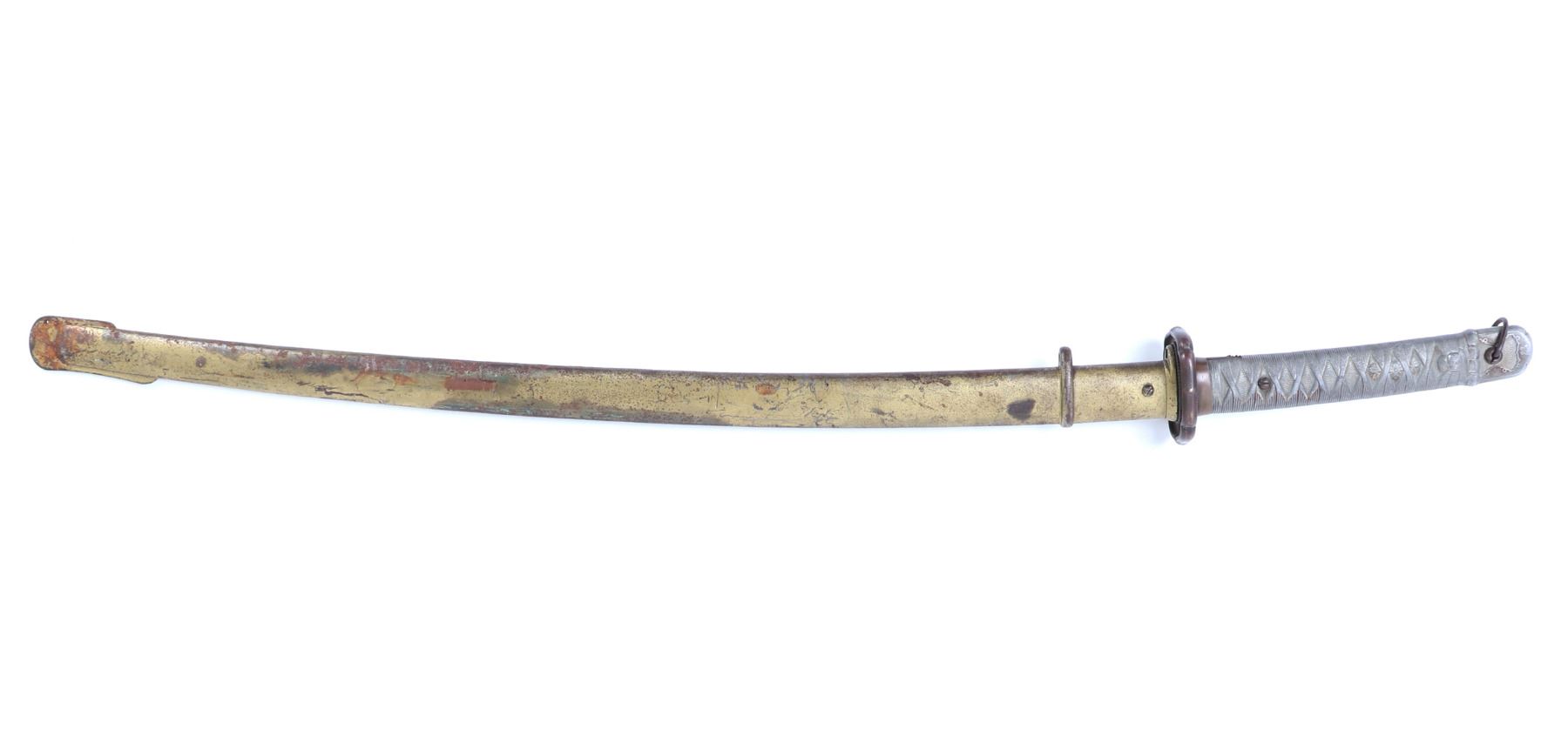 Japanese All-Metal NCO officers sword with scabbard. Full length katana with curved single edge blade and fuller to the top section. Engraved with red highlighted numbers to the top of the fuller (147694). Tsuba thick metal casting in bronze finish. Sleeve to the base of the grip in bronze finish with three marks to one side including an excentric caricature. All-metal faux wrapped grip in zinc metal. Scabbard in all metal with gilt painted finish. Size 38 1/4" L, Blade 27 3/8" L. Condition: wear to finish overall with a slight discoloration to the top of the blade. Wear as shown to blade and scabbard. Provenance: Ex-Los Angeles Estate