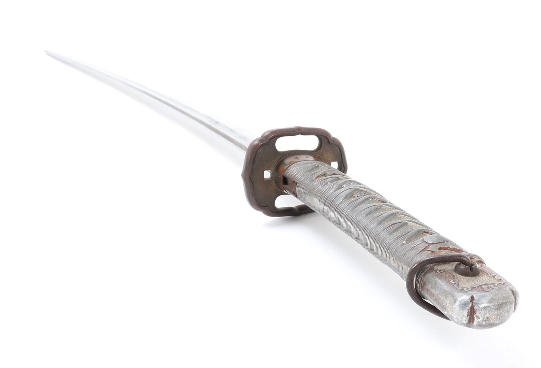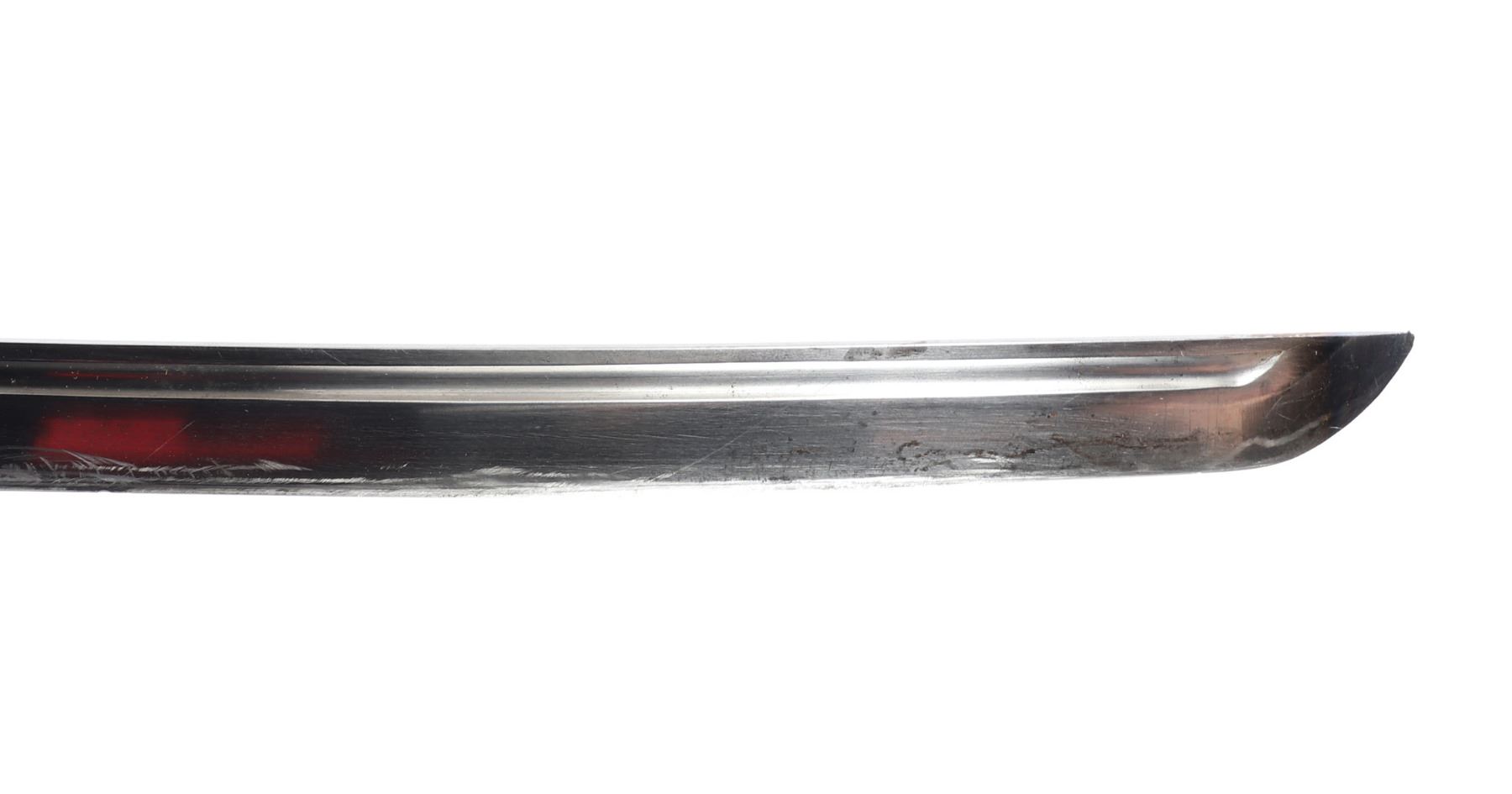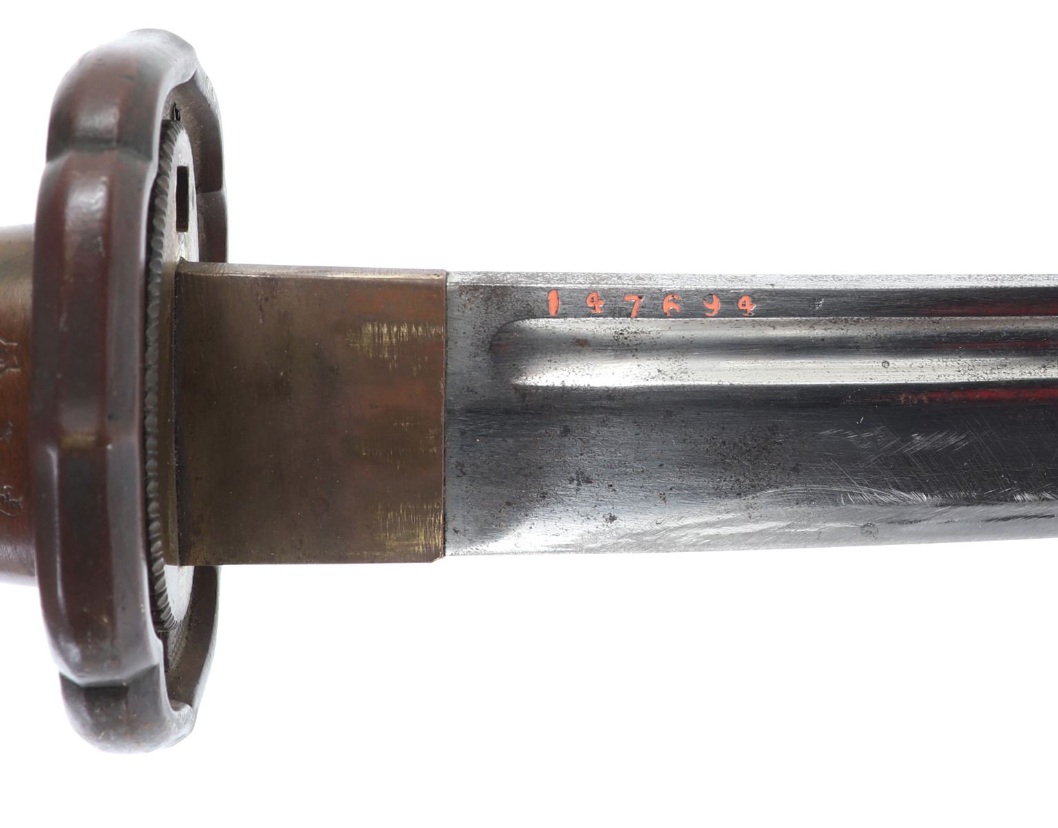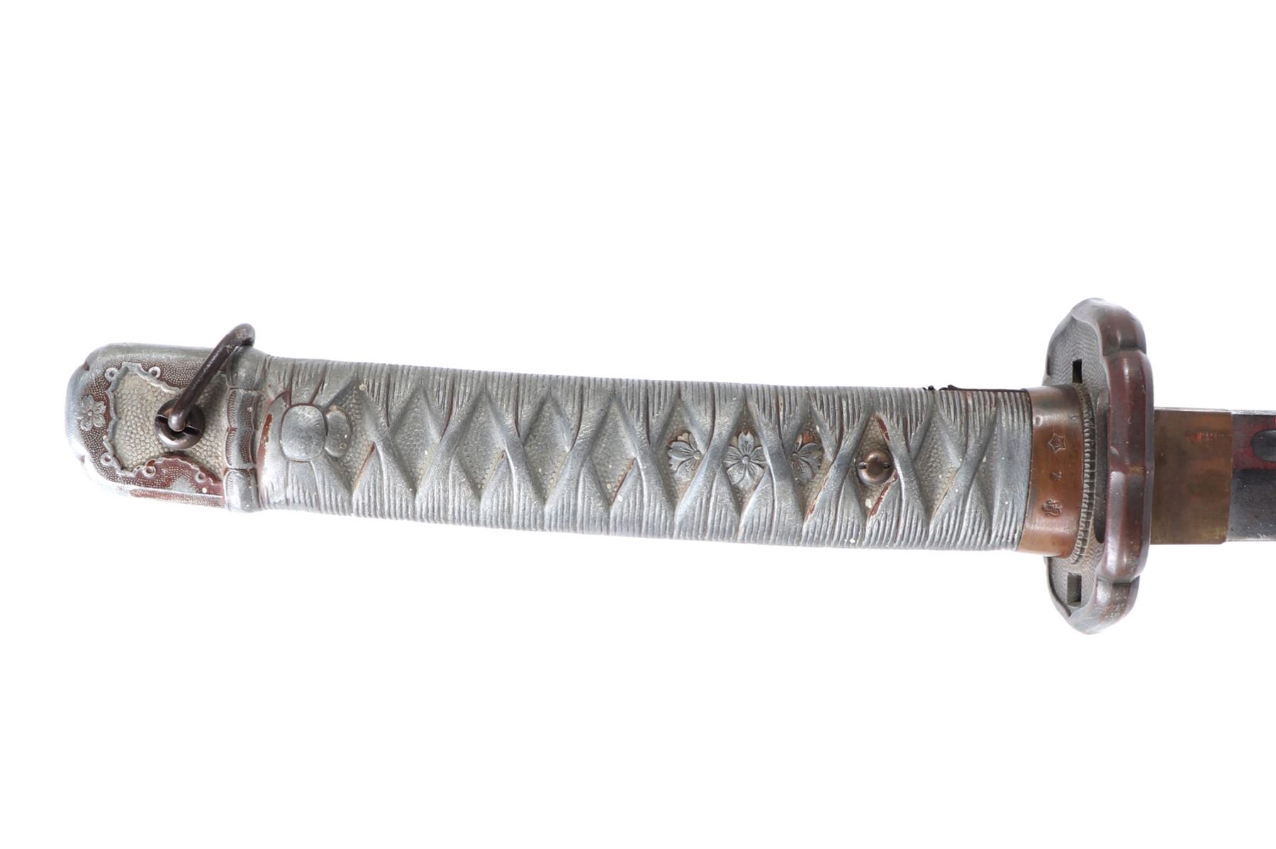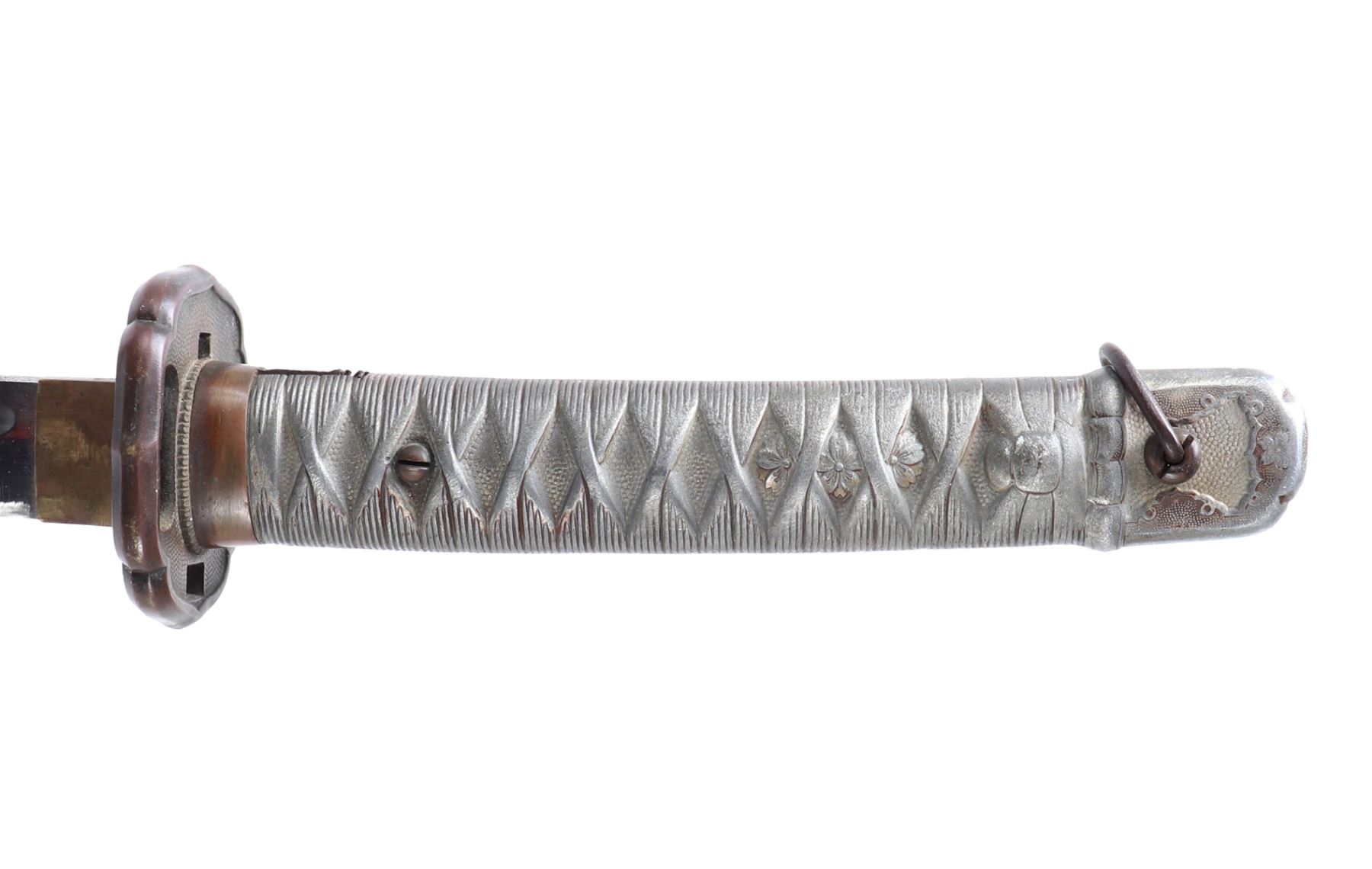 Japanese All-Metal NCO officers sword with scabbard. Full length katana with curved single edge blade and fuller to the top section. Engraved with red highlighted numbers to the top of the fuller (147694). Tsuba thick metal casting in bronze finish. Sleeve to the base of the grip in bronze finish with three marks to one side including an excentric caricature. All-metal faux wrapped grip in zinc metal. Scabbard in all metal with gilt painted finish. Size 38 1/4" L, Blade 27 3/8" L. Condition: wear to finish overall with a slight discoloration to the top of the blade. Wear as shown to blade and scabbard. Provenance: Ex-Los Angeles Estate